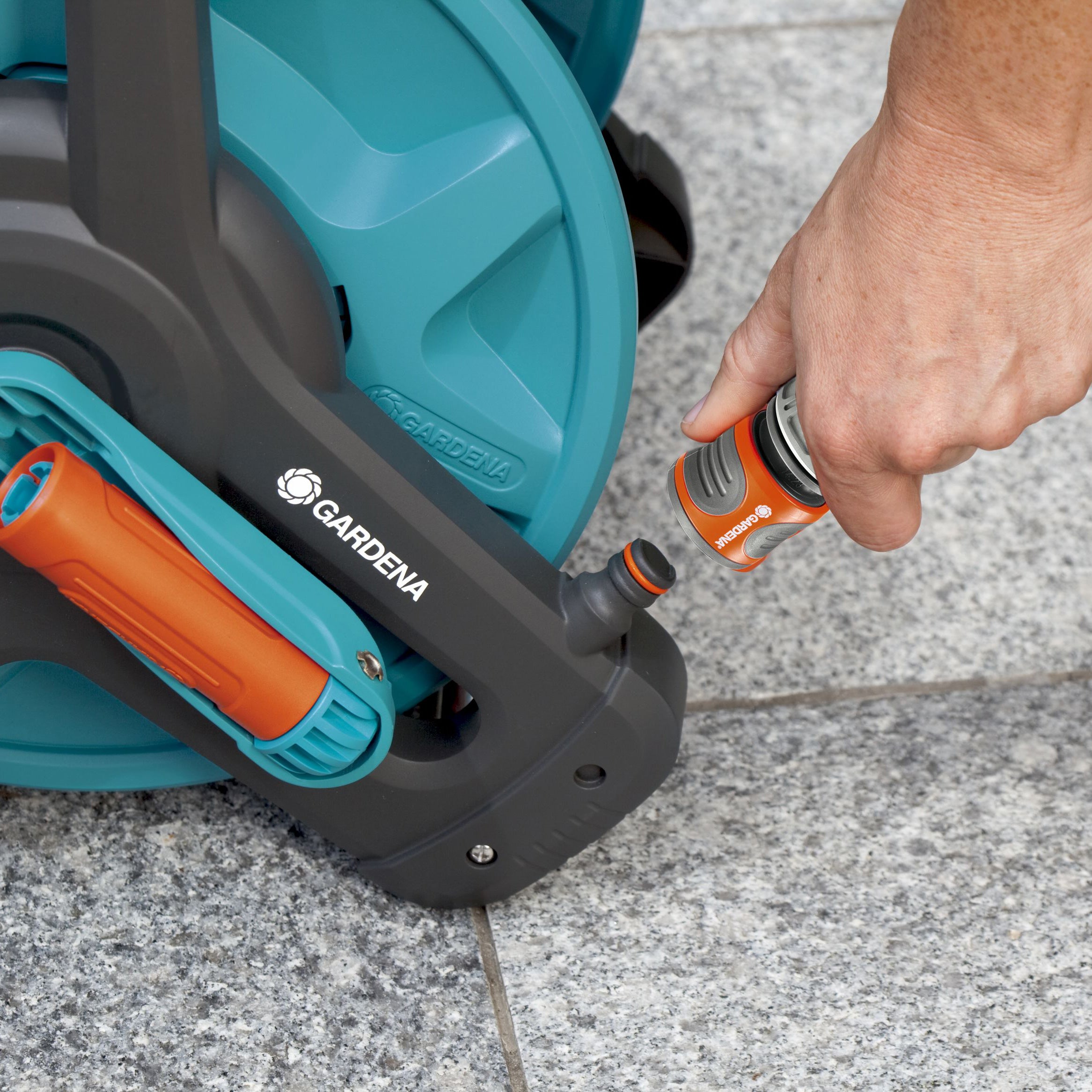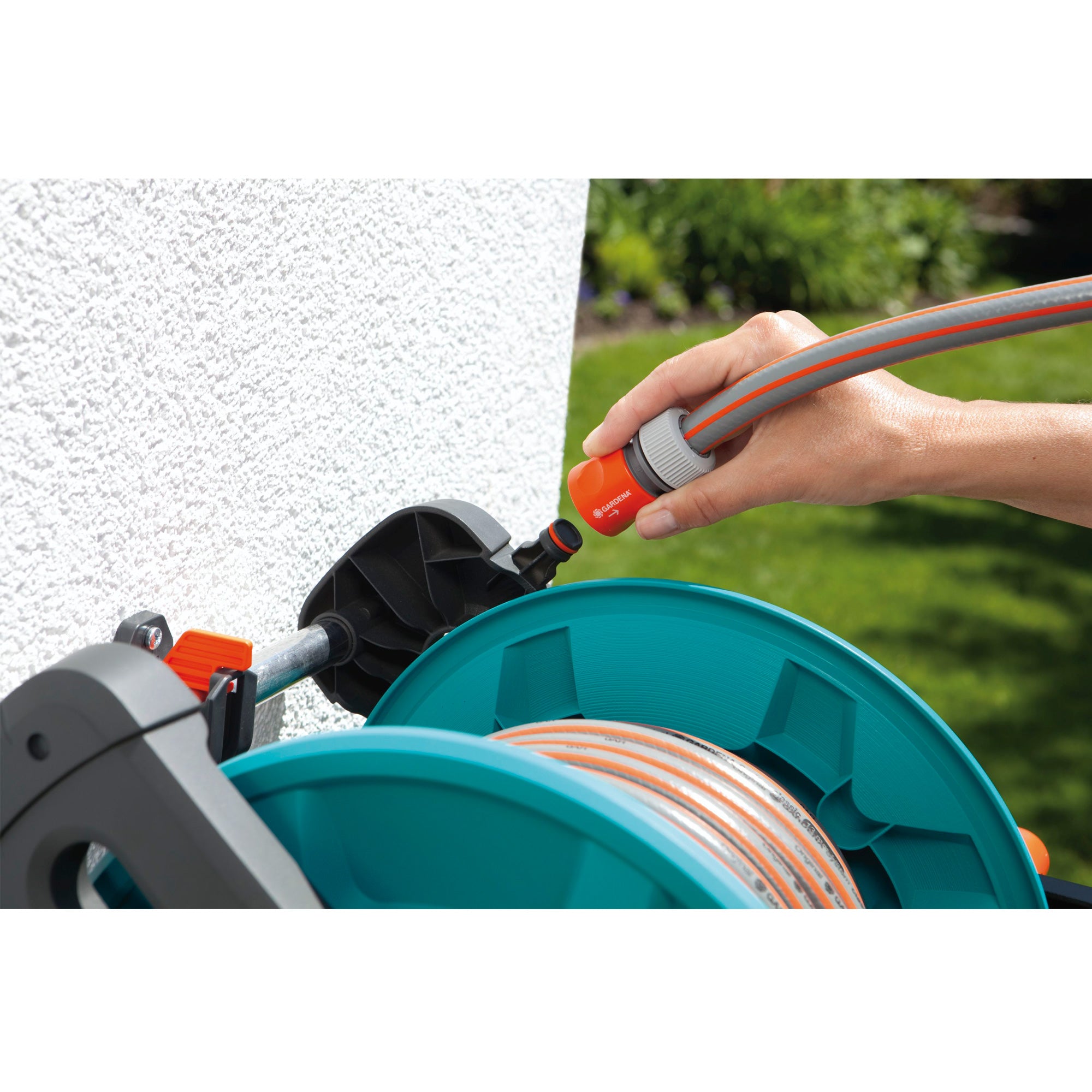 Gemakkelijk op- en afrollen De houder beschikt over een vrijlopende handzwengel voor het gemakkelijk op- en afrollen van de tuinslang. Klap de zwengel in voor plaatsbesparend opbergen. De draaiende, gelagerde aansluitas voorkomt meedraaien van de aansluitslang bij het op- en afrollen. Om een goede watertoevoer te garanderen, is het slangstuk afgerond, waardoor de meegeleverde tuinslang niet kan knikken. De meedraaiende aansluitas op de wandslangenhouder 50 Classic voorkomt verdraaien van de slang bij het op- en afrollen.