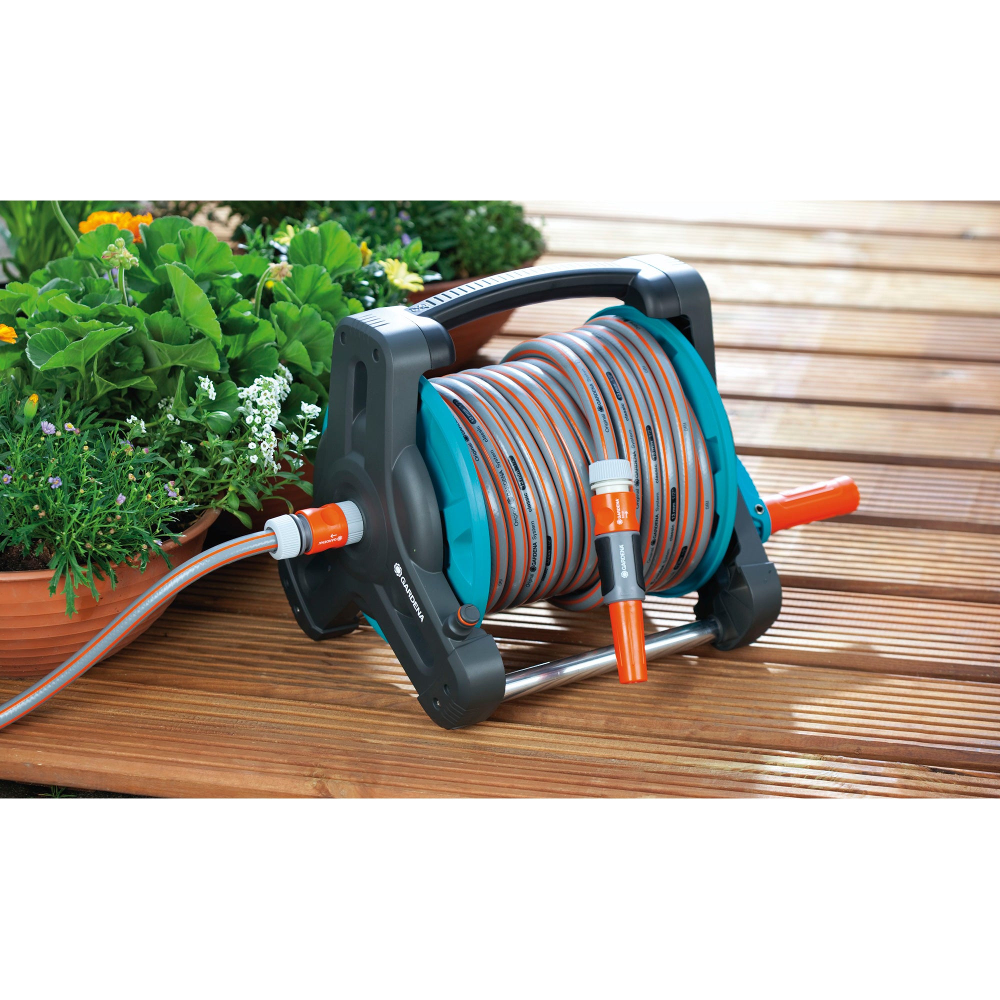 De slanghouder is door zijn lichte gewicht eenvoudig te vervoeren. De set is compleet gemonteerd en omvat een slanghouder, 10 meter slang en alle benodigde Gardena aansluitstukken (drie slangstukken, kraanstuk, waterstop, adapter en tuinspuit). De slanghaspel is erfect voor de kleinere tuinen en terrassen. Met de vrijlopende zwengel is deze slanghouder eenvoudig te bedienen. De zwengel is tevens in te klappen zodat je de haspel compact op kan bergen. Een stabiele en zeer handige slanghouder!