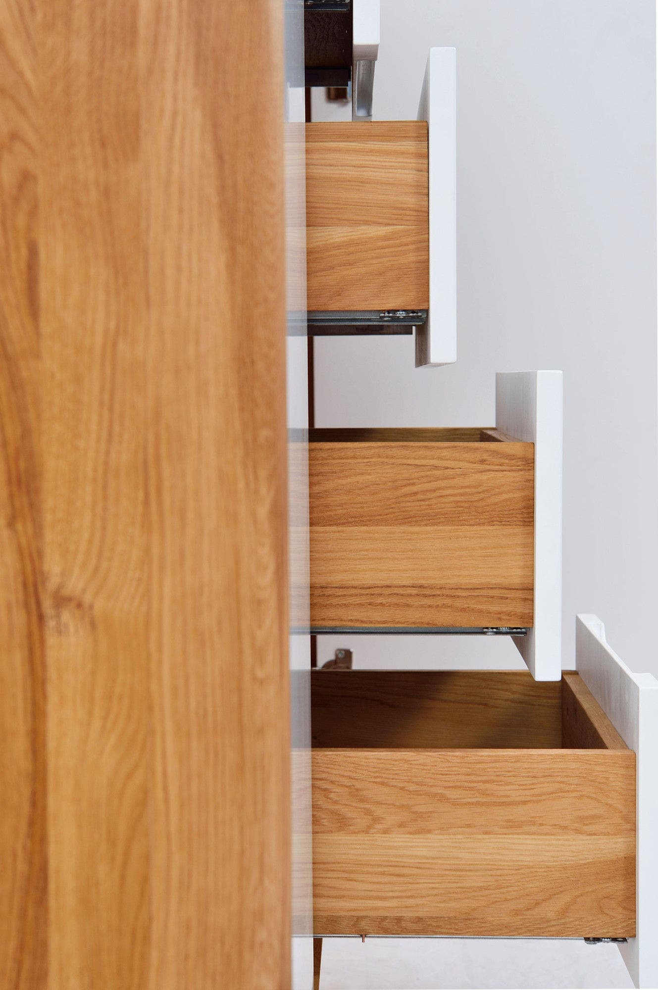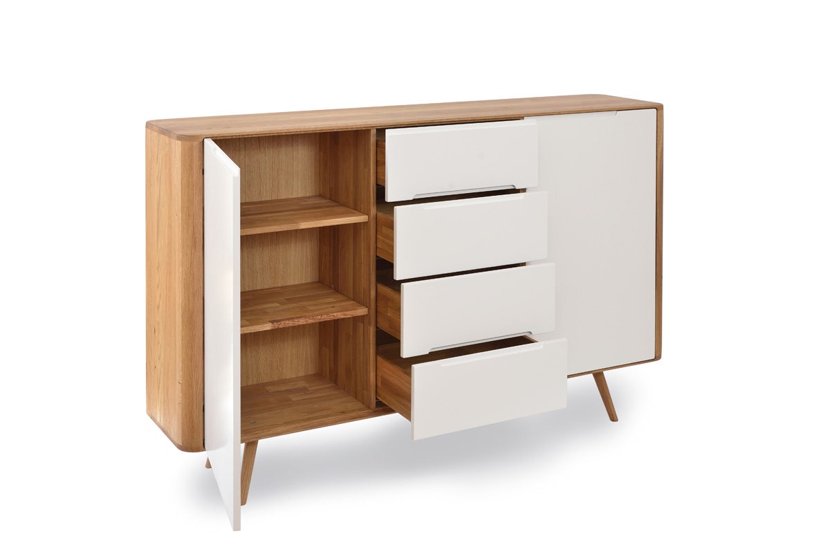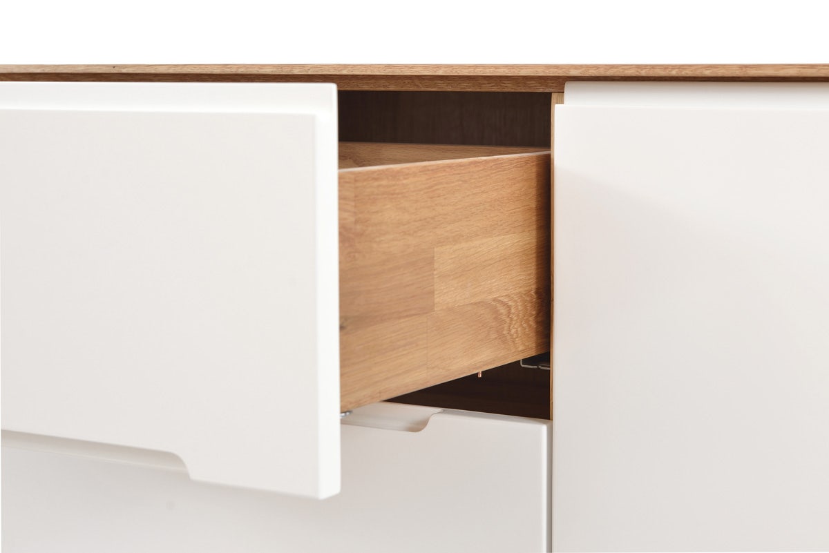 Door de combinatie van het eikenhout met de witte lades, krijgt deze opbergkast een retro jaren ’50 look. De Ena Dresser Two is een massief eikenhouten opbergkast met vier lades en twee deurtjes. Achter de deurtjes zitten aan beide kanten twee planken. Deze witte lades en deurtjes hebben het soft-close systeem. Dit zorgt ervoor dat de lades en deurtjes geleidelijk sluiten. Door de vele opbergruimtes, geruisloze lades en perfecte hoogte van 110 cm is deze kast tevens te gebruiken als commode.
