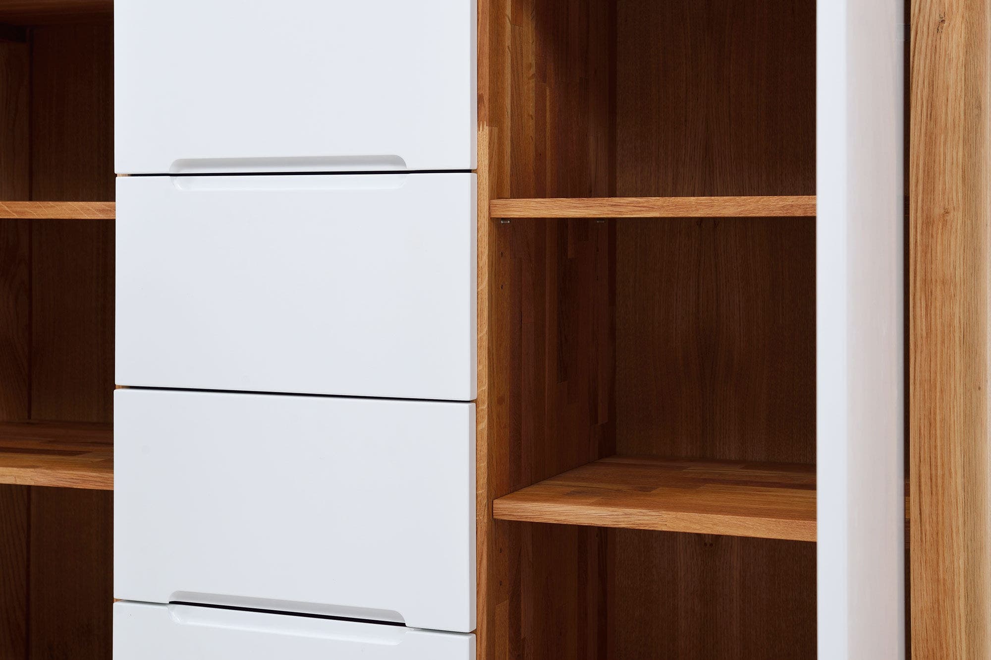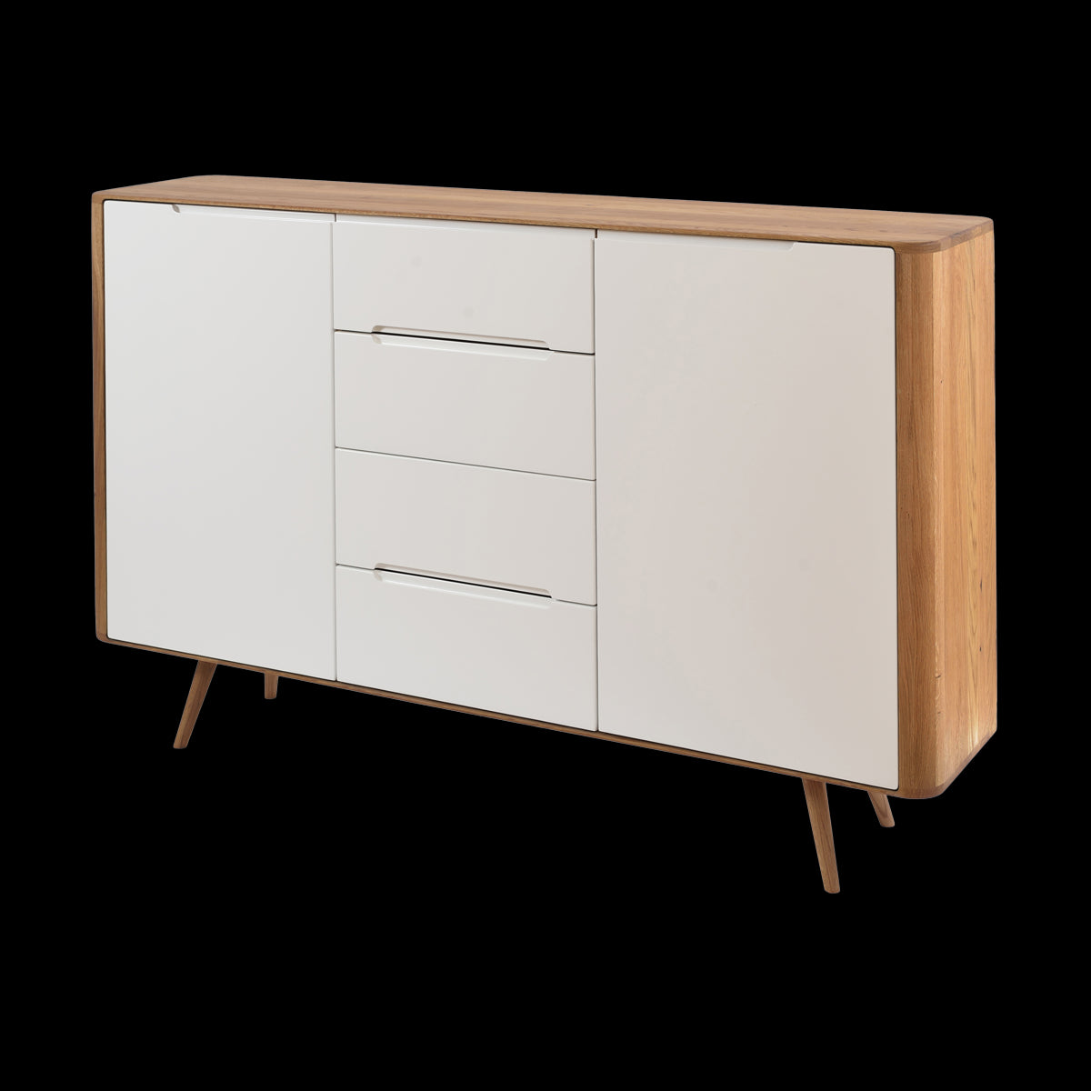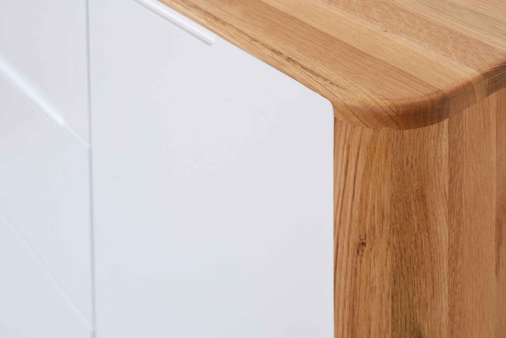 Door de combinatie van het eikenhout met de witte lades, krijgt deze opbergkast een retro jaren ’50 look. De Ena Dresser Two is een massief eikenhouten opbergkast met vier lades en twee deurtjes. Achter de deurtjes zitten aan beide kanten twee planken. Deze witte lades en deurtjes hebben het soft-close systeem. Dit zorgt ervoor dat de lades en deurtjes geleidelijk sluiten. Door de vele opbergruimtes, geruisloze lades en perfecte hoogte van 110 cm is deze kast tevens te gebruiken als commode.