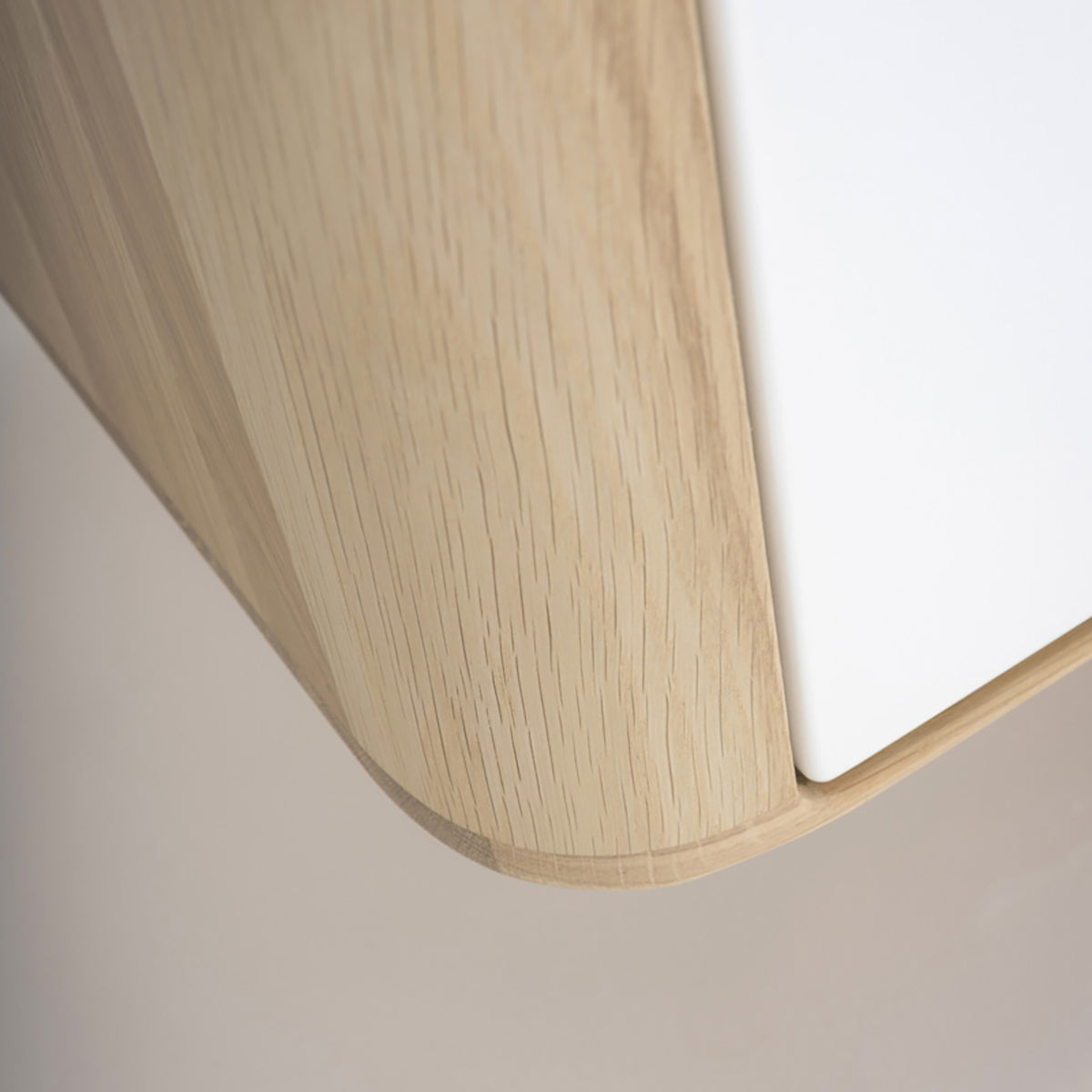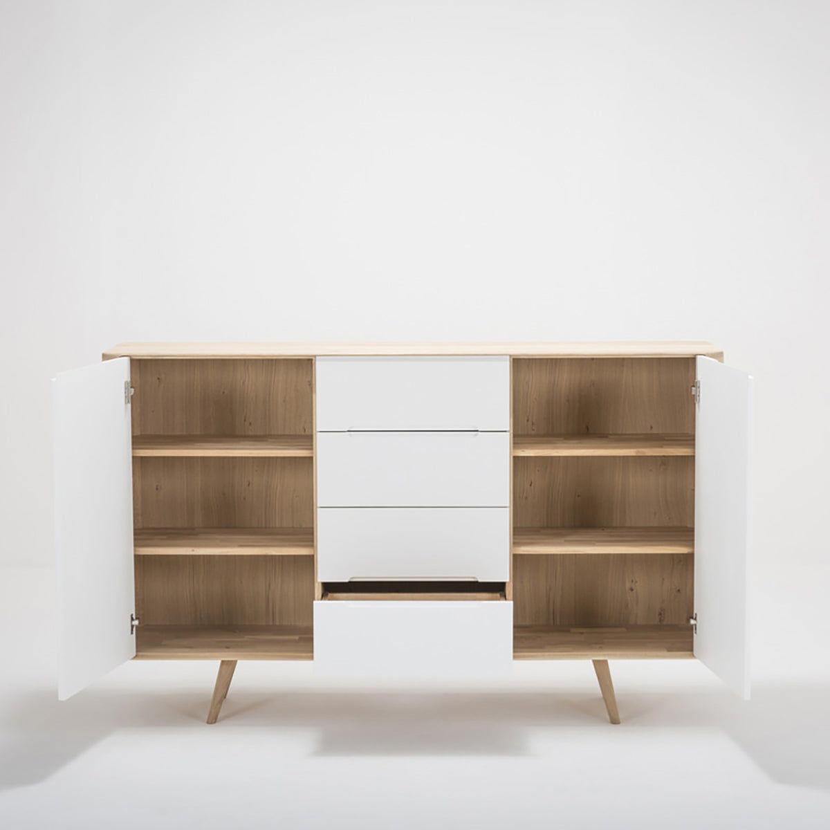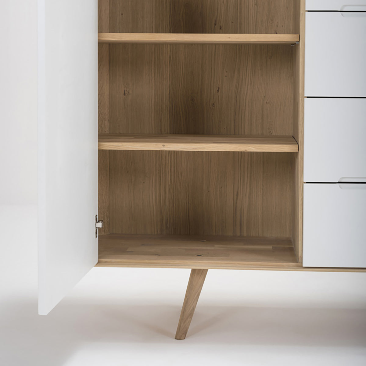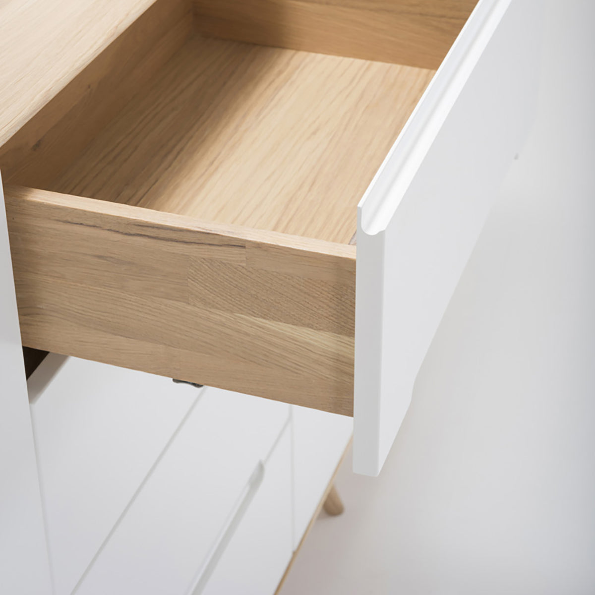 Door de combinatie van het eikenhout met de witte lades, krijgt deze opbergkast een retro jaren ’50 look. De Ena Dresser Two is een massief eikenhouten opbergkast met vier lades en twee deurtjes. Achter de deurtjes zitten aan beide kanten twee planken. Deze witte lades en deurtjes hebben het soft-close systeem. Dit zorgt ervoor dat de lades en deurtjes geleidelijk sluiten. Door de vele opbergruimtes, geruisloze lades en perfecte hoogte van 110 cm is deze kast tevens te gebruiken als commode.