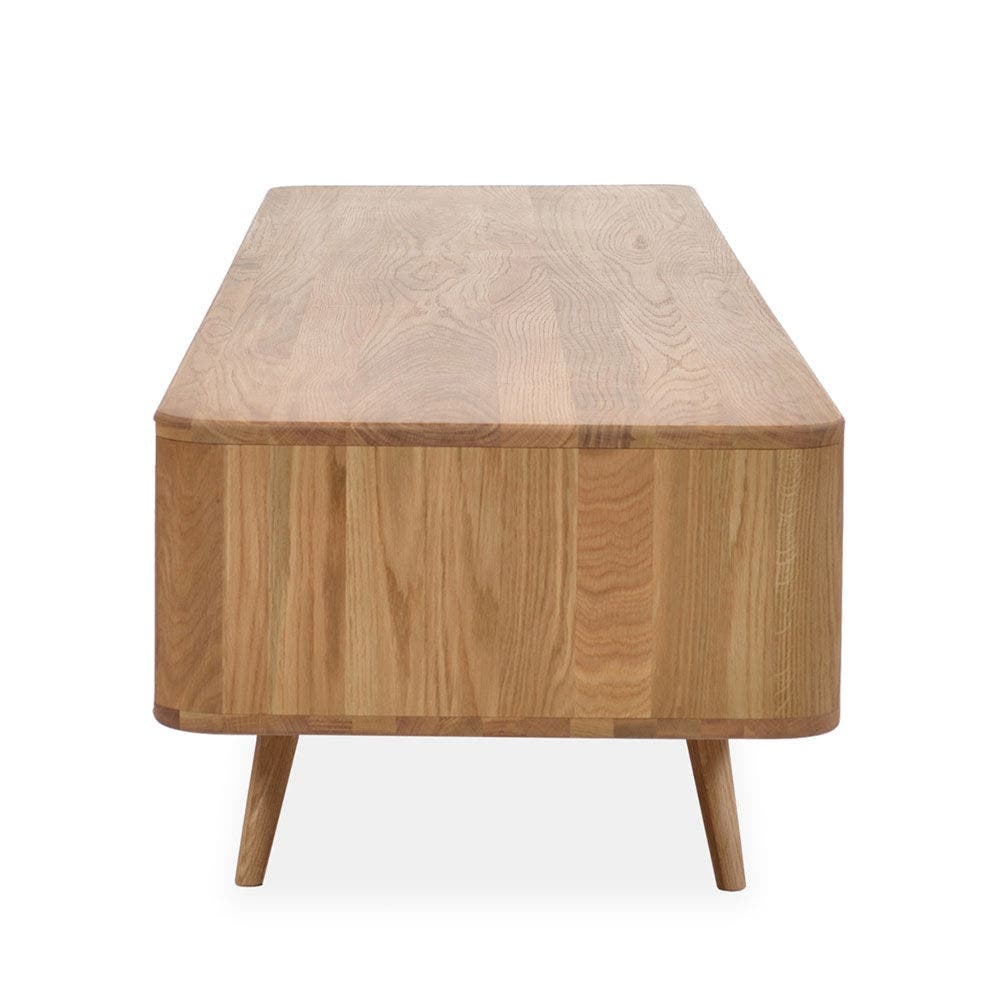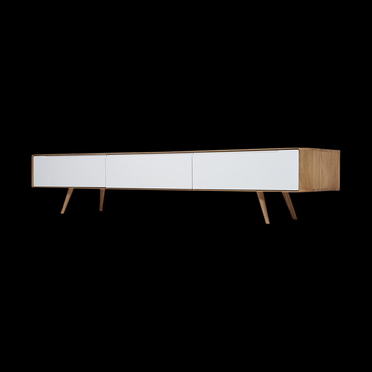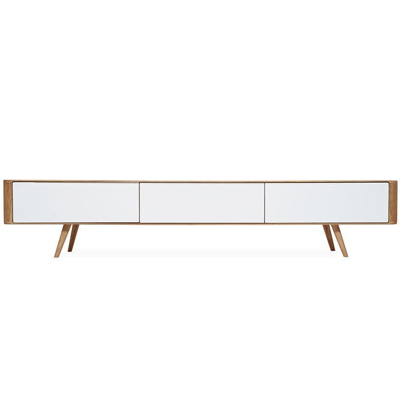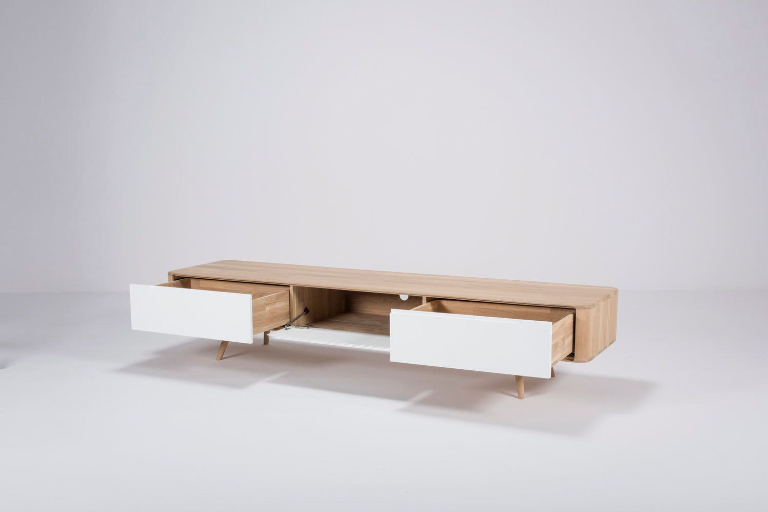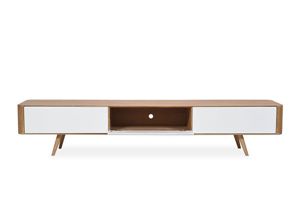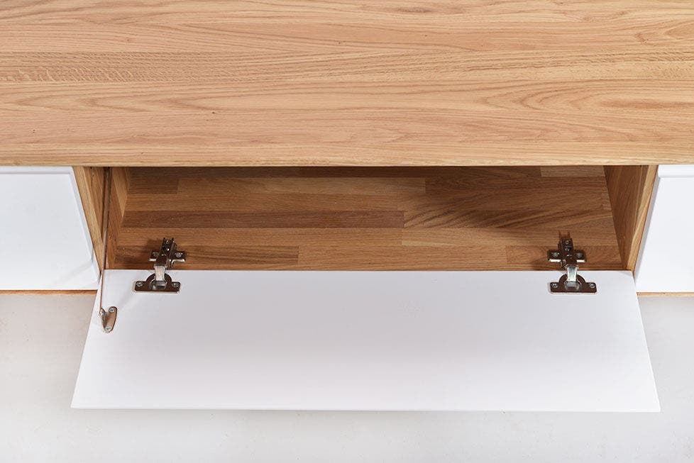De afgeronde hoeken en de witte lades zijn geinspireerd op de jaren 50 en zorgen voor een retro-moderne sfeer in jouw woonkamer. Het massief eikenhouten TV meubel heeft drie vakken. De buitenste vakken hebben lades en het middelste vak heeft een klep. Aan de achterzijde van het TV meubel zit een uitsparing voor de kabeldoorvoer. Dit maakt het TV meubel niet alleen mooi, maar ook heel functioneel.