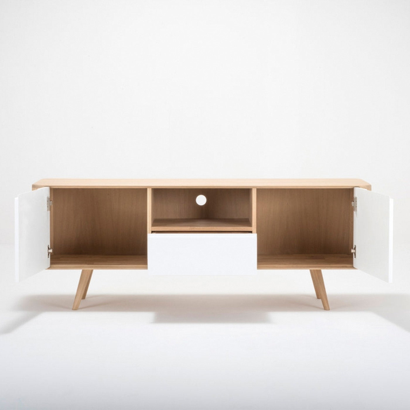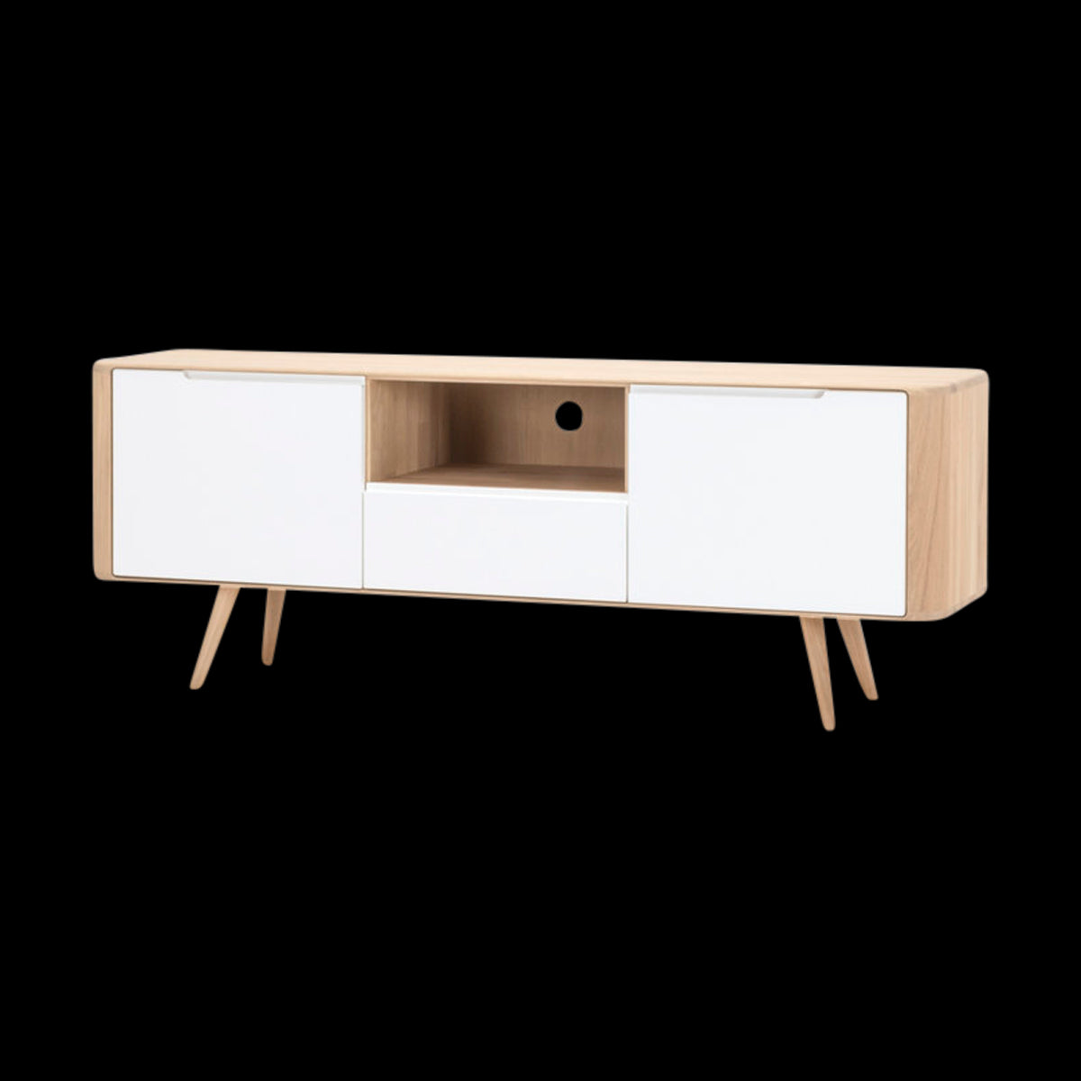 Het Gazzda Ena TV Sideboard Two is een prachtig eikenhouten TV meubel met een retro jaren ’50 look.