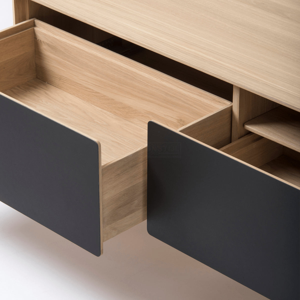 Het prachtig afgewerkte eikenhout met de witte linoleum lades zorgen voor een mooi contrast tussen klassiek en modern. Het eikenhouten dressoir heeft twee lades met soft-close systeem, wat ervoor zorgt dat de lades geleidelijk sluiten. Aan de rechterkant zit een open vak - perfect voor een mediabox die hierdoor met de afstandbediening altijd bereikbaar is. Aan de zijkant van het open vak en de achterzijde van het TV meubel zitten uitsparingen voor de kabeldoorvoer. Dit maakt het TV meubel niet alleen mooi, maar ook heel functioneel.