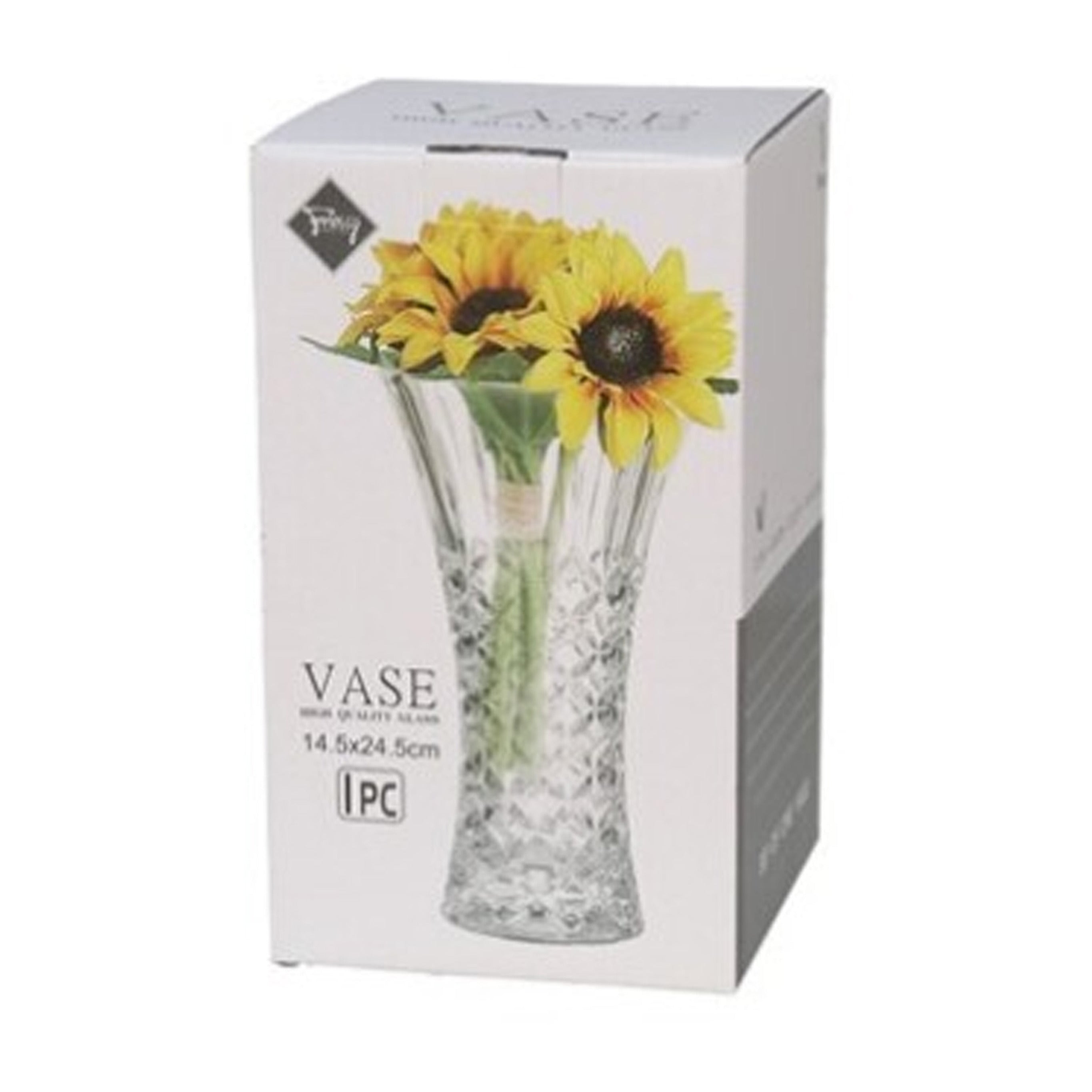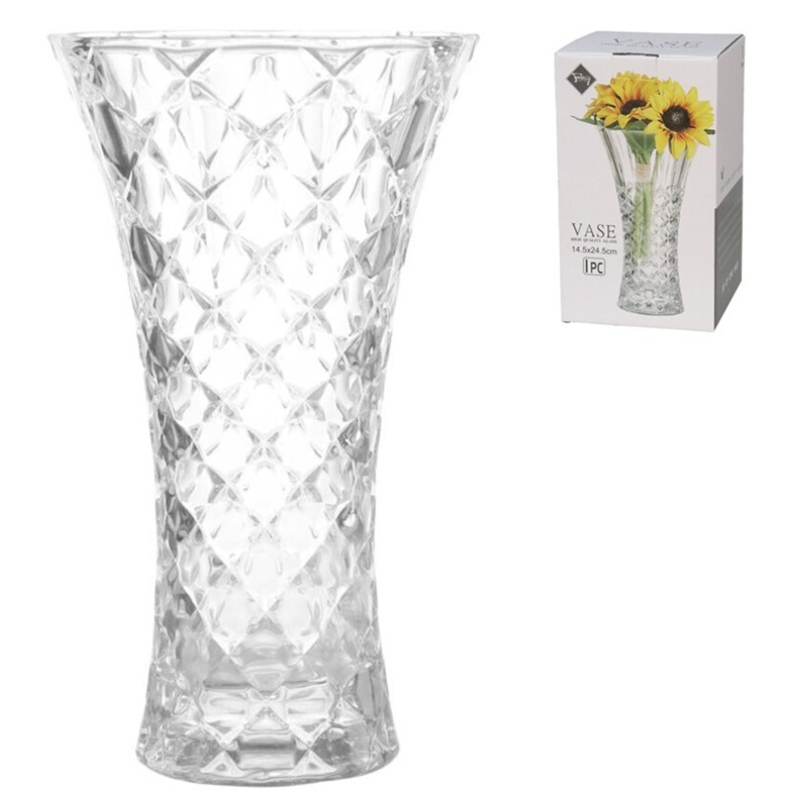 Bloemenvaas helder glas 15 x 25 cm. Naast dat deze glazen vaas geschikt is om losse bloemen, boeketten of takken in te schikken, is deze vaas ook geschikt om met decoratie te vullen. Materiaal: glas. Afmeting: ca. 14.5 x 24.5 cm.