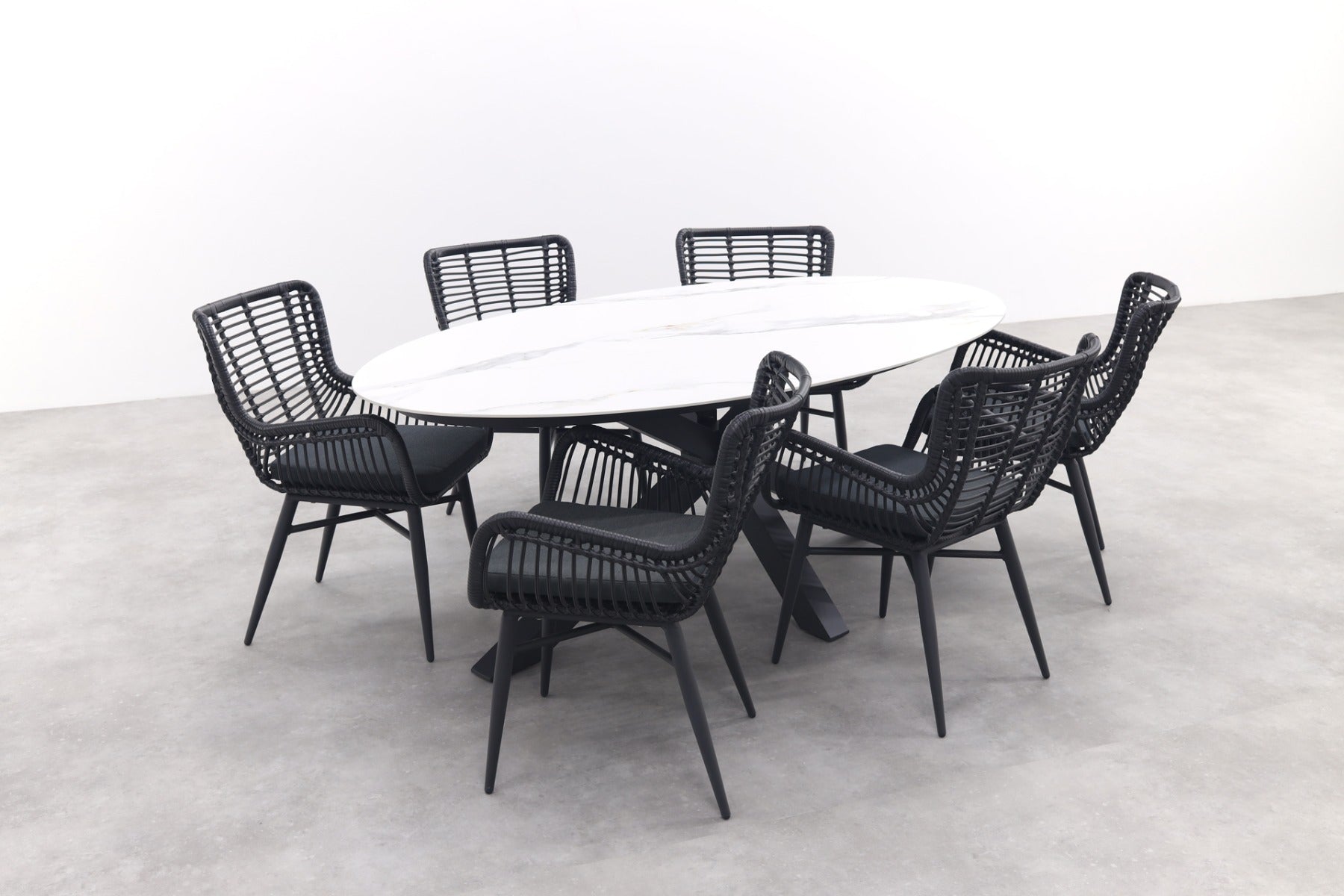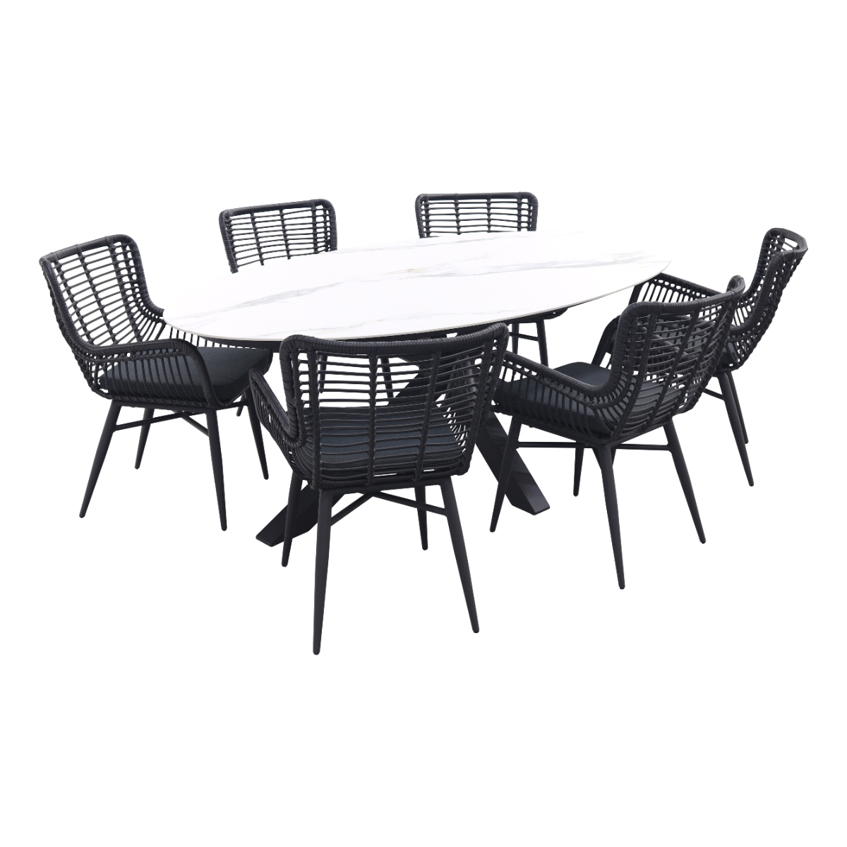 6x tuinstoel Jasmine Black 1x Scotland ovale tuintafel 220x115 cm.- marmerlook wit