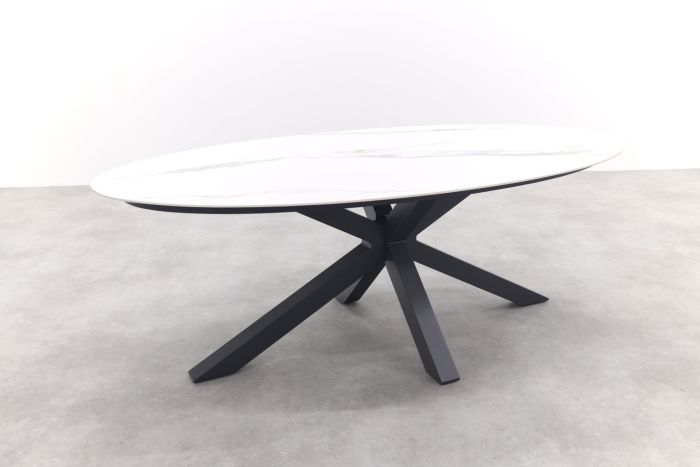 De Scotland ovale tuintafel met marmerlook in het wit is gemaakt van het nieuwe materiaal Centostone. Dit materiaal vertoont vergelijkbare eigenschappen als keramiek. Alleen onderscheidt Centostone zich door zijn compactheid, waardoor het harder en steviger is. De buitengewone hardheid van Centostone maakt het bestand tegen krassen en hitte, terwijl het ook geen vocht absorbeert, waardoor zorgen over kringen en vlekken tot het verleden behoren. Dit materiaal is niet alleen gemakkelijk te onderhouden, maar bestaat ook grotendeels uit natuurlijke elementen, wat het een bewuste en duurzame keuze maakt. Het witte marmerlook tafelblad wordt gecombineerd met een frame van antraciet aluminium. Een aluminium kruispootframe biedt verschillende voordelen, zoals lichtheid, onderhoudsgemak, weerbestendigheid, roestbestendigheid, tijdloosheid en een lange levensduur. Met de ruime afmetingen van 220x115 cm. kun je met een gezelschap van 6 personen genieten van het buitenleven.