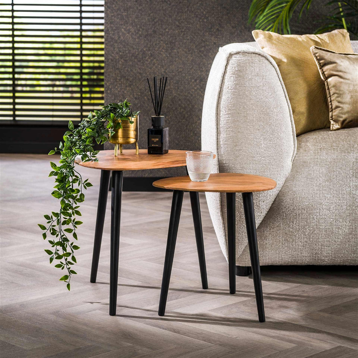 Materiaal: Deze bijzettafels zijn gemaakt van acaciahout voor het tafelblad en metaal voor het onderstel. Acaciahout staat bekend om zijn duurzaamheid en unieke houtstructuur, terwijl het metalen onderstel zorgt voor een stevige basis en een modern contrast.