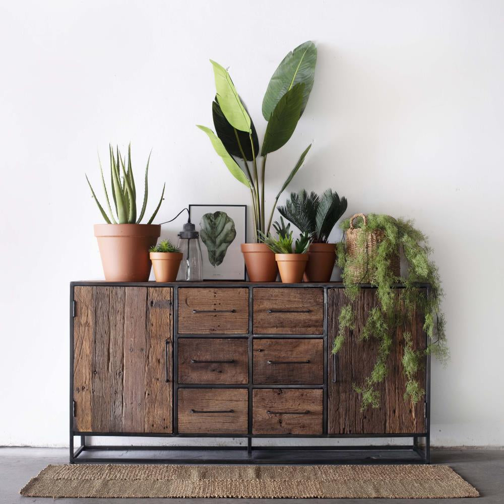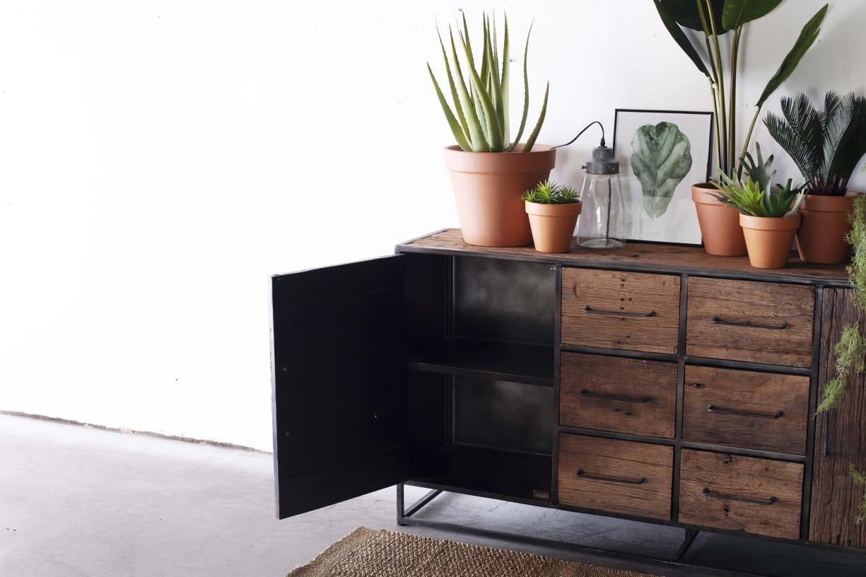Materiaal: Het dressoir is gemaakt van gerecycled hout en metaal, wat zorgt voor een stevige en duurzame constructie. Het gebruik van gerecycled materiaal draagt bovendien bij aan een milieuvriendelijke keuze.