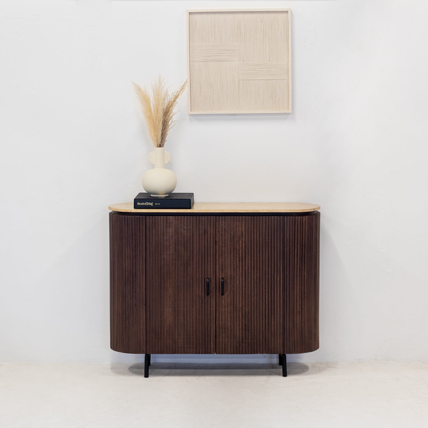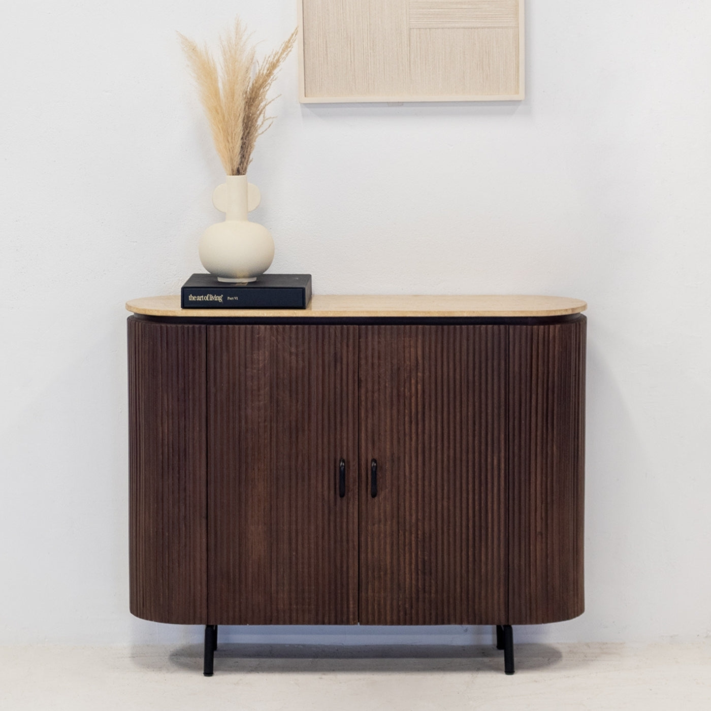 Met zijn compacte afmetingen past dit dressoir moeiteloos in diverse ruimtes, zonder in te boeten aan stijl of functionaliteit.