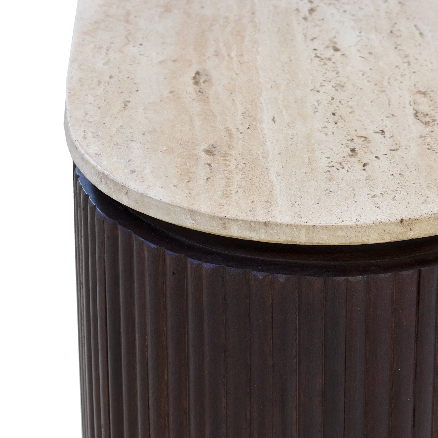 Materiaal: Dit product is zorgvuldig samengesteld uit mangohout en metaal, met een bijzondere afwerking in travertin. Deze materialen zorgen voor een stevige constructie en een unieke uitstraling.