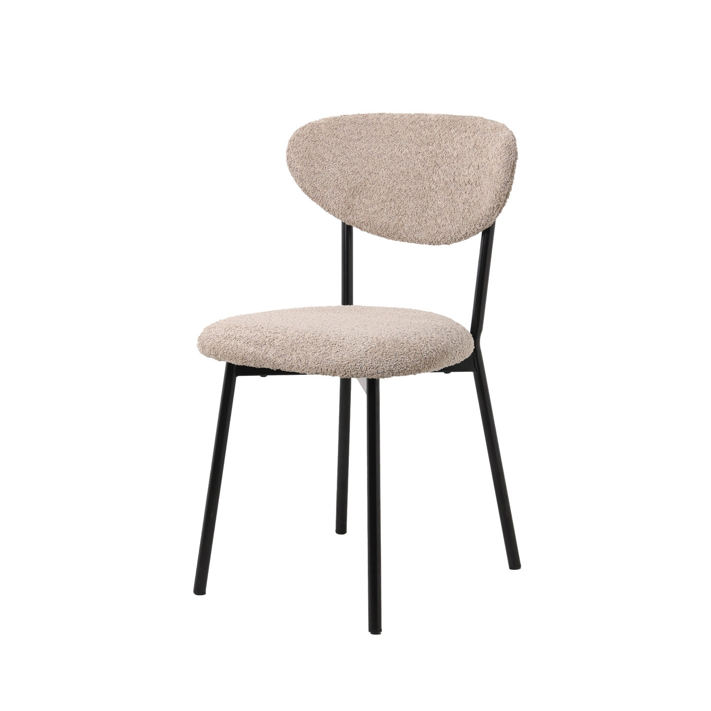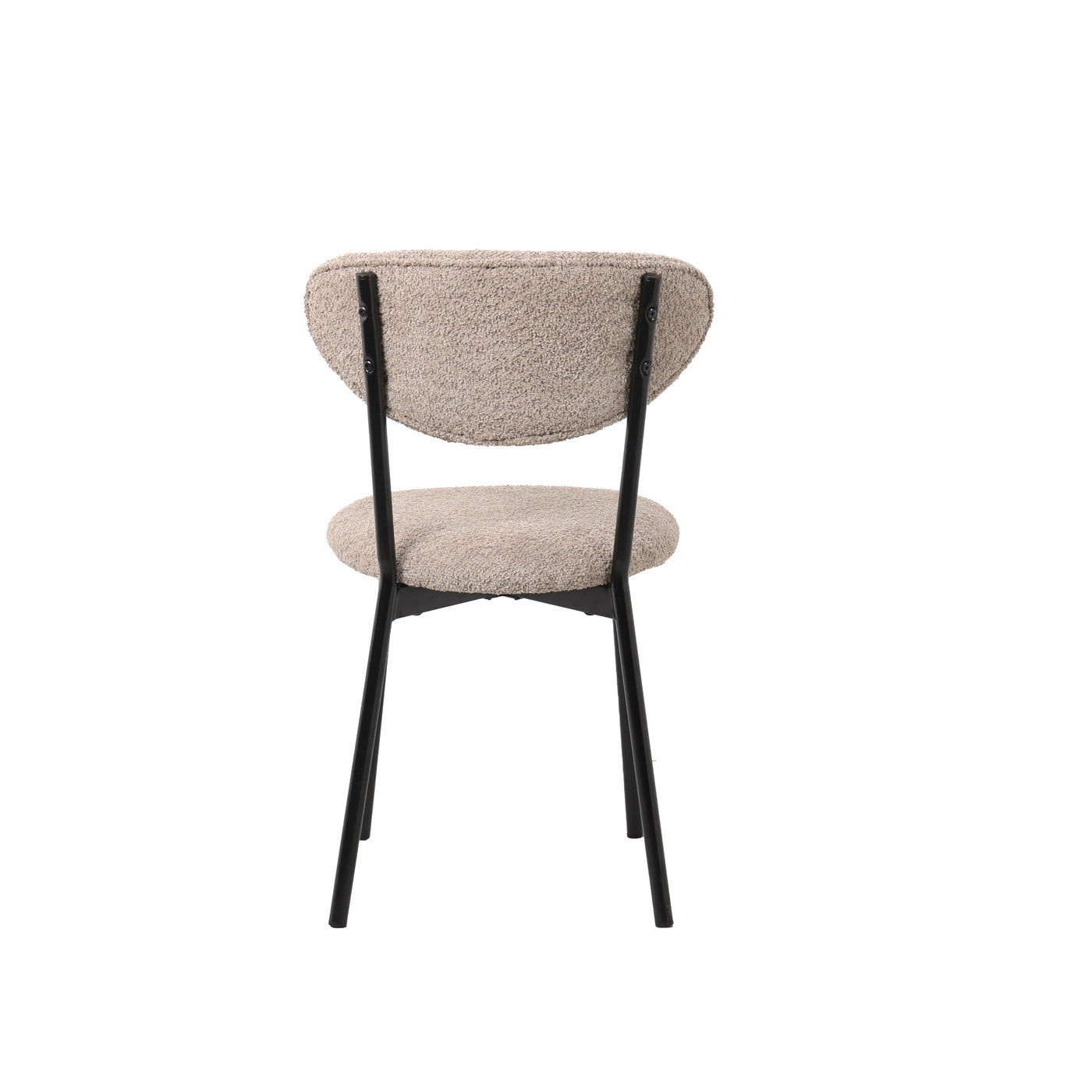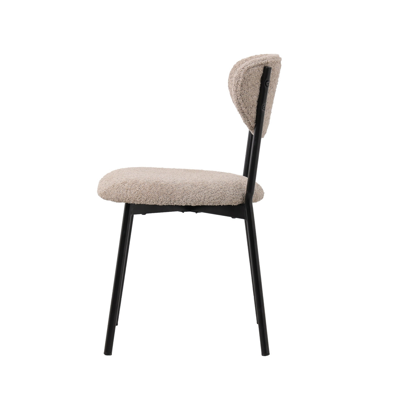 Materiaal: De zitting van de stoelen is vervaardigd uit hoogwaardige bouclé stof, bekend om zijn comfort en duurzaamheid. Het metalen frame zorgt voor een stevige ondersteuning.