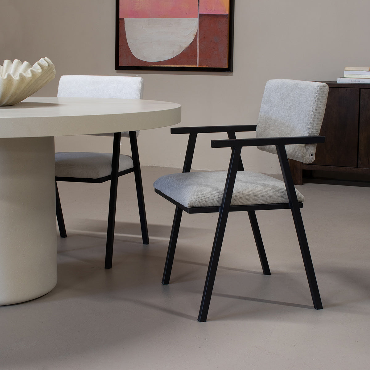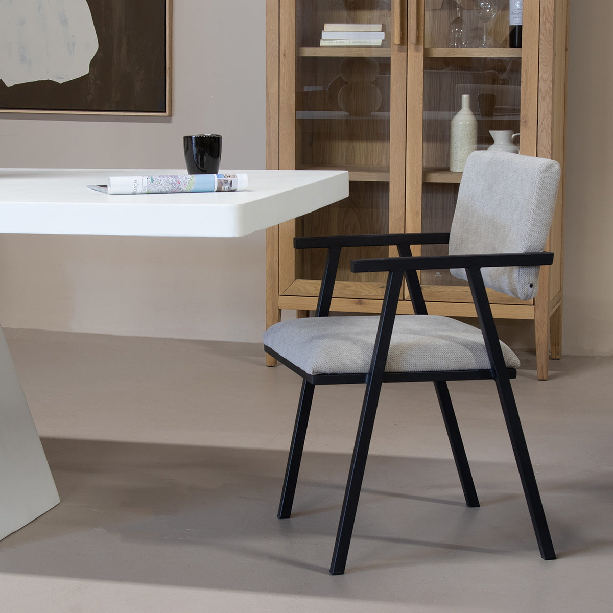 Materiaal: De zitting van de Eetkamerstoel Linn is gemaakt van stof/textiel, wat zorgt voor een zachte en aangename zitervaring. Dit materiaal is duurzaam en gemakkelijk te onderhouden, waardoor de stoel ideaal is voor dagelijks gebruik.