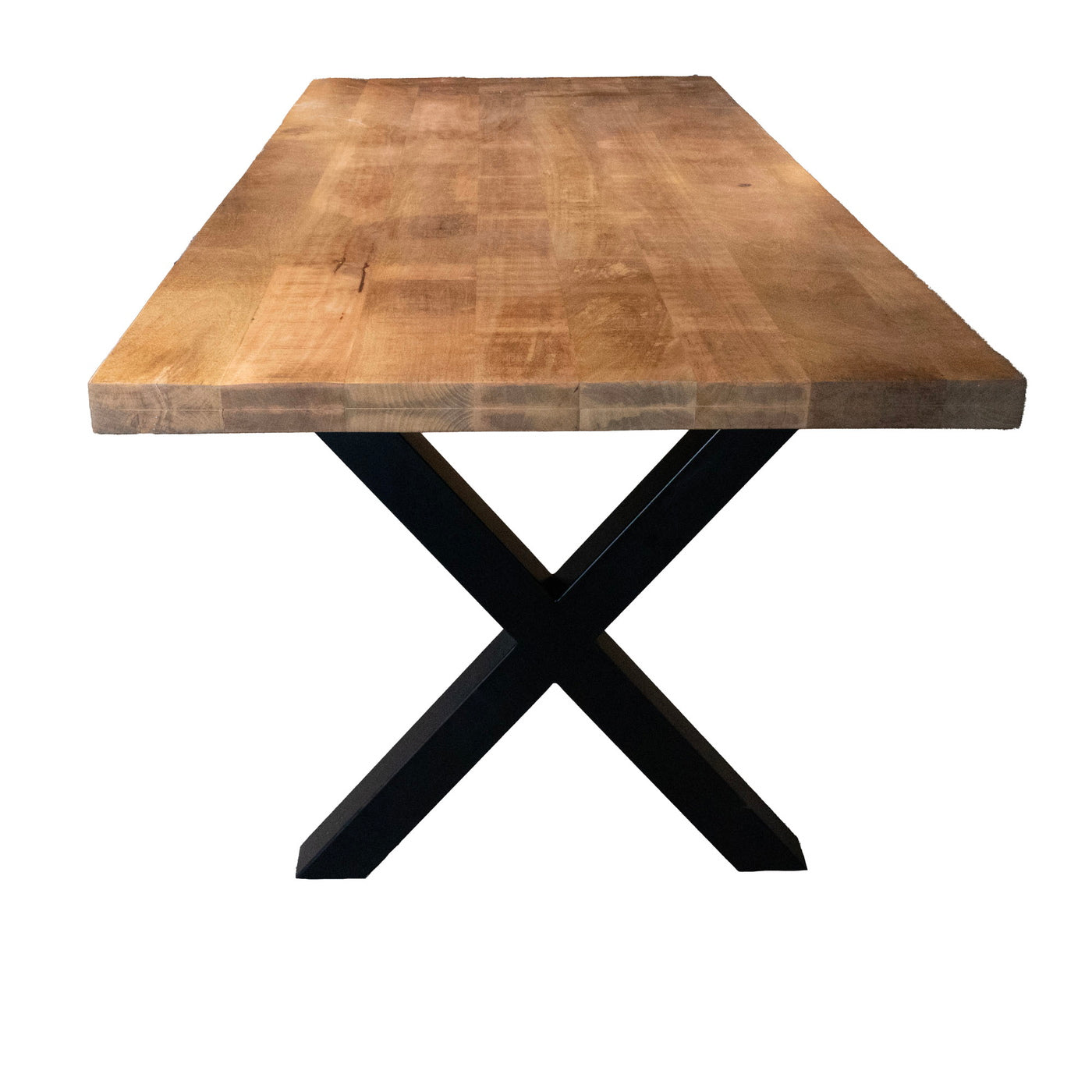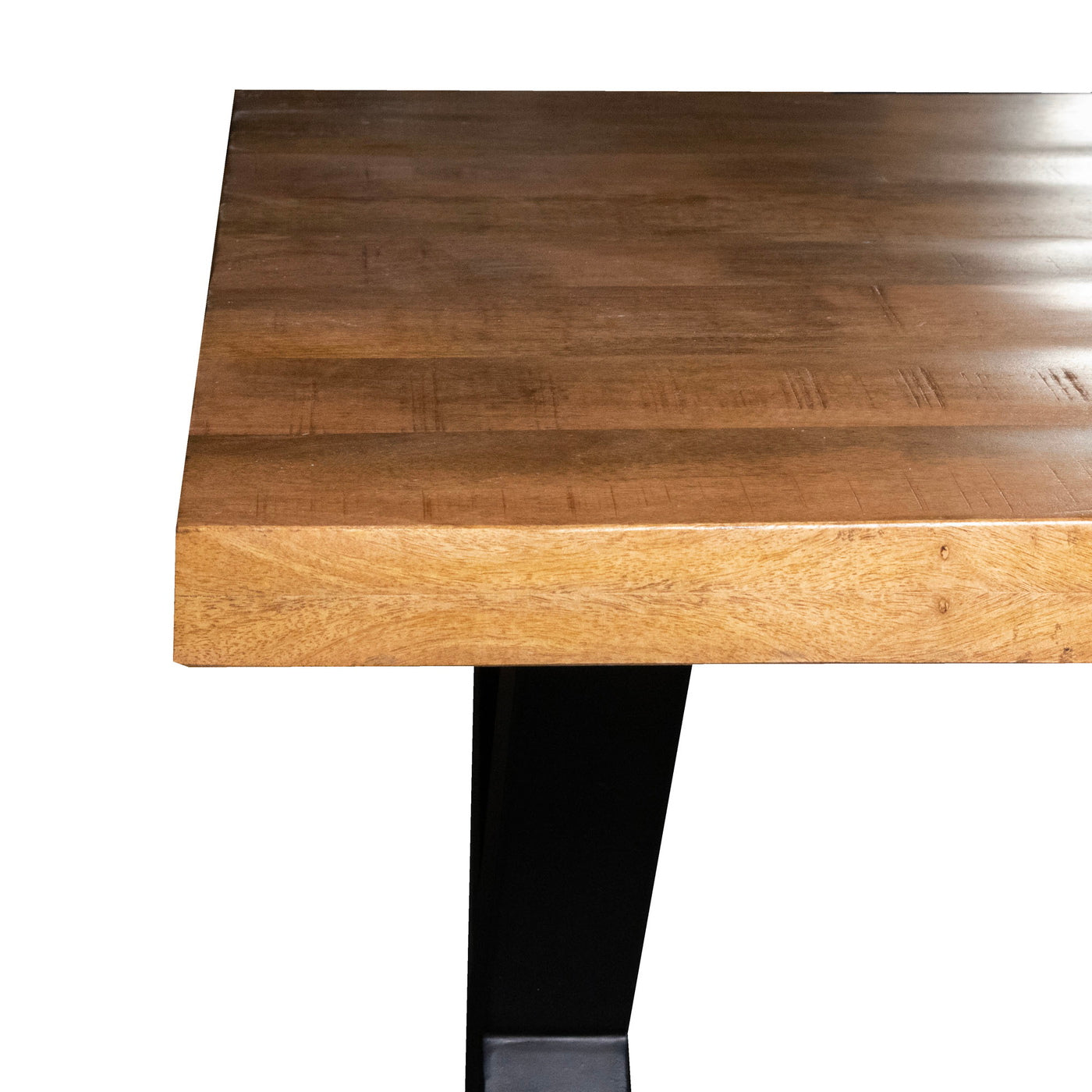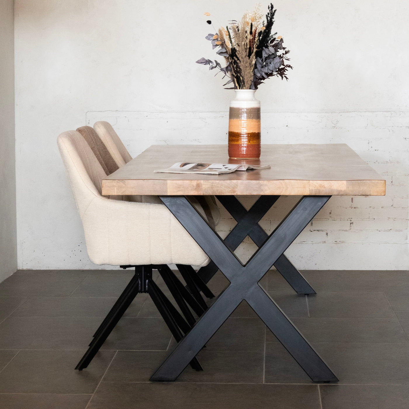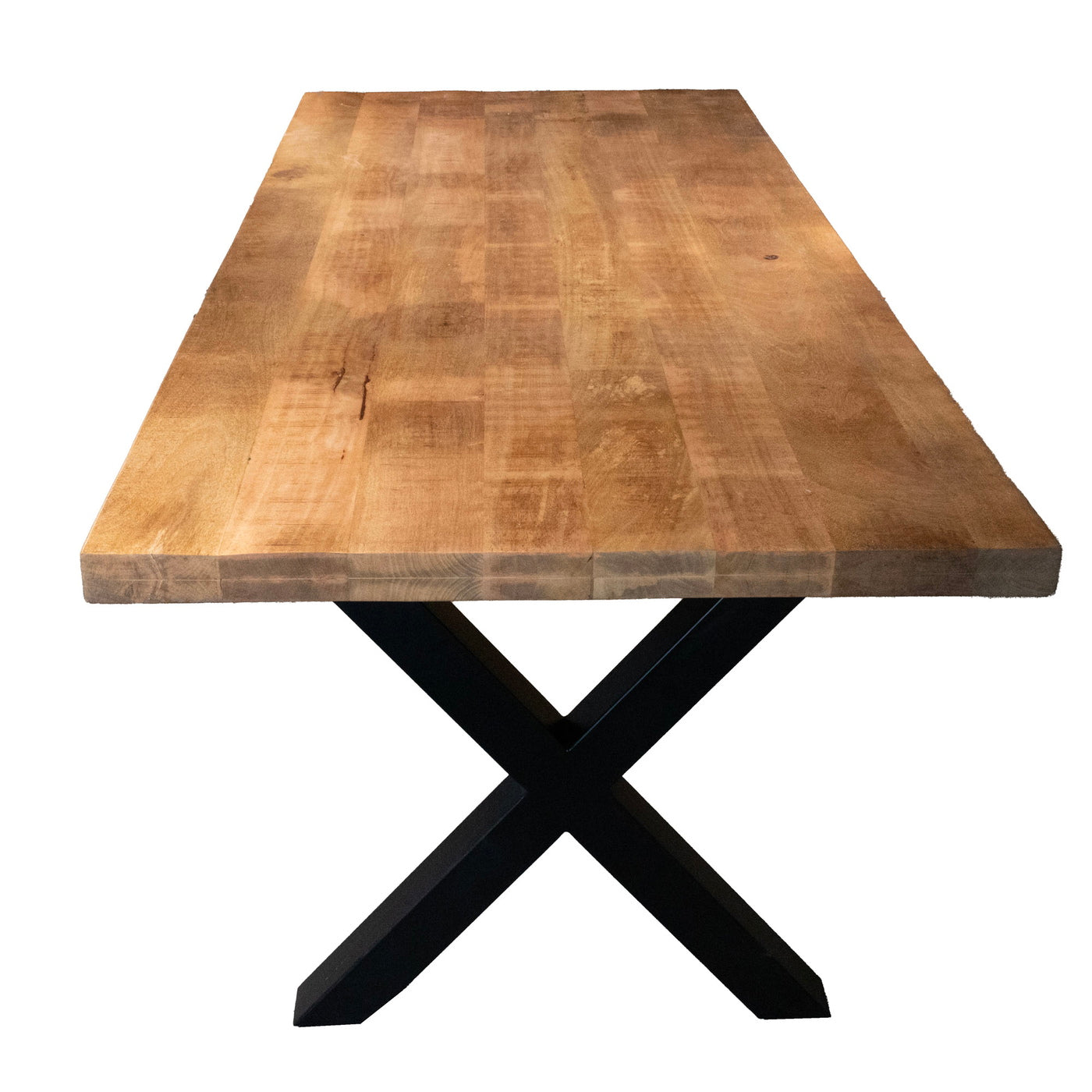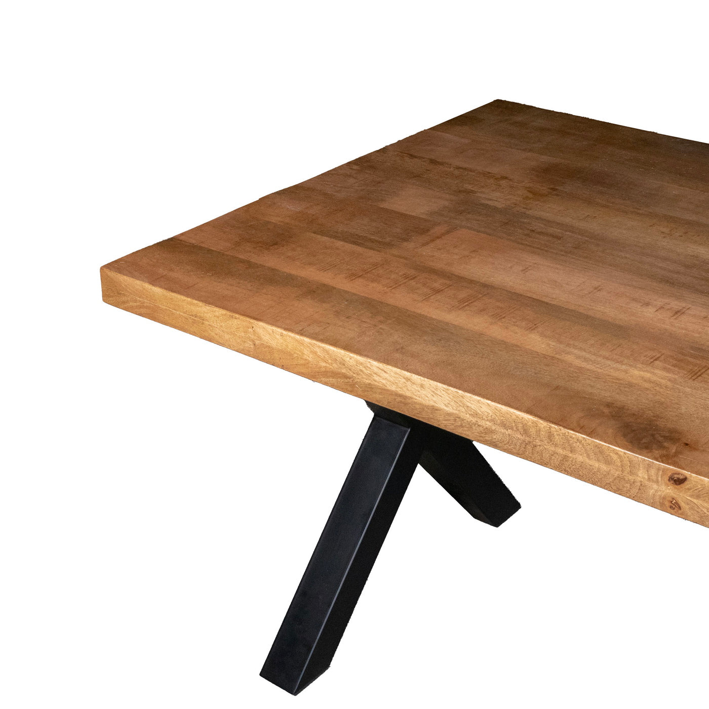 Materiaal: Het tafelblad van mangohout, gekend voor zijn duurzaamheid en unieke textuur, rust op een stevig metalen onderstel. Deze combinatie zorgt voor een tafel die zowel sterk als stijlvol is.