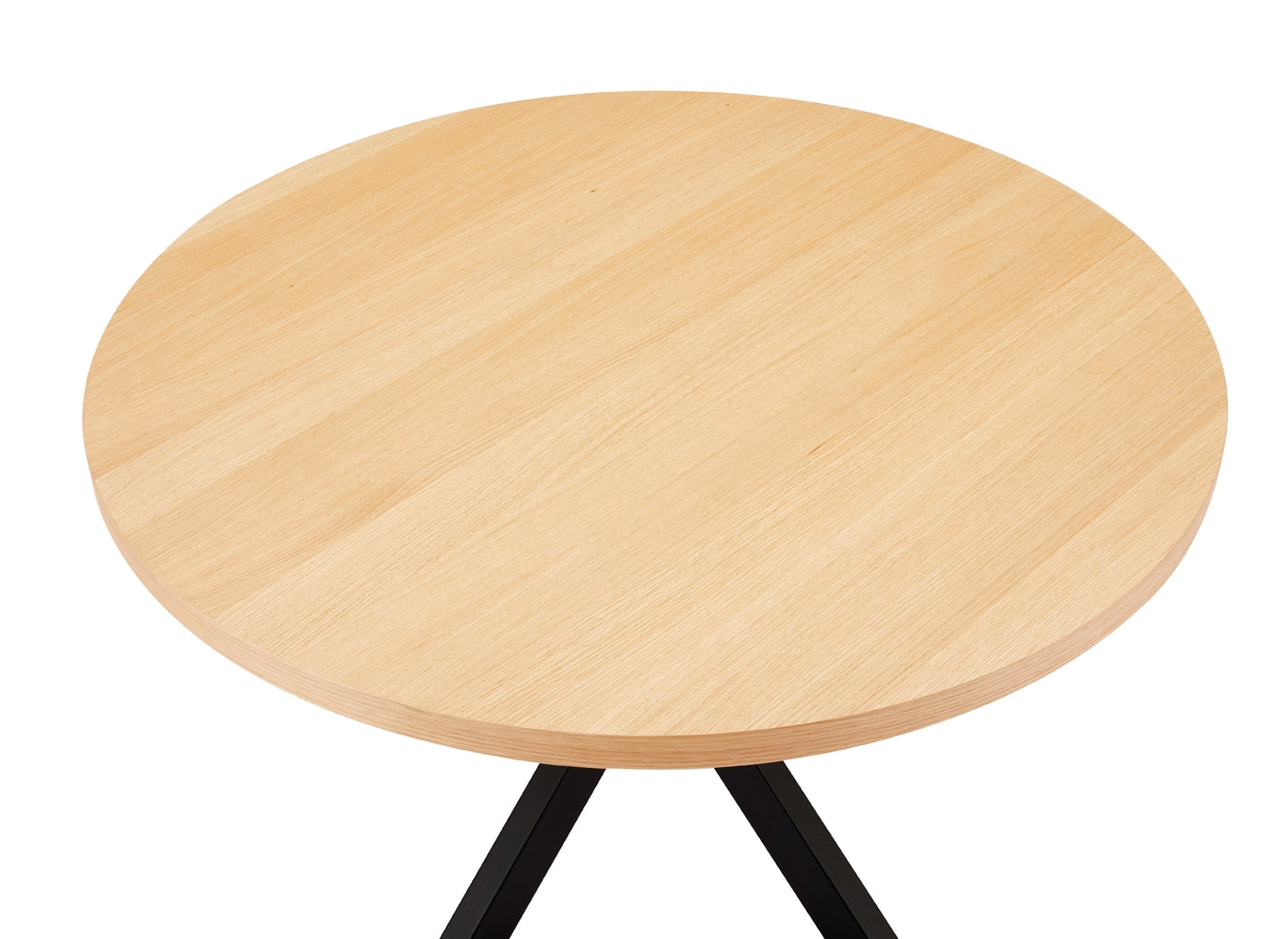 Materiaal: Het tafelblad is gemaakt van eiken fineer, bekend om zijn duurzaamheid en natuurlijke uitstraling. Het onderstel van metaal zorgt voor een stevige basis en voegt een industrieel tintje toe aan het geheel.