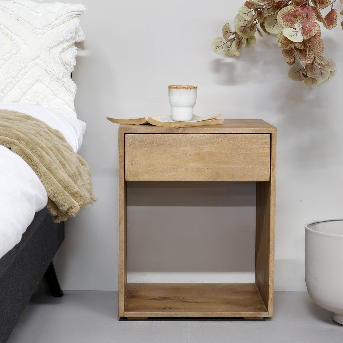 Materiaal: Het Nachtkastje Mees is gemaakt van mangohout, een materiaal dat bekend staat om zijn duurzaamheid en stevigheid. Mangohout is een milieuvriendelijke keuze omdat het afkomstig is van snelgroeiende bomen, wat bijdraagt aan een duurzame wereld.