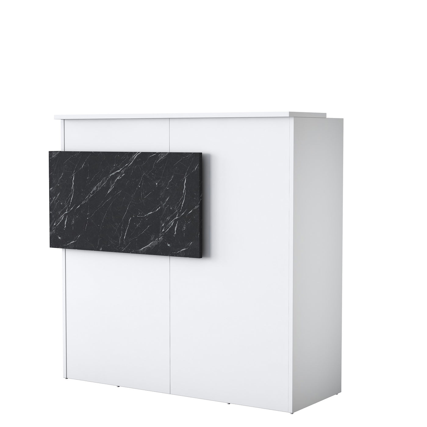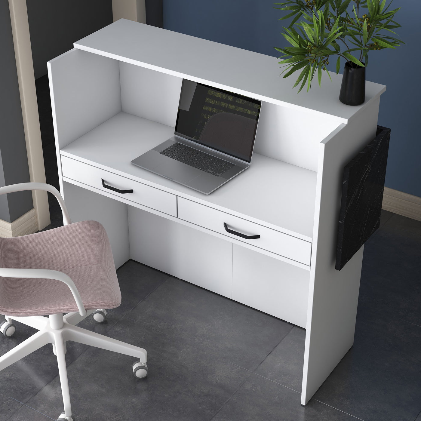 De receptietafel is niet zomaar een meubelstuk; het is een statement van stijl en professionaliteit. De prachtige combinatie van wit en grijs kleuren creëert een gastvrije sfeer die je gasten meteen op hun gemak stelt. Of je nu een hotel, een salon of een kantoor runt, deze tafel is de perfecte toevoeging aan je ontvangstruimte.