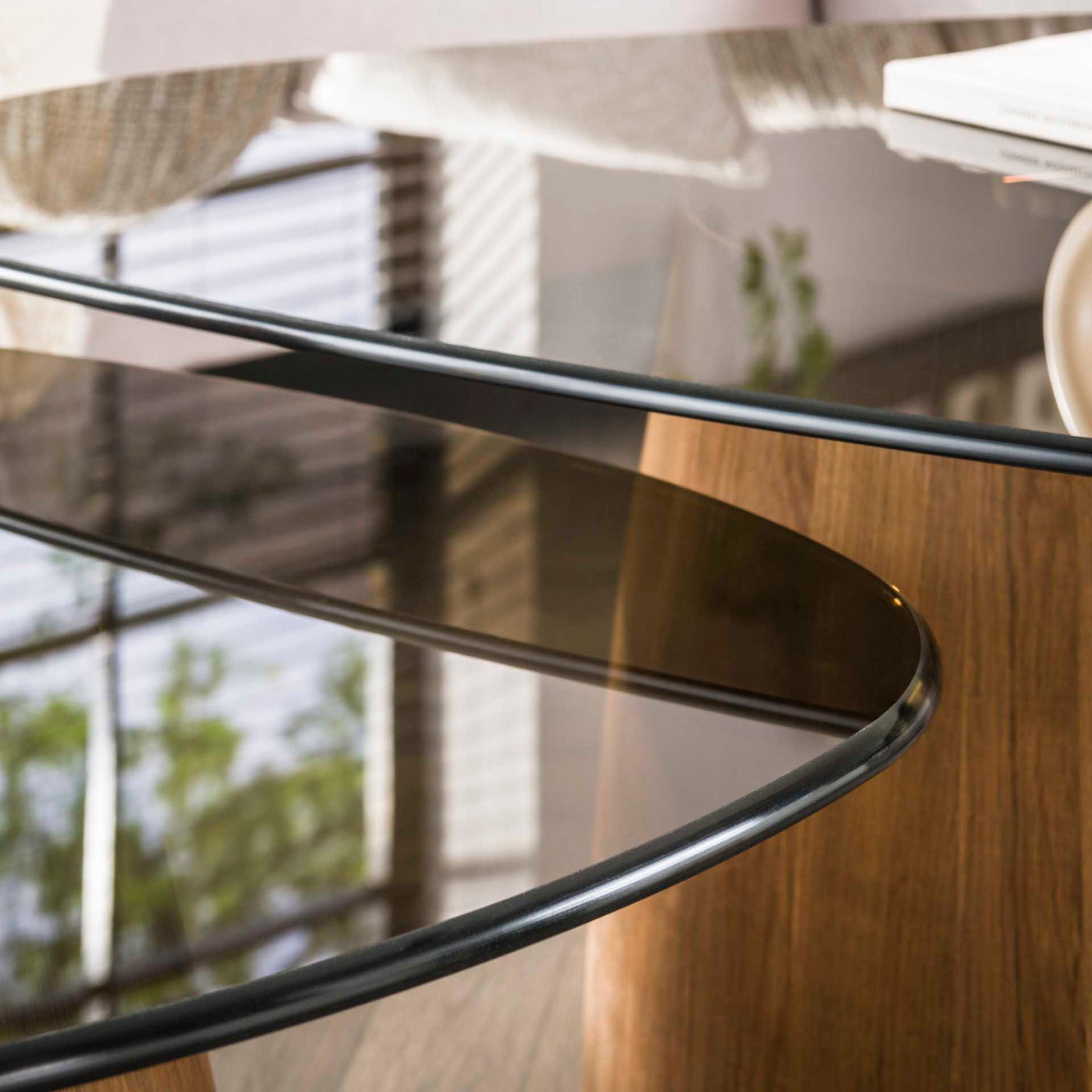 Materiaal: De tafels zijn vervaardigd met een glazen tafelblad dat een verfijnde uitstraling biedt, terwijl het houten onderstel zorgt voor stabiliteit en een natuurlijke touch. Deze combinatie van glas en hout maakt de tafels zowel stijlvol als robuust.