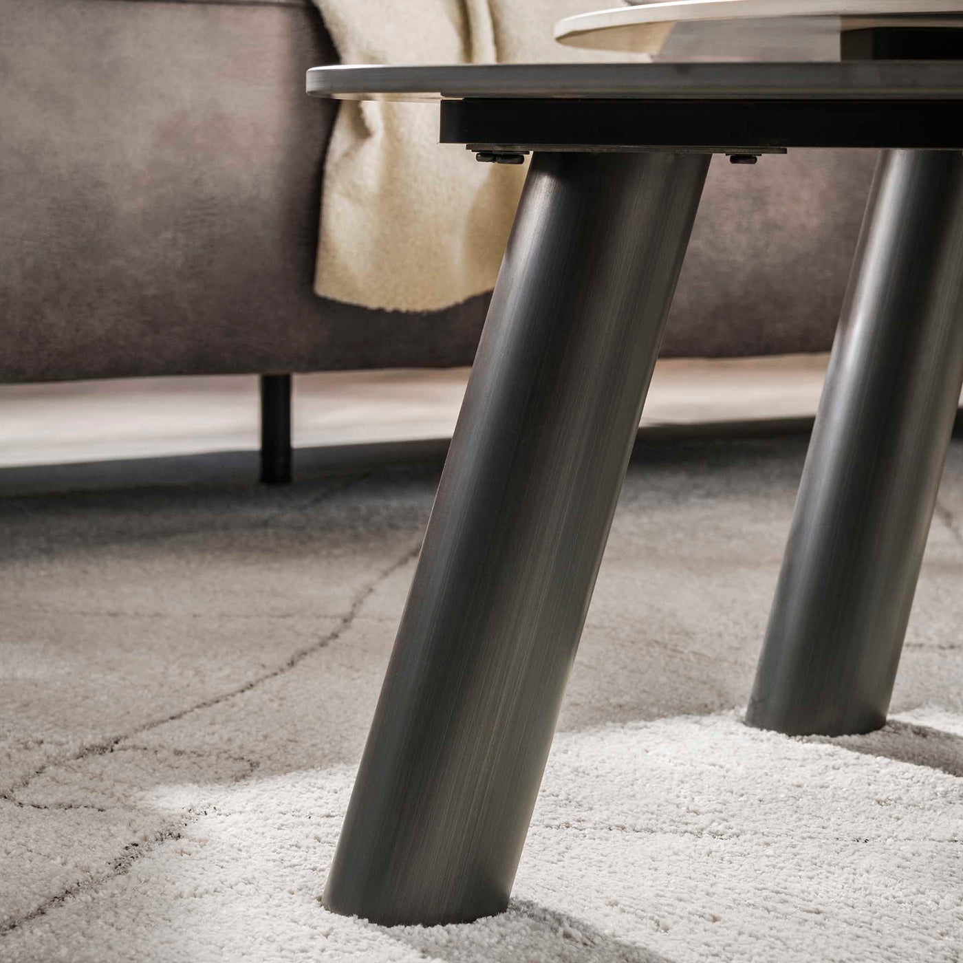 Materiaal: Het tafelblad van deze salontafel set is gemaakt van hoogwaardig keramiek, wat zorgt voor een luxe uitstraling en duurzaamheid. Het keramiek is afgewerkt met een travertinlook, wat een natuurlijke en unieke uitstraling geeft. Het onderstel is vervaardigd uit stevig staal, wat bijdraagt aan de robuustheid van het meubel.