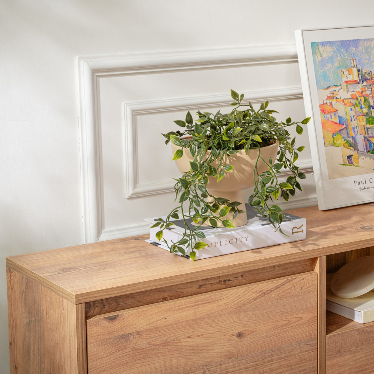 Ontdek de charme van het landelijke interieur met het Tv-meubel Vanguard Naturel van 160 cm. Dit meubelstuk, uitgevoerd in een warme naturel kleur, is een perfecte aanvulling voor jouw woonkamer. Gemaakt van hoogwaardig melamine, biedt het een duurzame en onderhoudsvriendelijke oplossing voor je tv en andere media-apparatuur. Met zijn landelijke stijl voegt het een rustieke en gezellige sfeer toe aan je interieur. Het tv-meubel is niet alleen een eyecatcher, maar ook functioneel met voldoende opbergruimte voor al je benodigdheden.