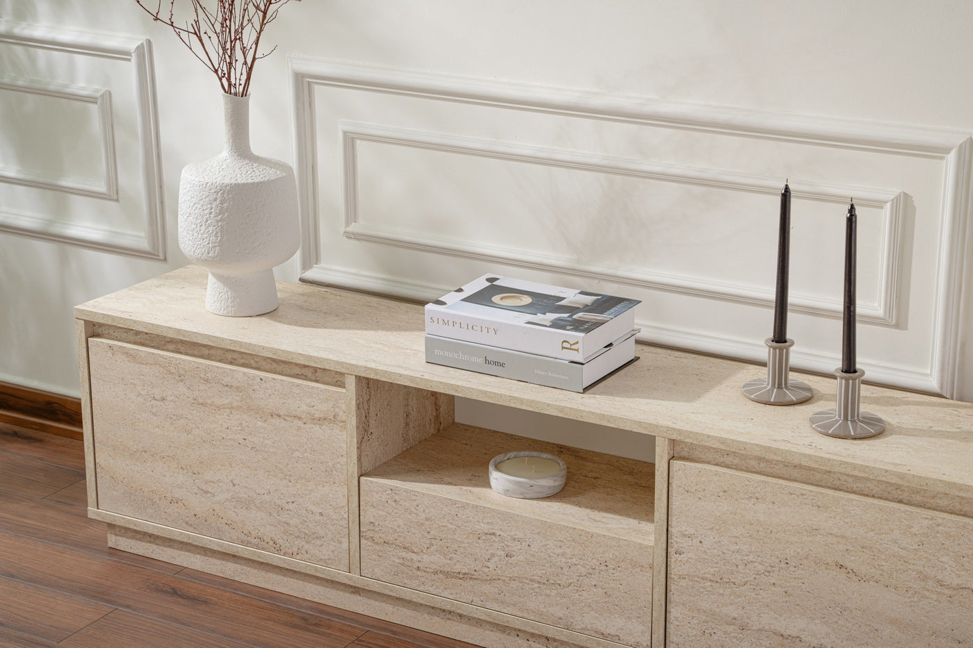 Ontdek de elegante charme van het Tv-meubel Vanguard in een prachtige travertinlook. Dit meubelstuk is ontworpen in de stijlvolle Japandi-stijl, die een perfecte balans biedt tussen minimalisme en warmte. Het gebruik van melamine als materiaal zorgt voor een duurzame en onderhoudsvriendelijke afwerking. De travertin kleur geeft het meubel een luxe uitstraling, waardoor het een eyecatcher in je woonkamer wordt. Met zijn hoogwaardige afwerking en praktische ontwerp is dit tv-meubel niet alleen een lust voor het oog, maar ook een functionele toevoeging aan je interieur.