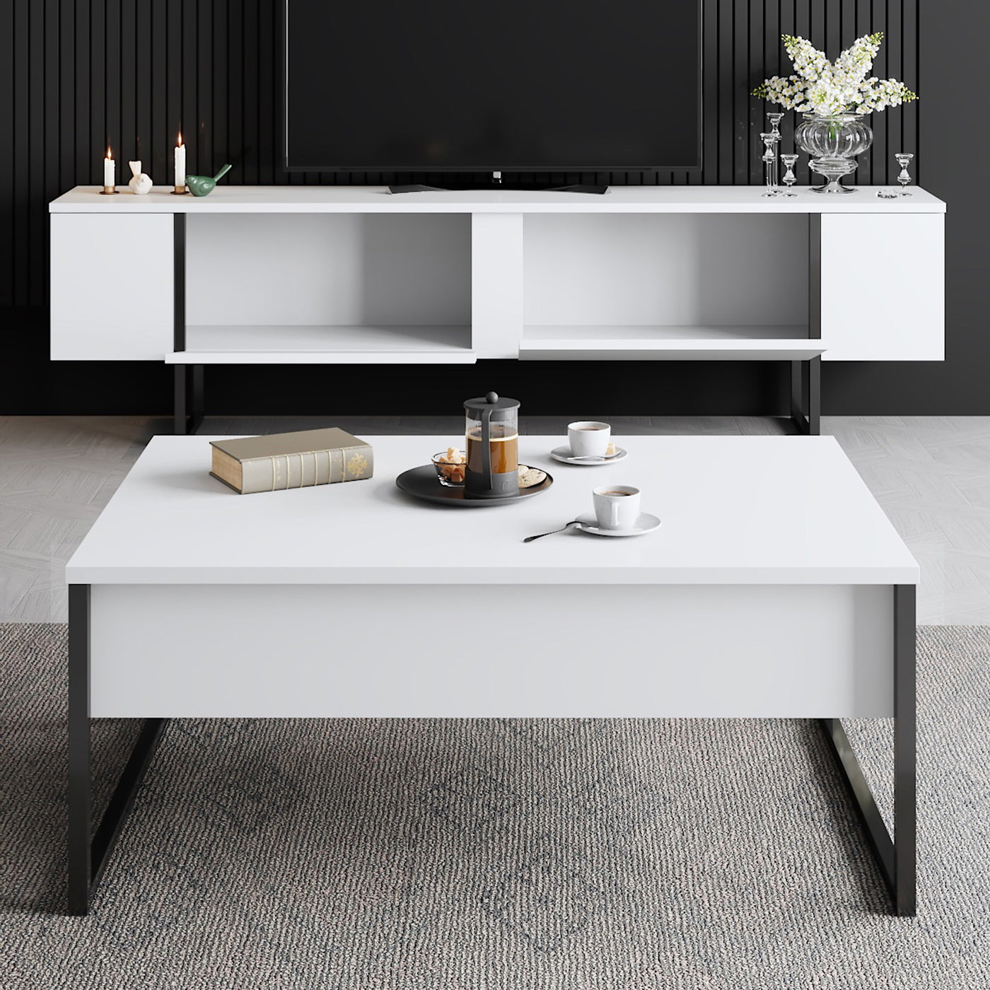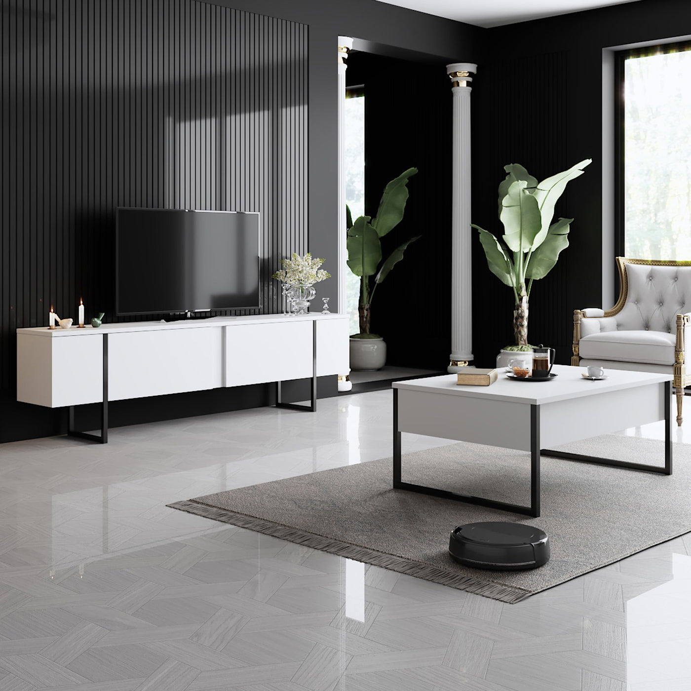 Materiaal: Het tv-meubel is vervaardigd uit metaal en melamine, wat zorgt voor een stevige constructie en een onderhoudsvriendelijk oppervlak. Deze materialen zijn ideaal voor dagelijks gebruik en behouden hun kwaliteit door de jaren heen.