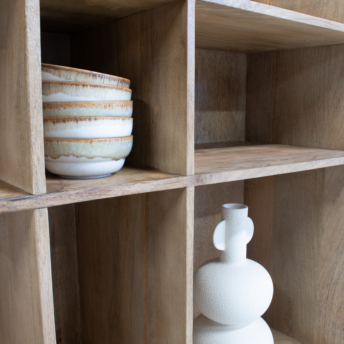 Materiaal: Deze wandkast is gemaakt van hoogwaardig mangohout, een materiaal dat bekend staat om zijn duurzaamheid en unieke uitstraling. Mangohout is een milieuvriendelijke keuze en zorgt ervoor dat elk meubelstuk een eigen karakter heeft.