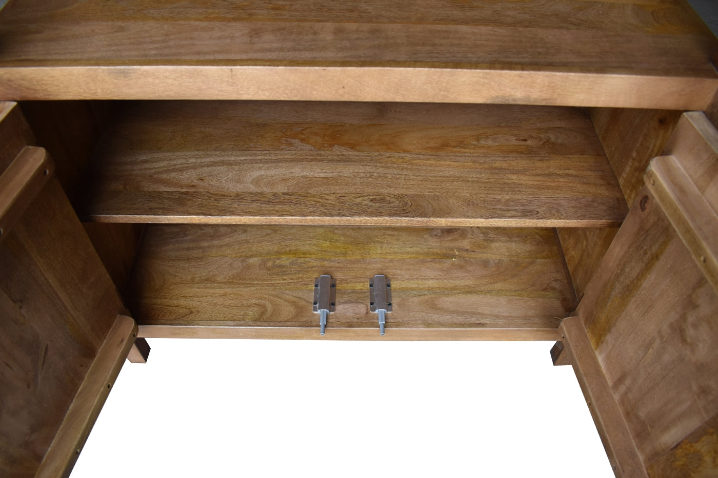 Materiaal: Deze wandkast is volledig gemaakt van mangohout, bekend om zijn duurzaamheid en natuurlijke schoonheid. Het materiaal draagt bij aan de landelijke uitstraling van het meubel.