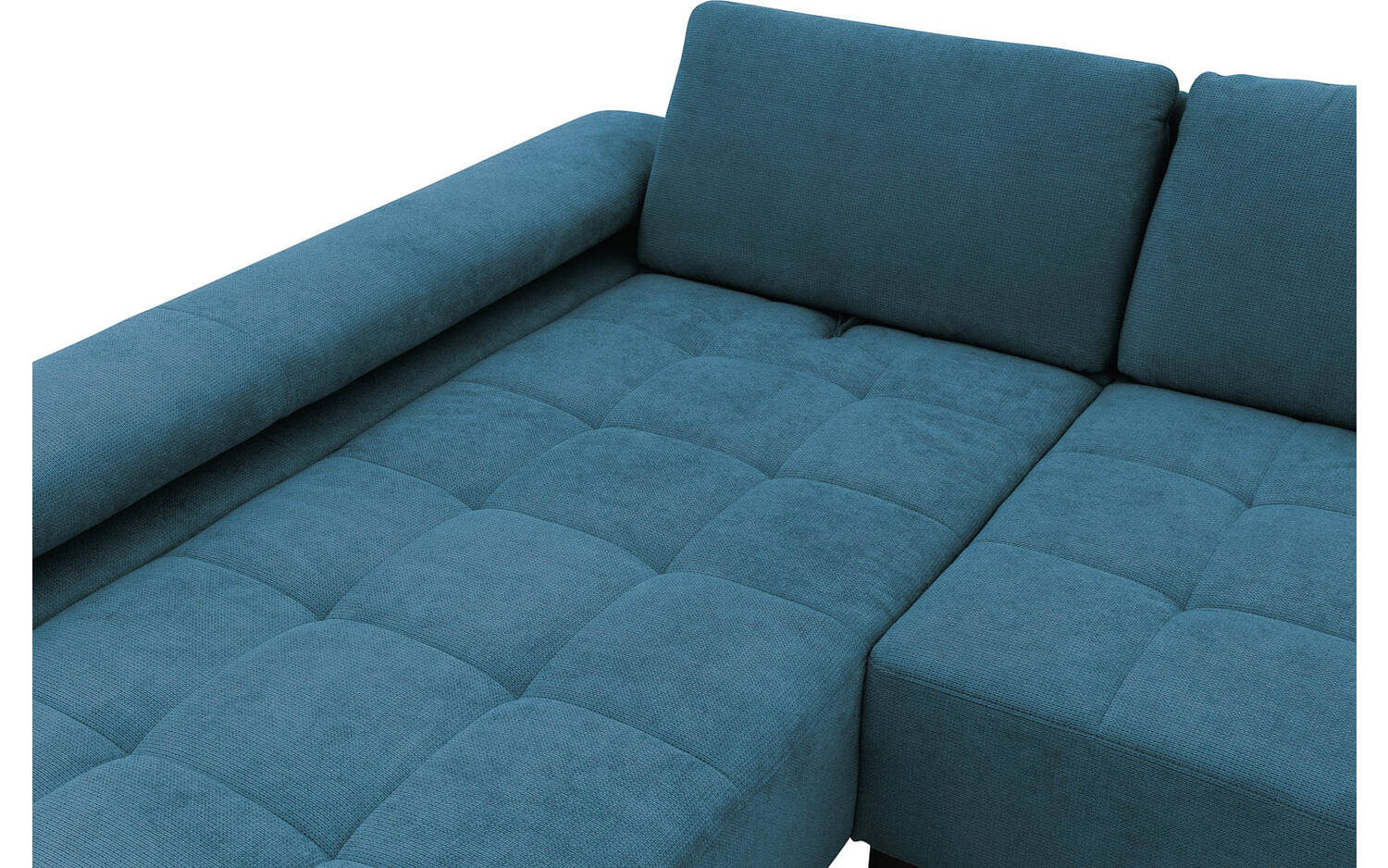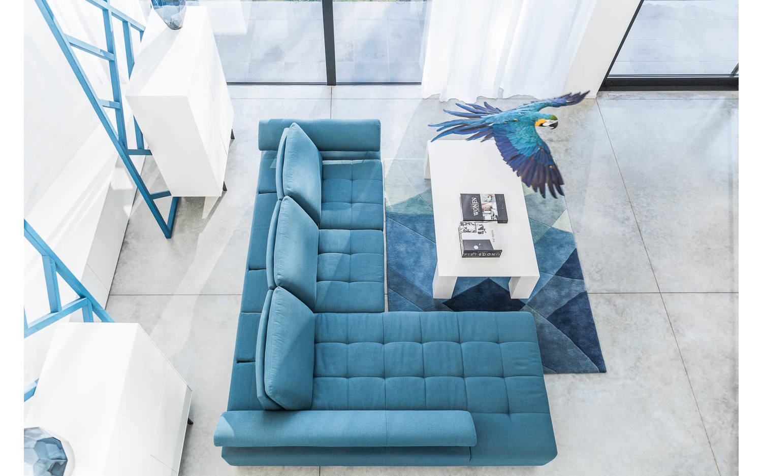 Stijlvolle details van deze azuurblauwe hoekbank