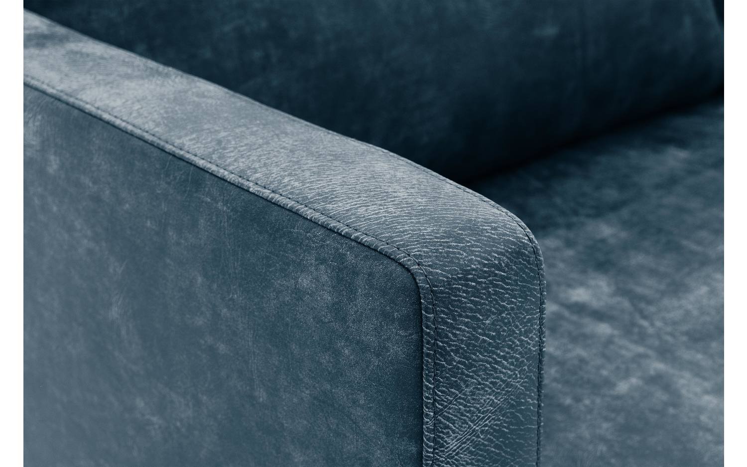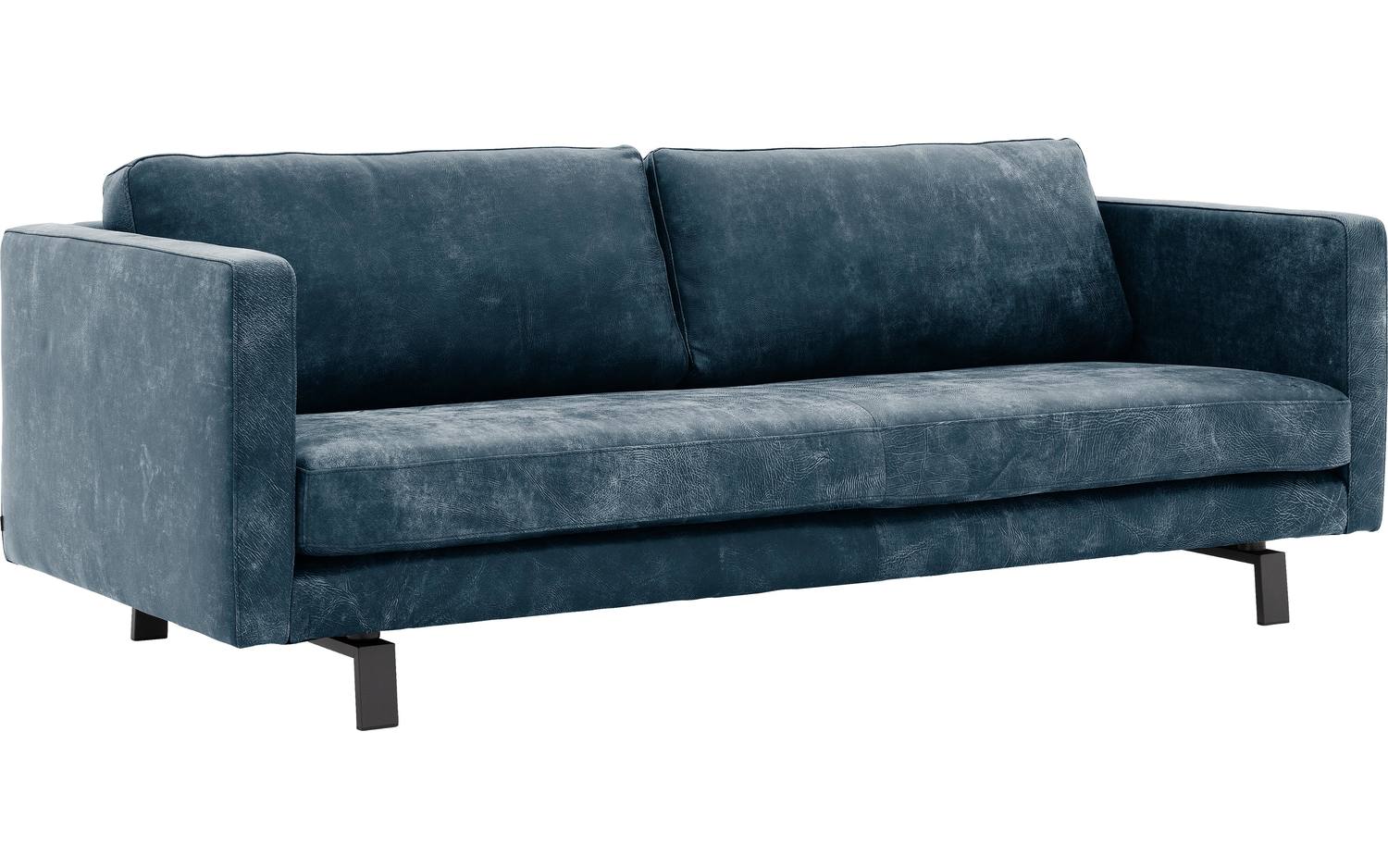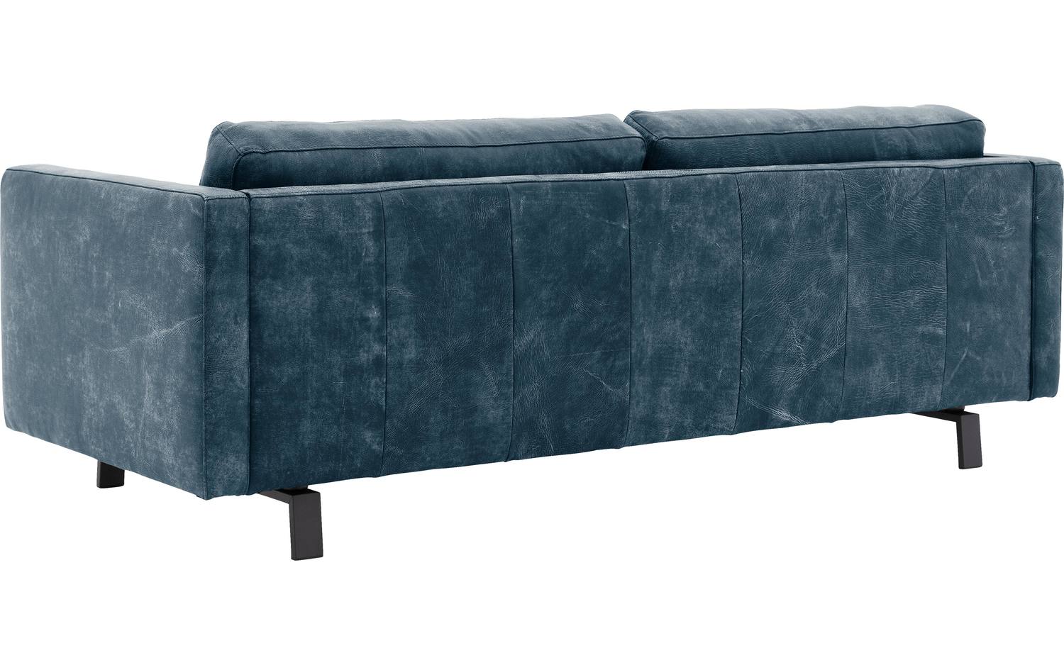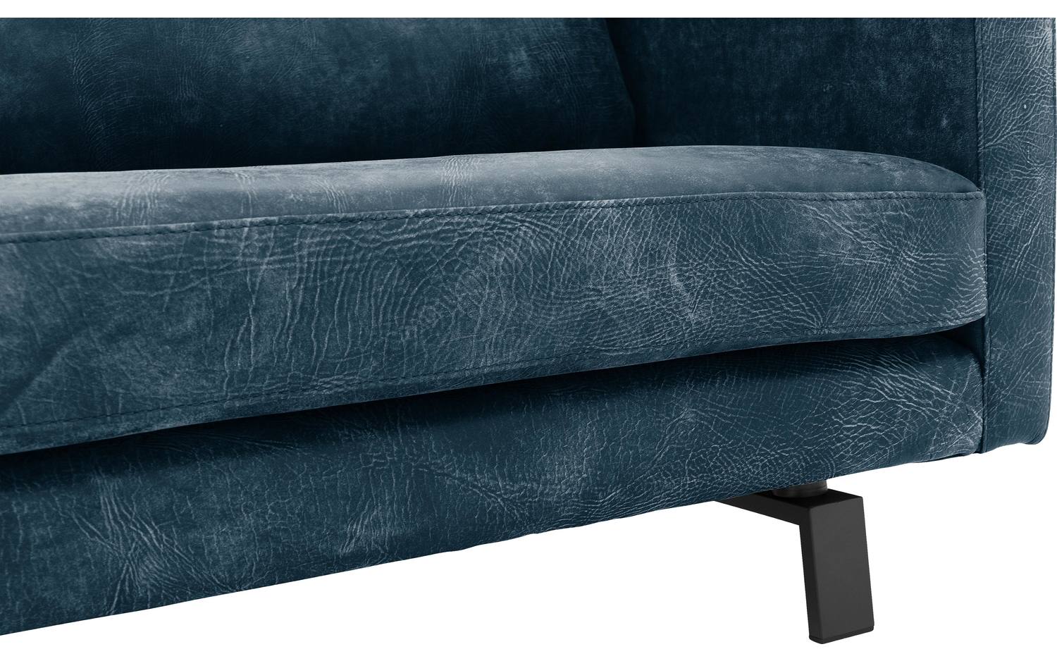 Het buffalo leer van deze 3,5-zits bank heeft een suède-achtige look en is minimaal bewerkt. Hierdoor blijft het leer zijn natuurlijke nerfstructuur en karakter behouden. De blauwe kleur geeft een frisse en eigentijdse uitstraling die perfect past in een urban industrieel interieur.