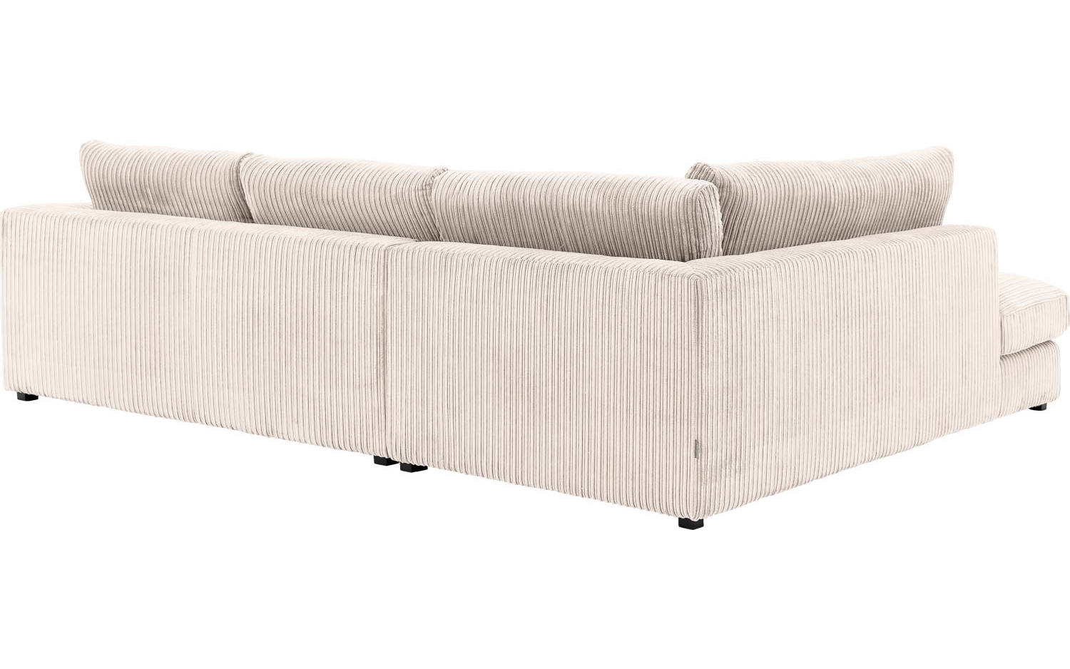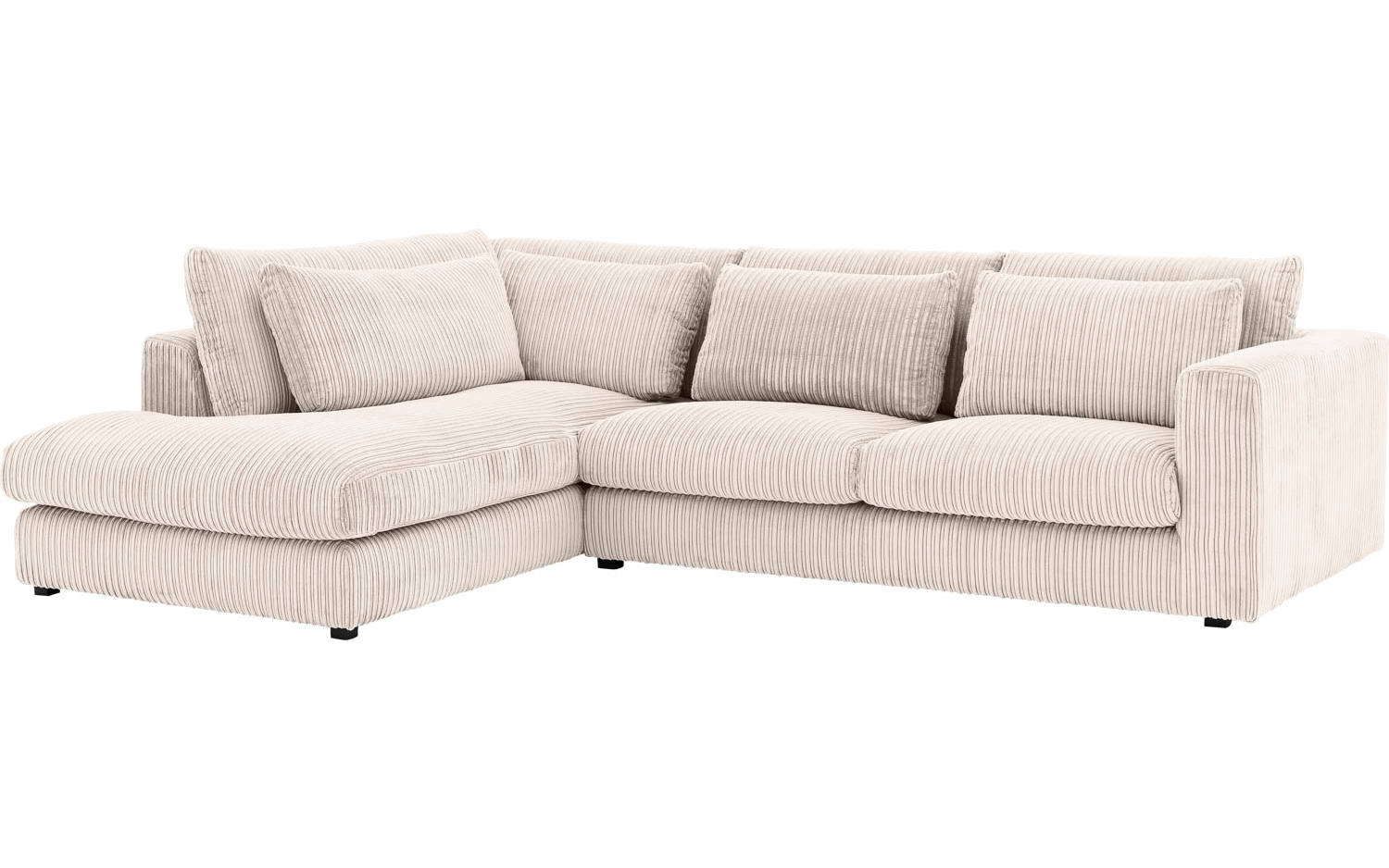 Met de zachte ribstof in ivoor geef je jouw woonkamer een warme en rustgevende sfeer. De beige kleur maakt deze hoekbank veelzijdig en past mooi bij verschillende interieurstijlen. De kunststof poten in zwart zorgen voor een subtiel contrast en geven de bank een eigentijdse uitstraling.