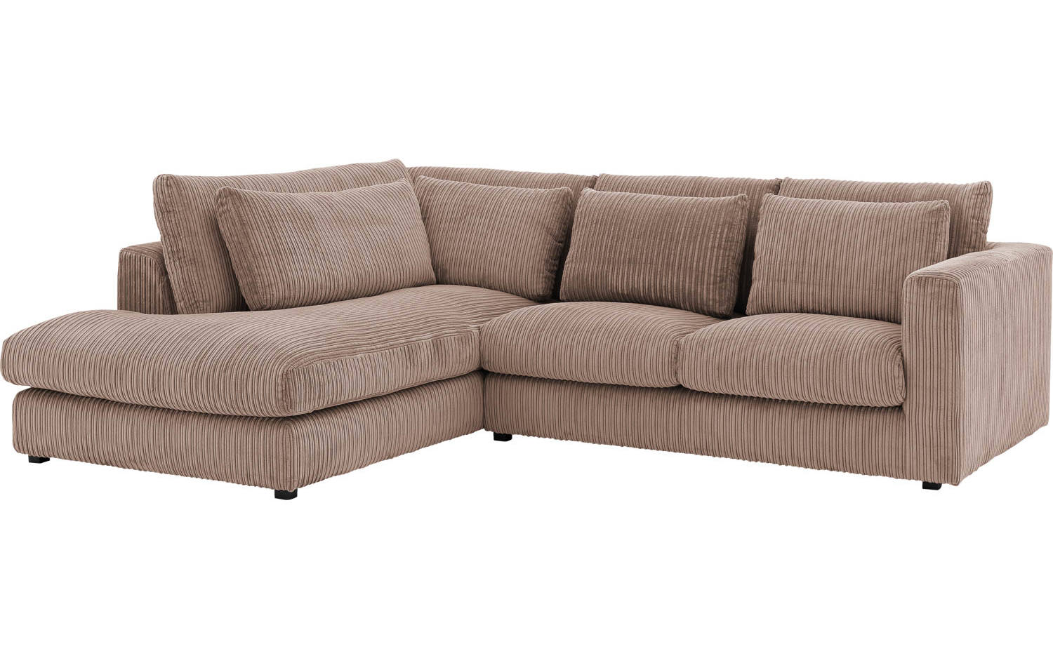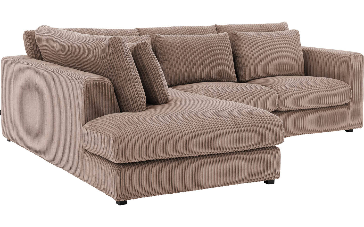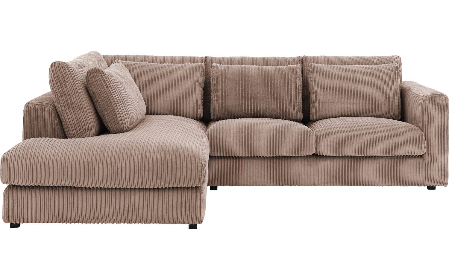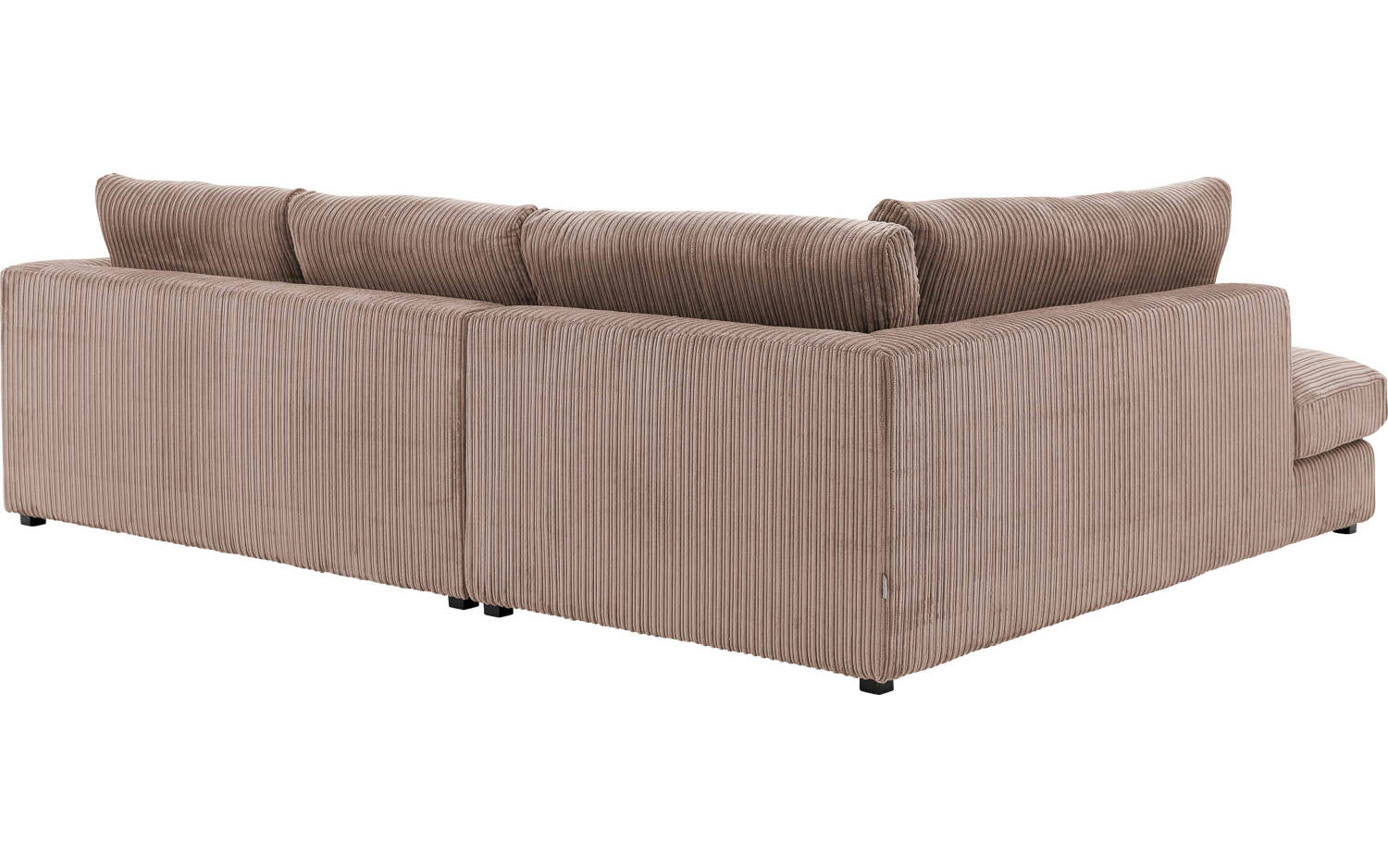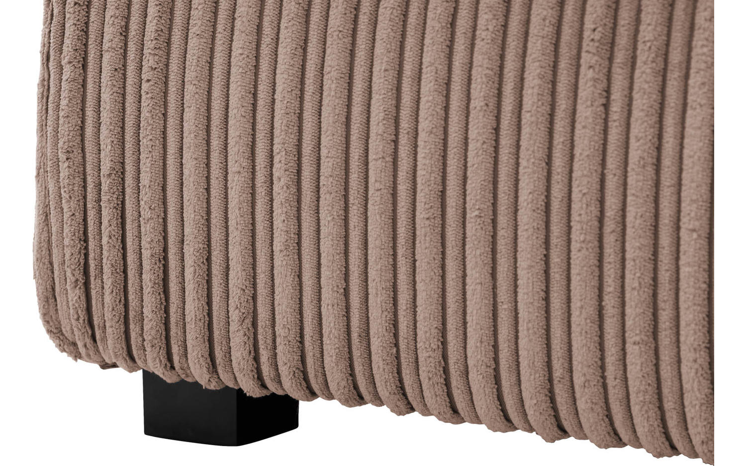 Deze hoekbank is bekleed met mokkakleurige ribstof, wat zorgt voor een mooie textuur en warme uitstraling. De bruine tint past prachtig in een stijlvol landelijk interieur en combineert gemakkelijk met andere kleuren en materialen. De kunststof poten in zwart geven Ravenia een eigentijds tintje.