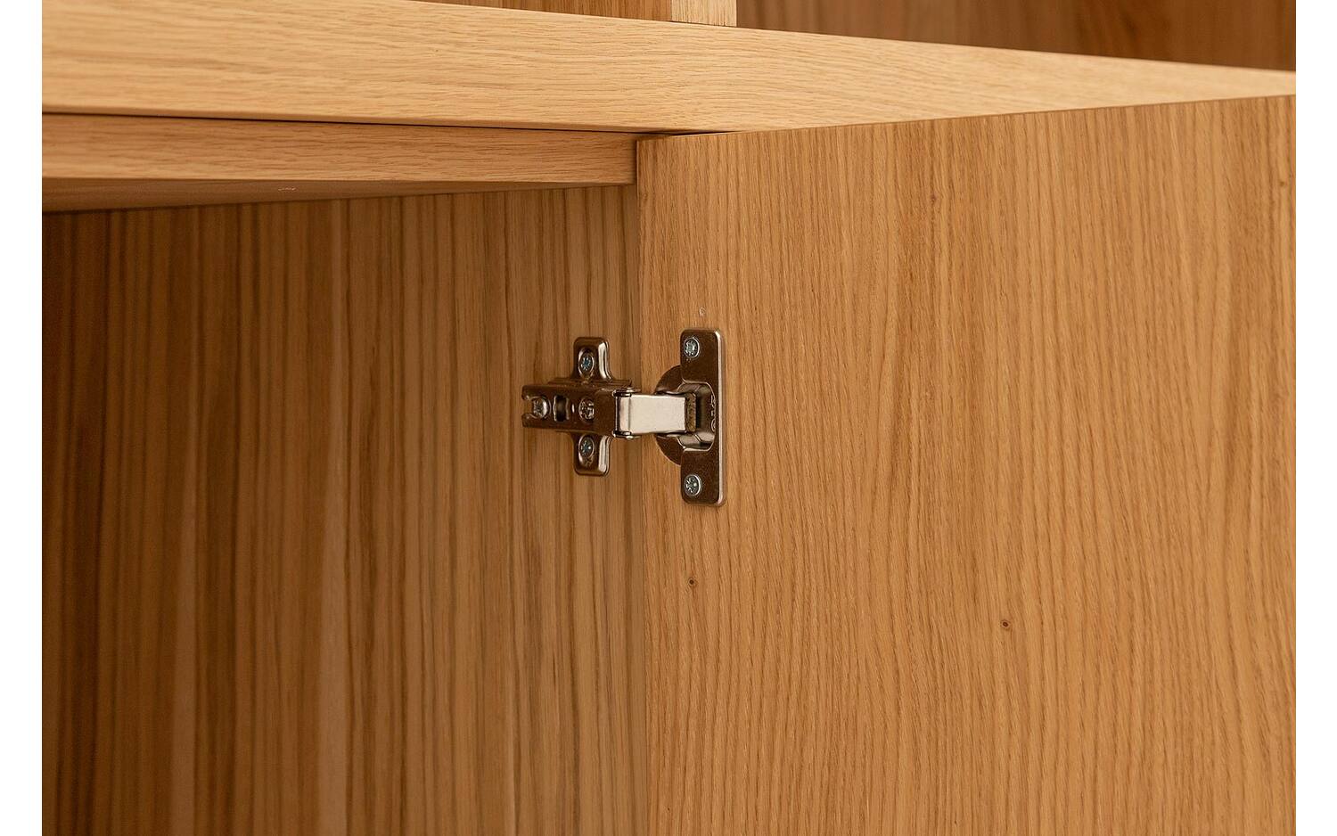 Het moderne push-to-open systeem zorgt voor een strakke afwerking zonder handgrepen. Gewoon even drukken en de deuren gaan soepel open. De blanke lak beschermt het eiken fineer tegen vlekken en kringen, ideaal voor dagelijks gebruik.