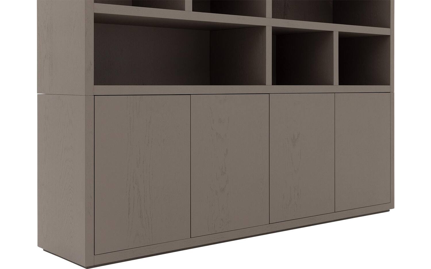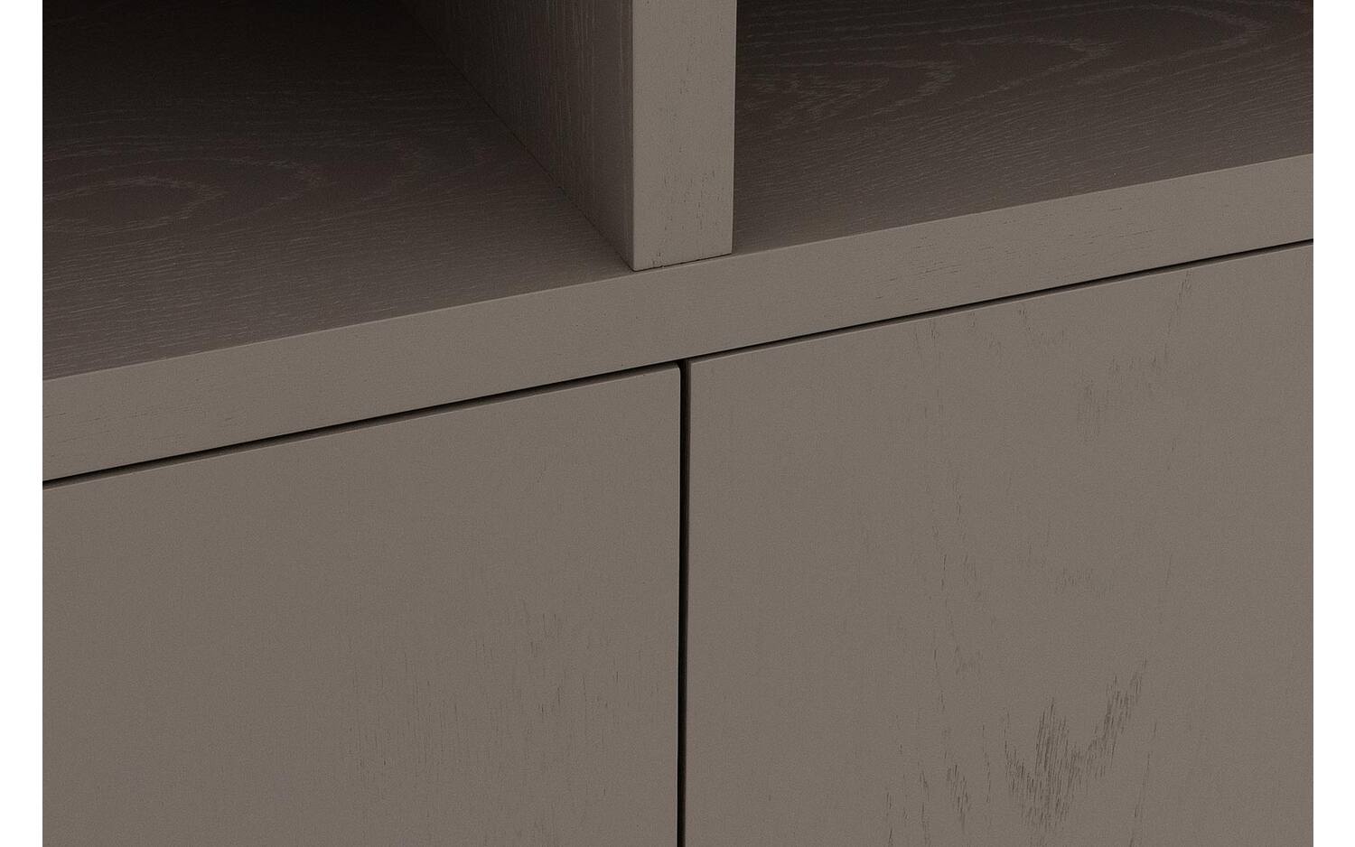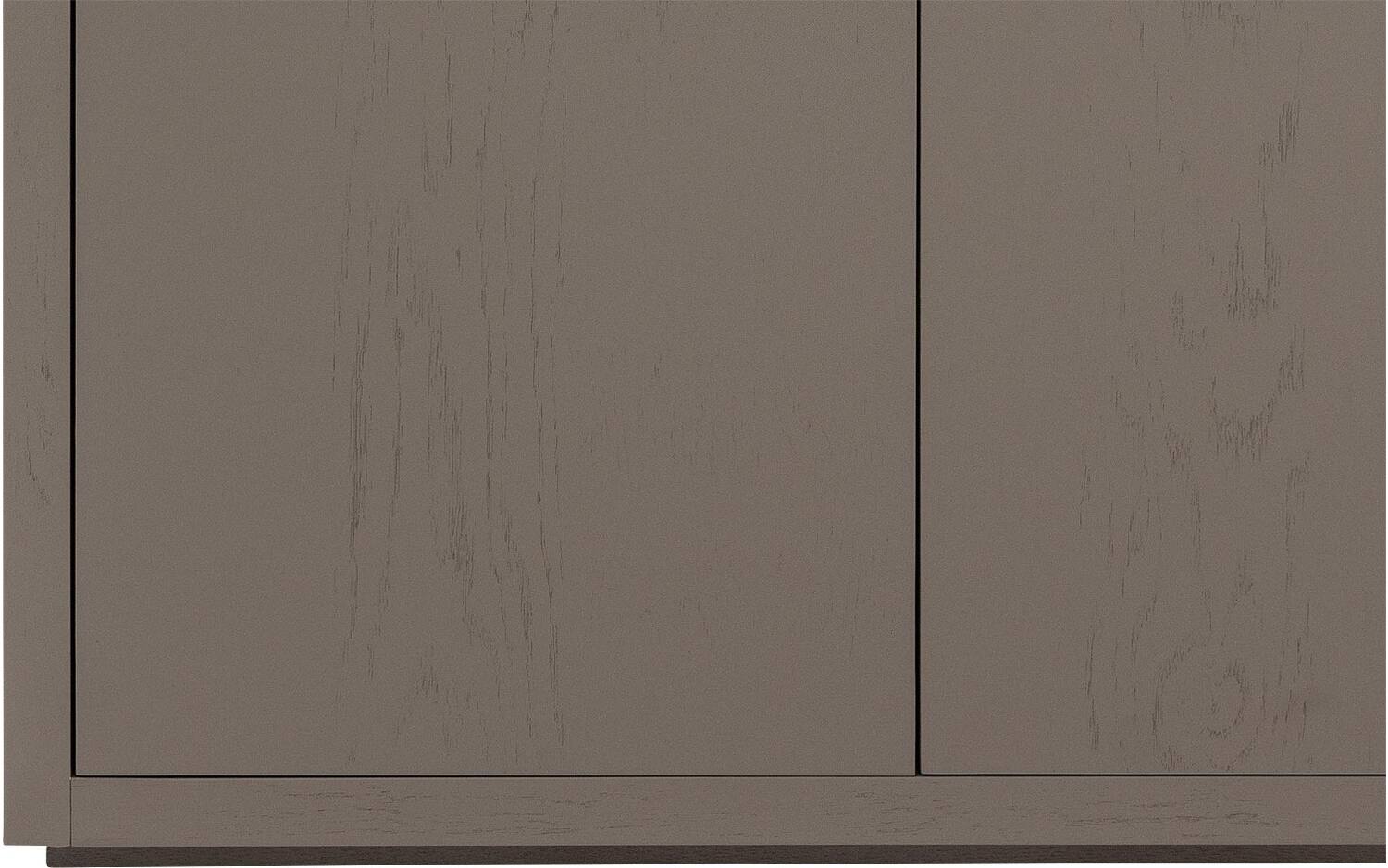 De krachtige lijnen van buffetkast Barcelona worden versterkt door het taupe gelakte eiken fineer. De beschermende laklaag biedt niet alleen een elegante uitstraling, maar beschermt ook effectief tegen vlekken en kringen. Een praktische schoonheid voor dagelijks gebruik.