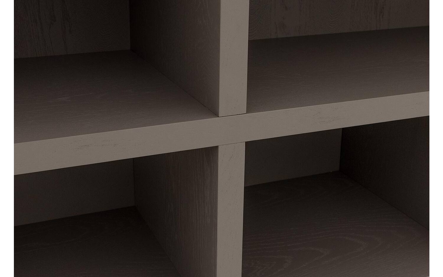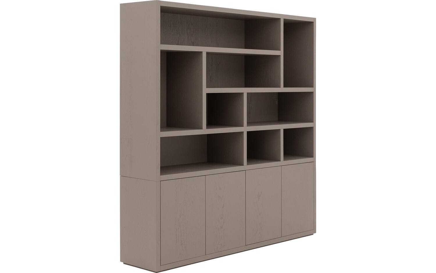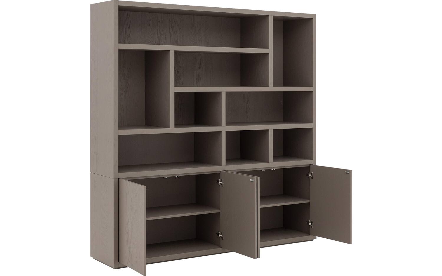 De krachtige lijnen van buffetkast Barcelona worden versterkt door het taupe gelakte eiken fineer. De beschermende laklaag biedt niet alleen een elegante uitstraling, maar beschermt ook effectief tegen vlekken en kringen. Een praktische schoonheid voor dagelijks gebruik.