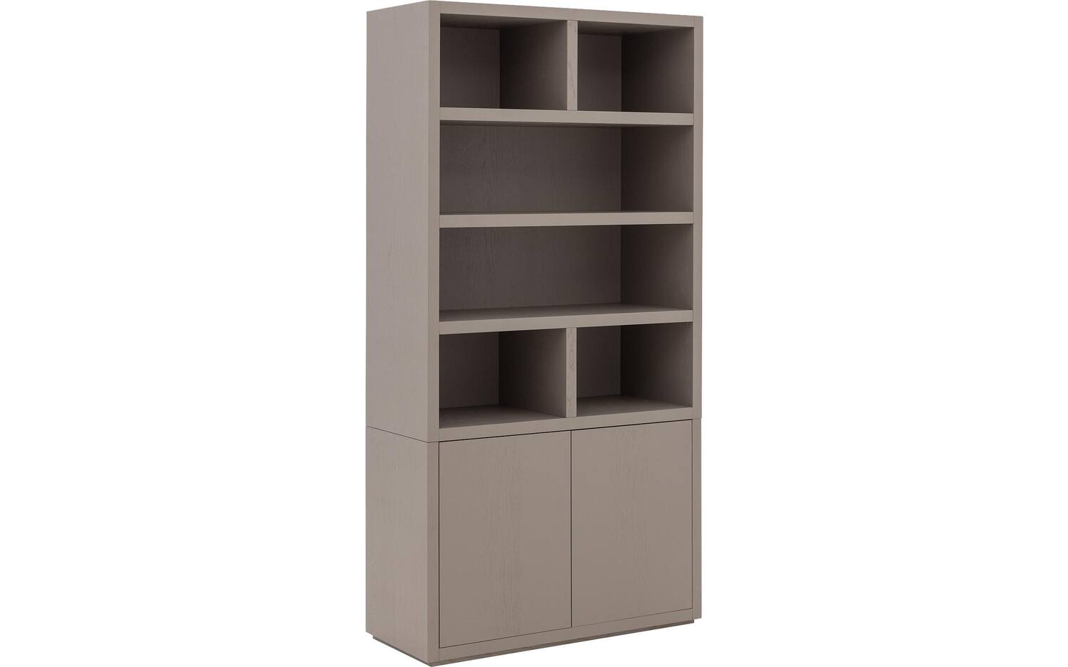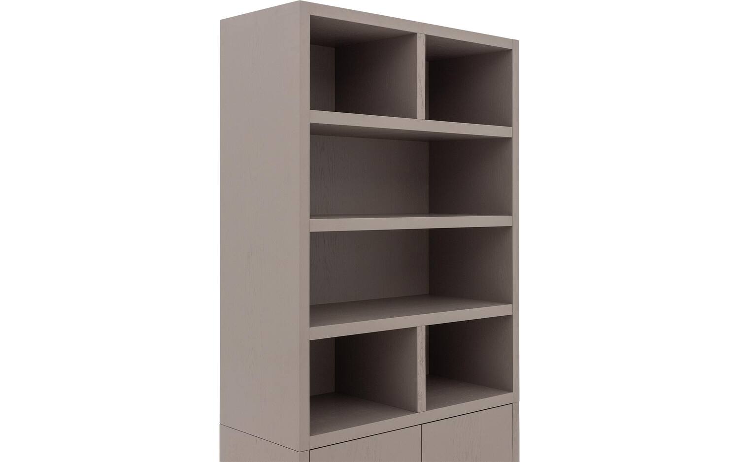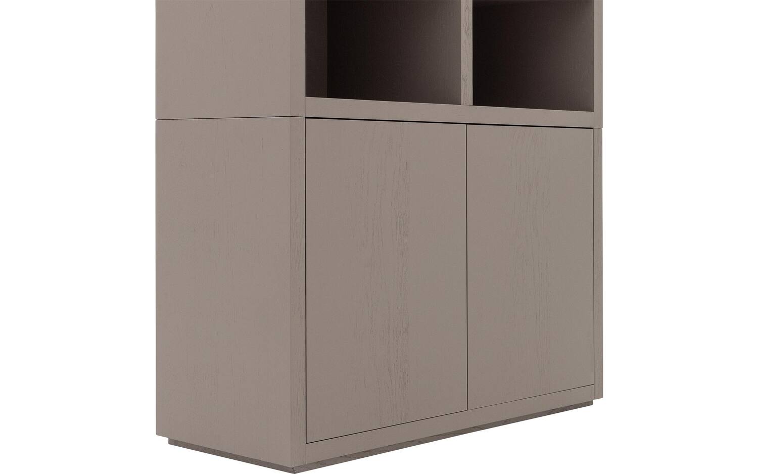 Creëer jouw persoonlijke stijl met decoratieve woonaccessoires in de open vakken. Serviesgoed, fotolijstjes of designobjecten komen prachtig tot hun recht tegen de warme bruine achtergrond. De gesloten opbergruimte zorgt tegelijkertijd voor een rustige, opgeruimde uitstraling.