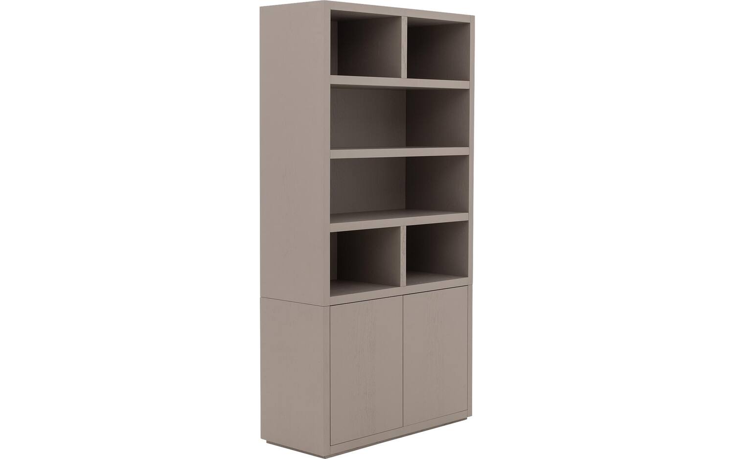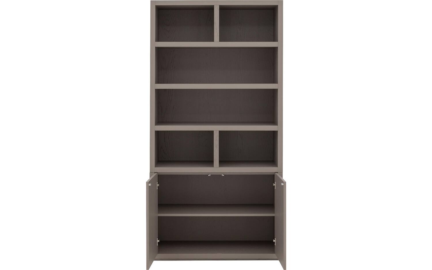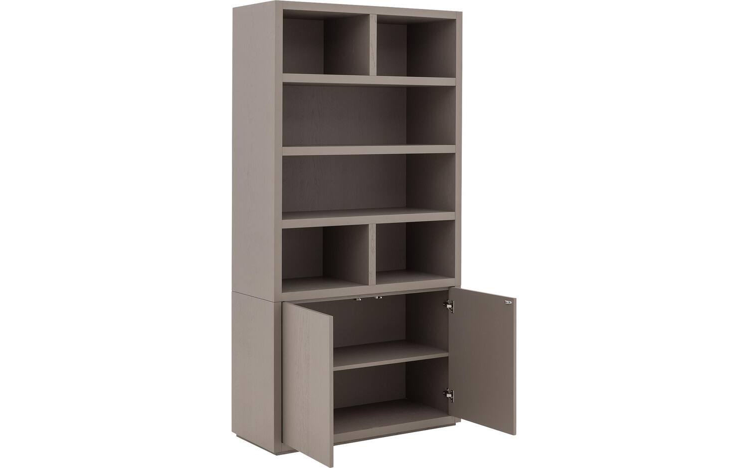 Creëer jouw persoonlijke stijl met decoratieve woonaccessoires in de open vakken. Serviesgoed, fotolijstjes of designobjecten komen prachtig tot hun recht tegen de warme bruine achtergrond. De gesloten opbergruimte zorgt tegelijkertijd voor een rustige, opgeruimde uitstraling.