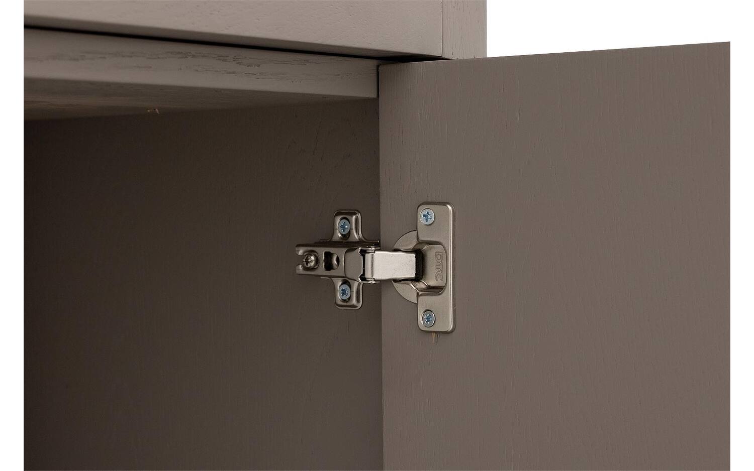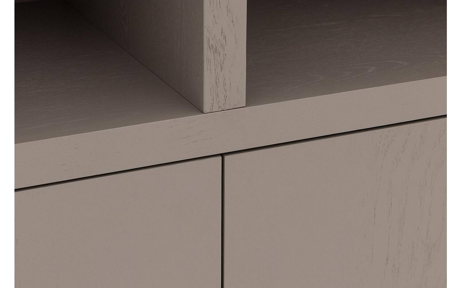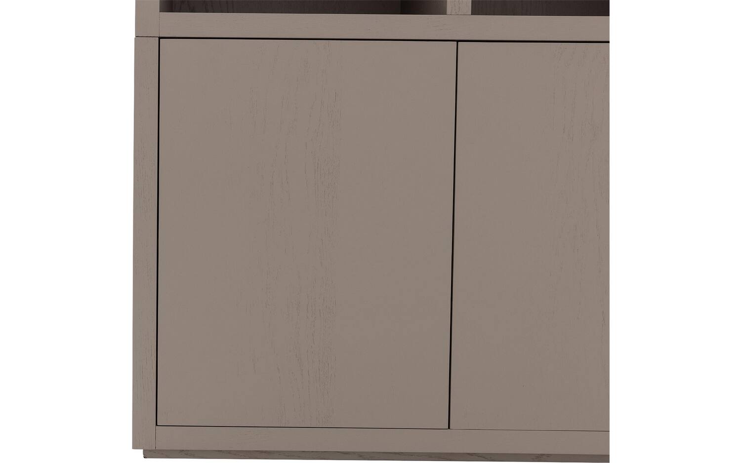 De krachtige lijnen van buffetkast Barcelona worden versterkt door het taupe gelakte eiken fineer. De beschermende laklaag biedt niet alleen een elegante uitstraling, maar beschermt ook effectief tegen vlekken en kringen. Een praktische schoonheid voor dagelijks gebruik.