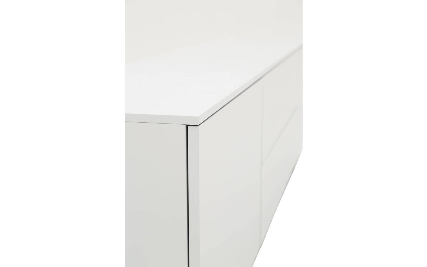 Dit witte dressoir brengt rust en helderheid in je ruimte. De strakke lijnen en greeploze deuren geven een moderne, minimalistische uitstraling. Door de verborgen stelpoten lijkt het meubel bijna te zweven - een echte eyecatcher die je interieur direct opwaardeert.