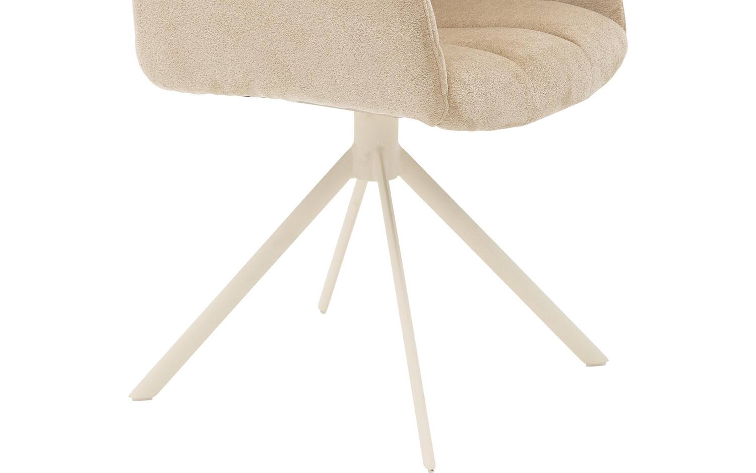 Eetstoel Hestia valt op door de stijlvolle afwerking met verticale stiksels in het zitkuipje. De fijn geweven ecru stof geeft de stoel een natuurlijke uitstraling. De beige spinpoot met poedercoating vormt een mooi contrast met de warme kleur van de stof en zorgt voor stabiliteit.