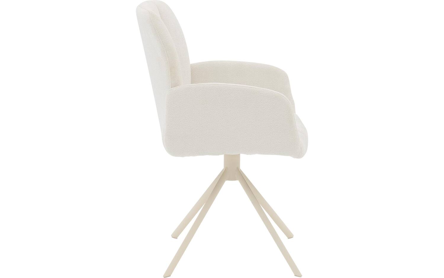 De off-white fijn geweven stofbekleding geeft deze eetstoel een frisse en tijdloze uitstraling. De verticale stiknaden op de kuipvormige zitting zorgen voor een stijlvol accent. De witte spinpoot met poedercoating sluit perfect aan bij de bekleding en geeft de stoel een moderne look.