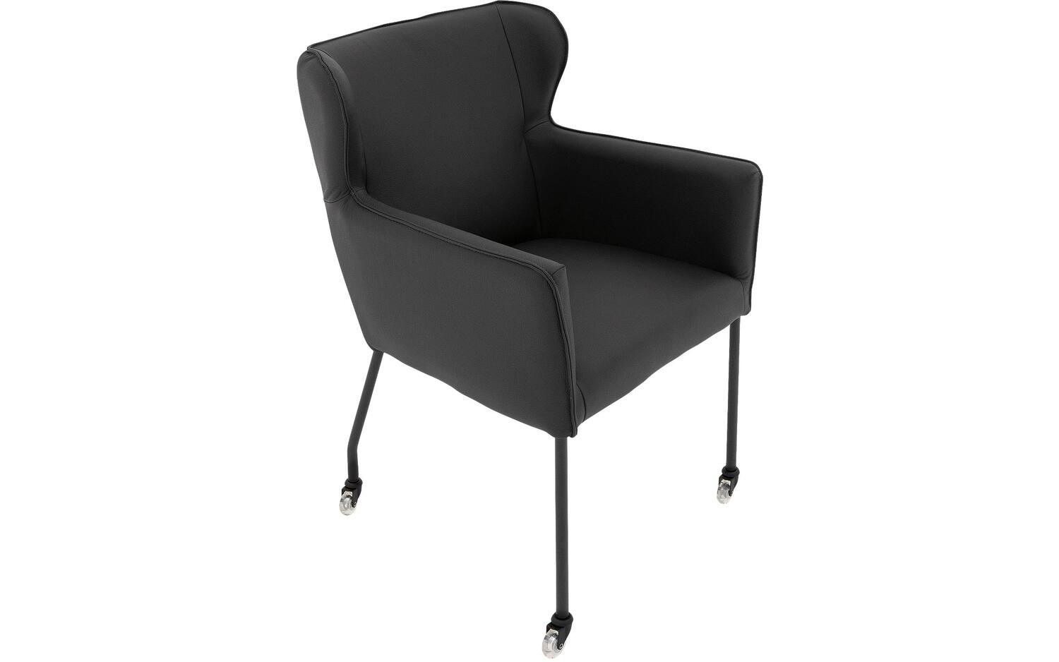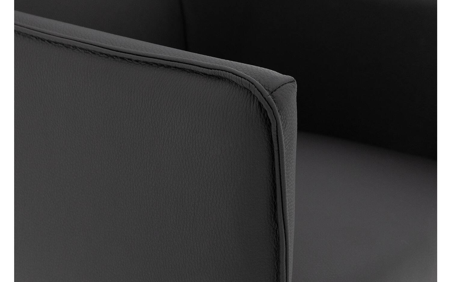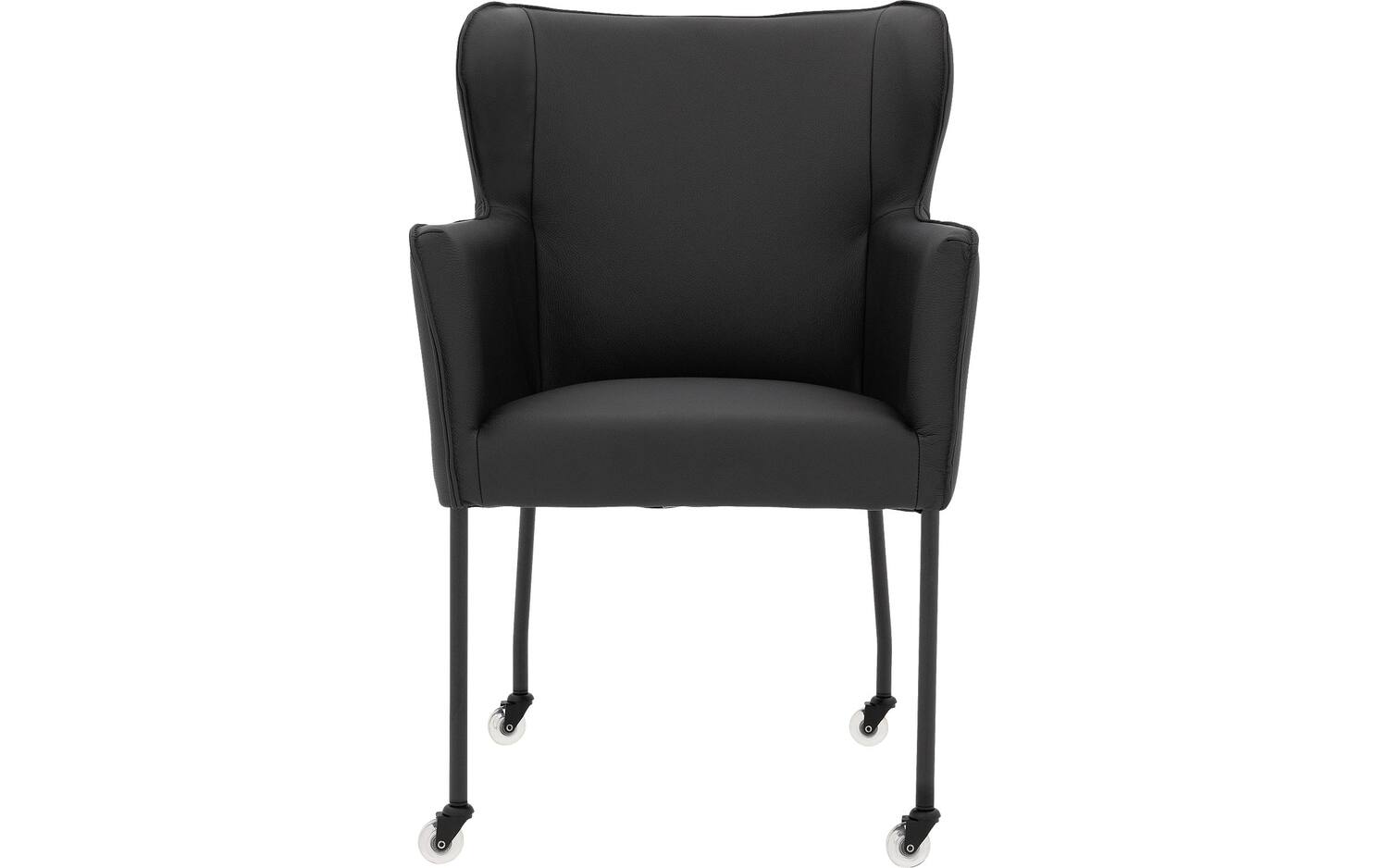 Het zwarte frame met poedercoating past perfect bij de zwarte lederen bekleding. De vaste stoffering geeft deze stoel een strakke, moderne uitstraling. De zitbreedte van 45 cm en een zitdiepte van 45 cm zorgen voor een comfortabele zitpositie, terwijl de praktische wieltjes het aanschuiven vergemakkelijken.