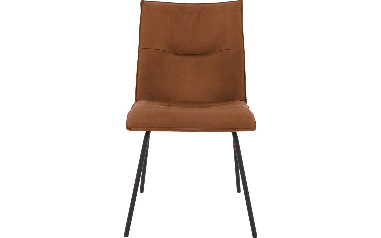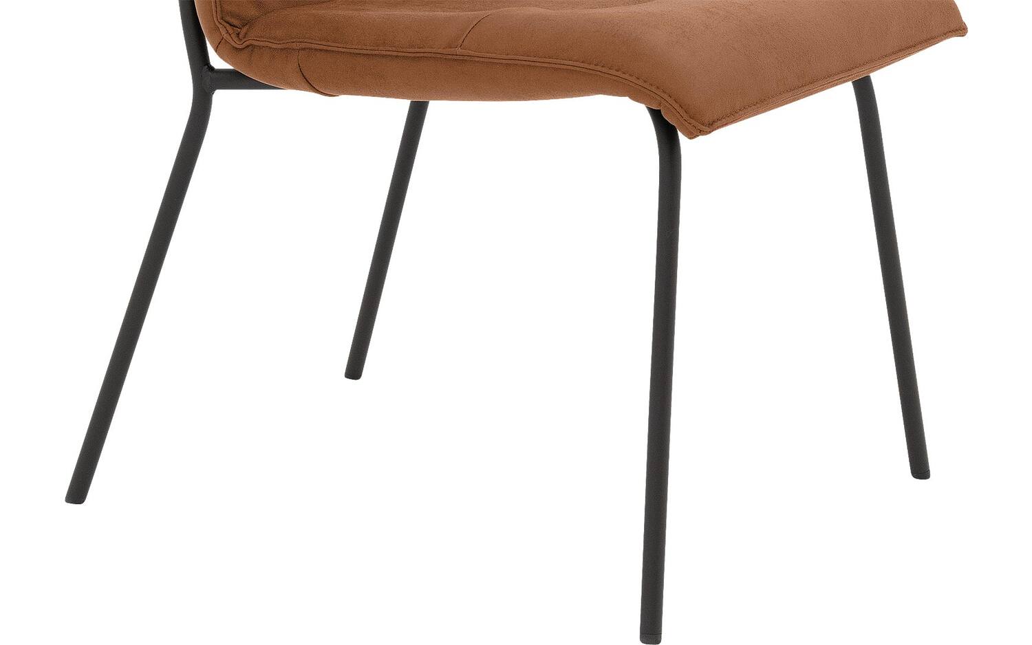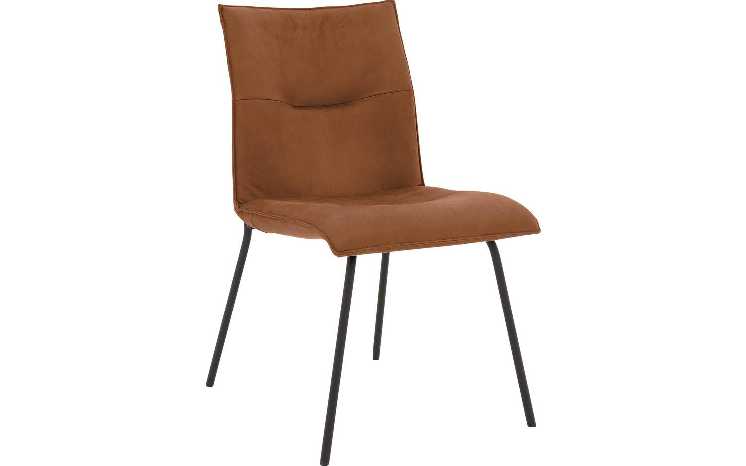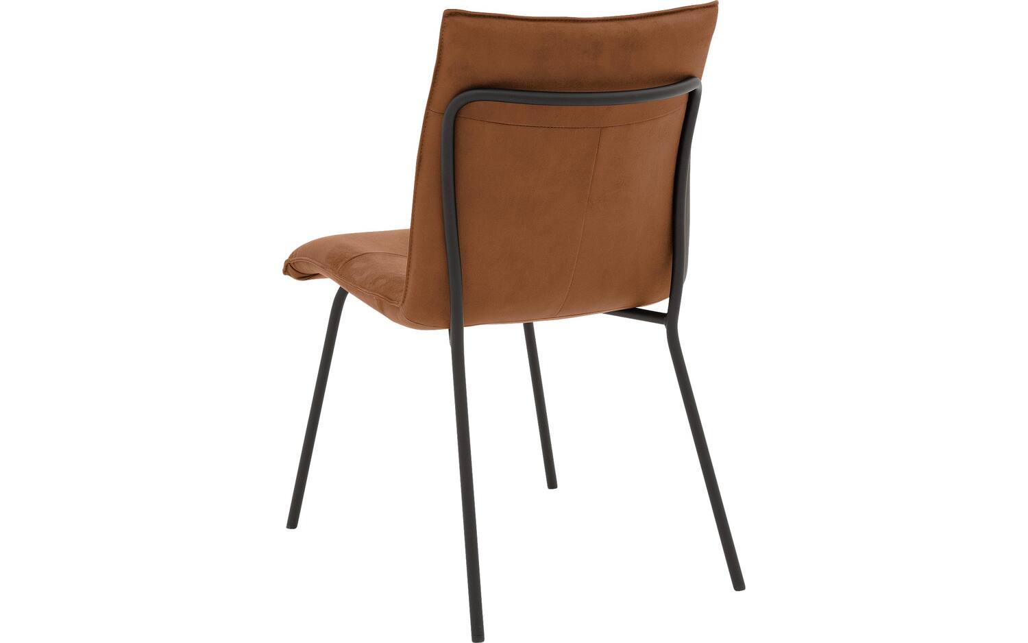 Het zwarte frame met poedercoating vormt een fraai contrast met de warme cognactint van de bekleding. De strakke lijnen en vaste stoffering geven Milan een moderne look die prachtig tot zijn recht komt in een stijlvol landelijk interieur. Deze eettafelstoel heeft geen armleuningen, waardoor hij een lichte en open uitstraling heeft.