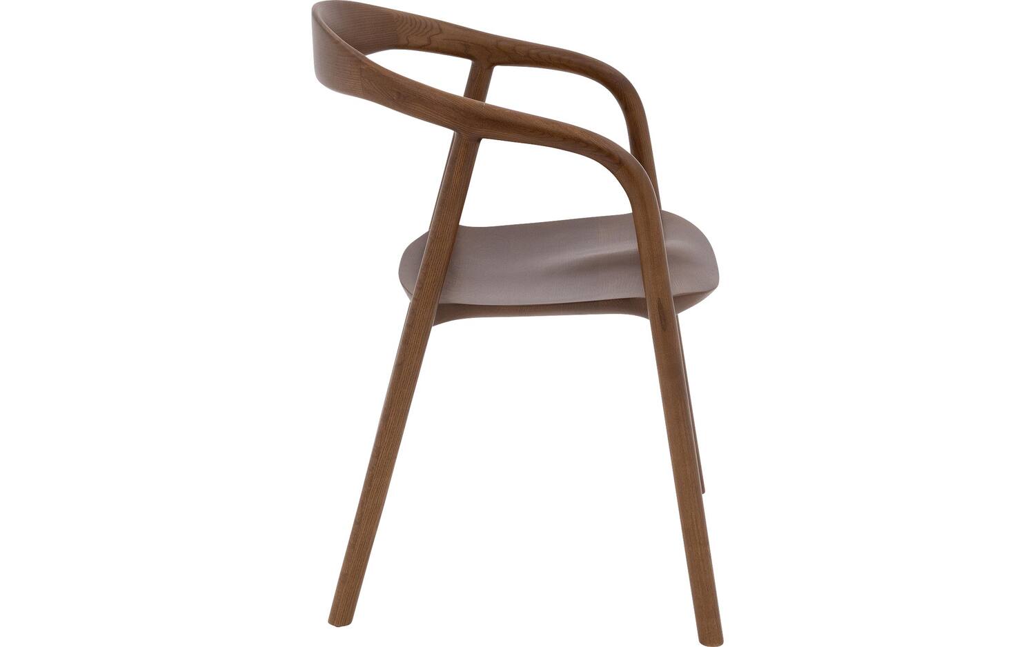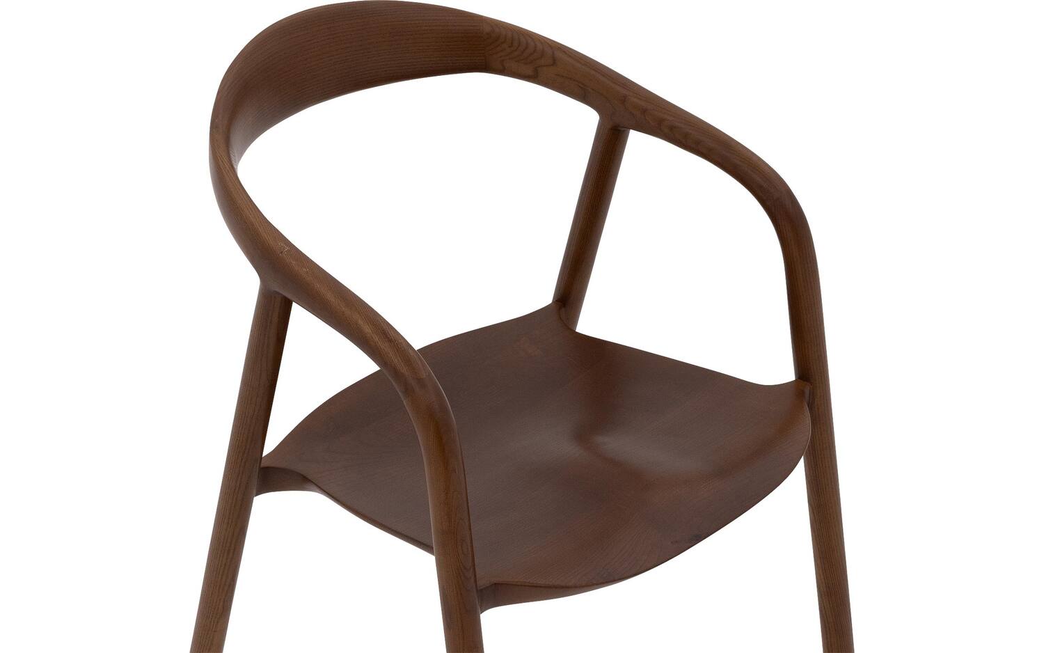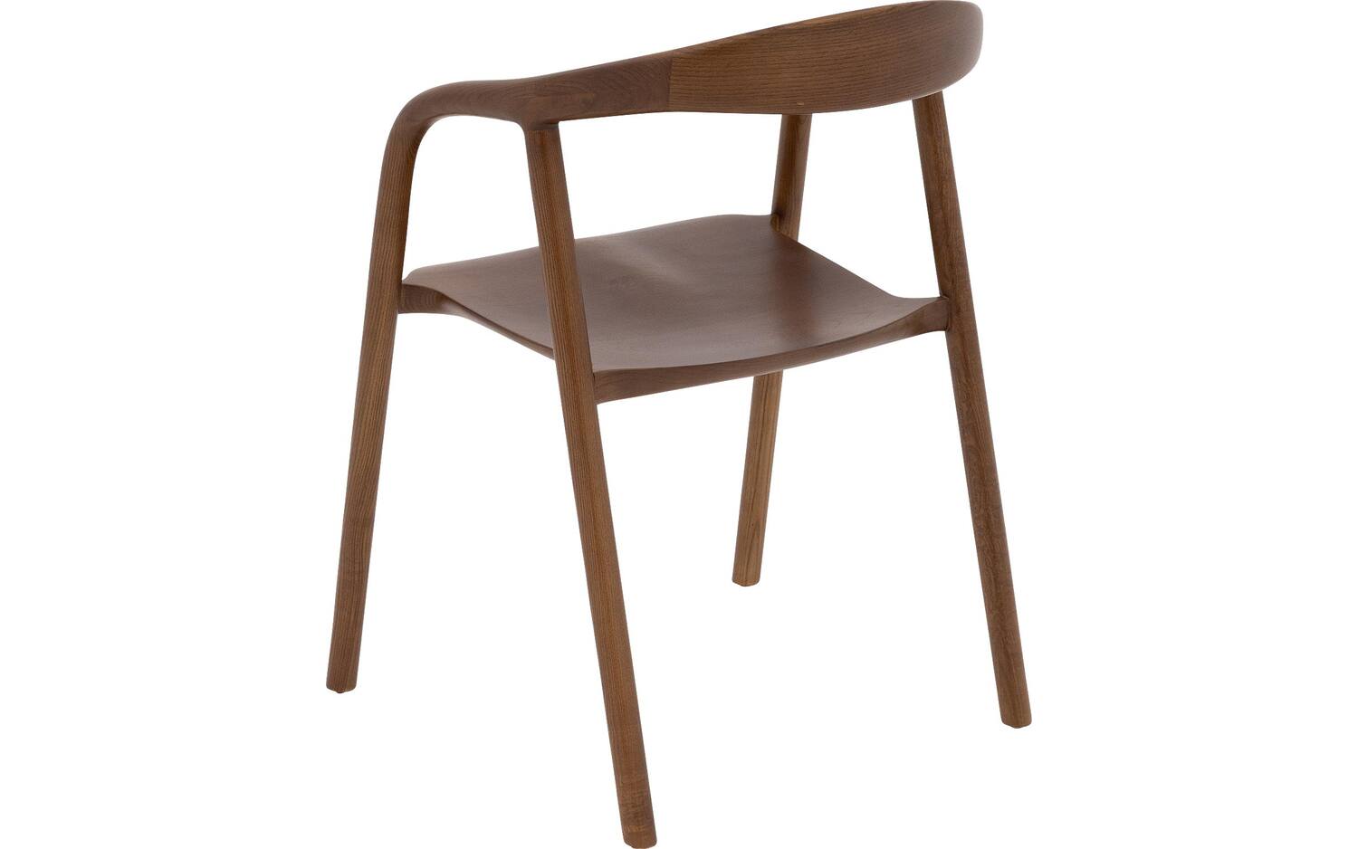 Deze houten eetkamerstoel biedt stevige ondersteuning dankzij de unieke zadelzit. De vormgeving zorgt voor een actieve en gezonde zithouding, terwijl de gebogen rugleuning en armleuningen extra comfort bieden tijdens lange tafelgesprekken.