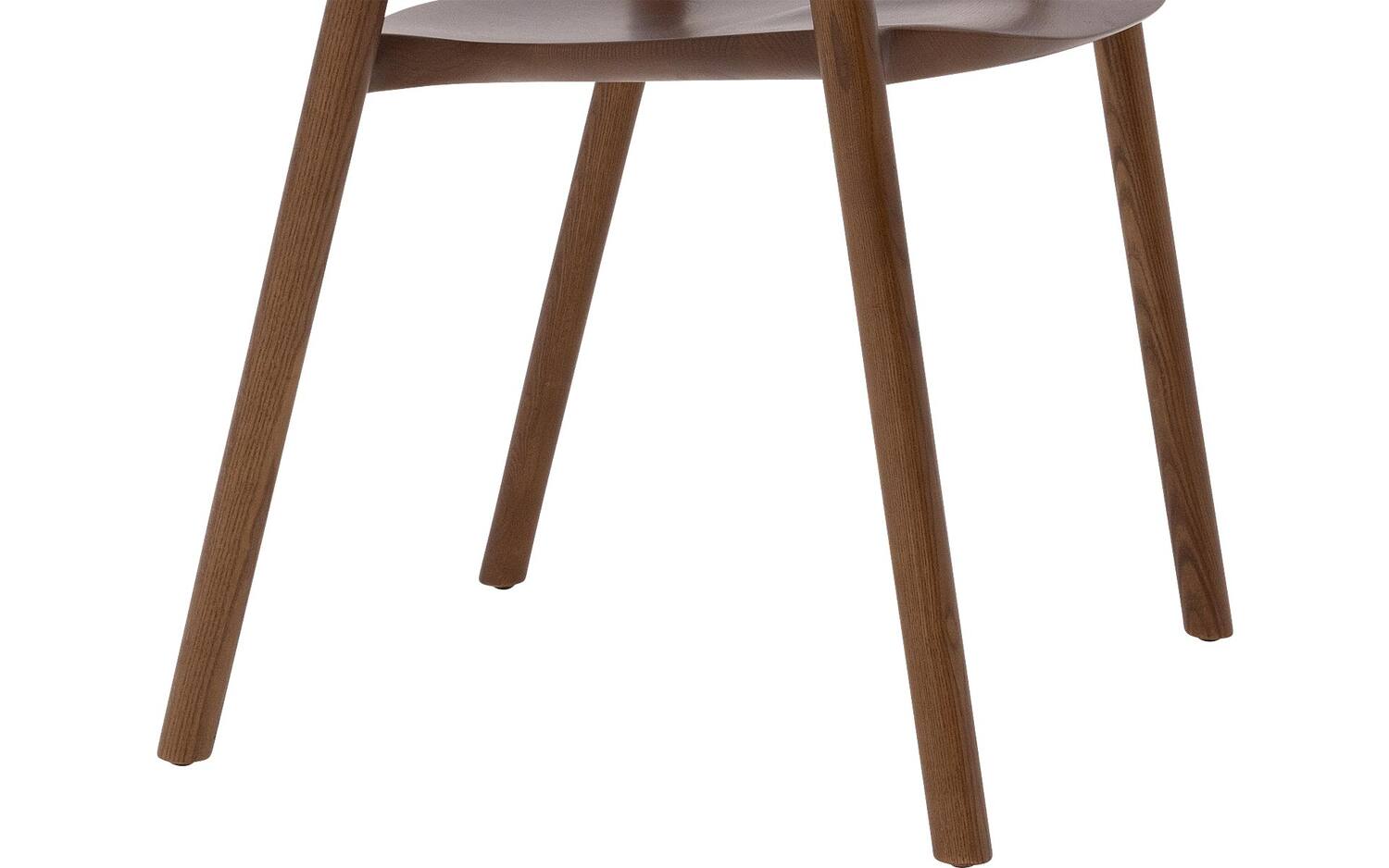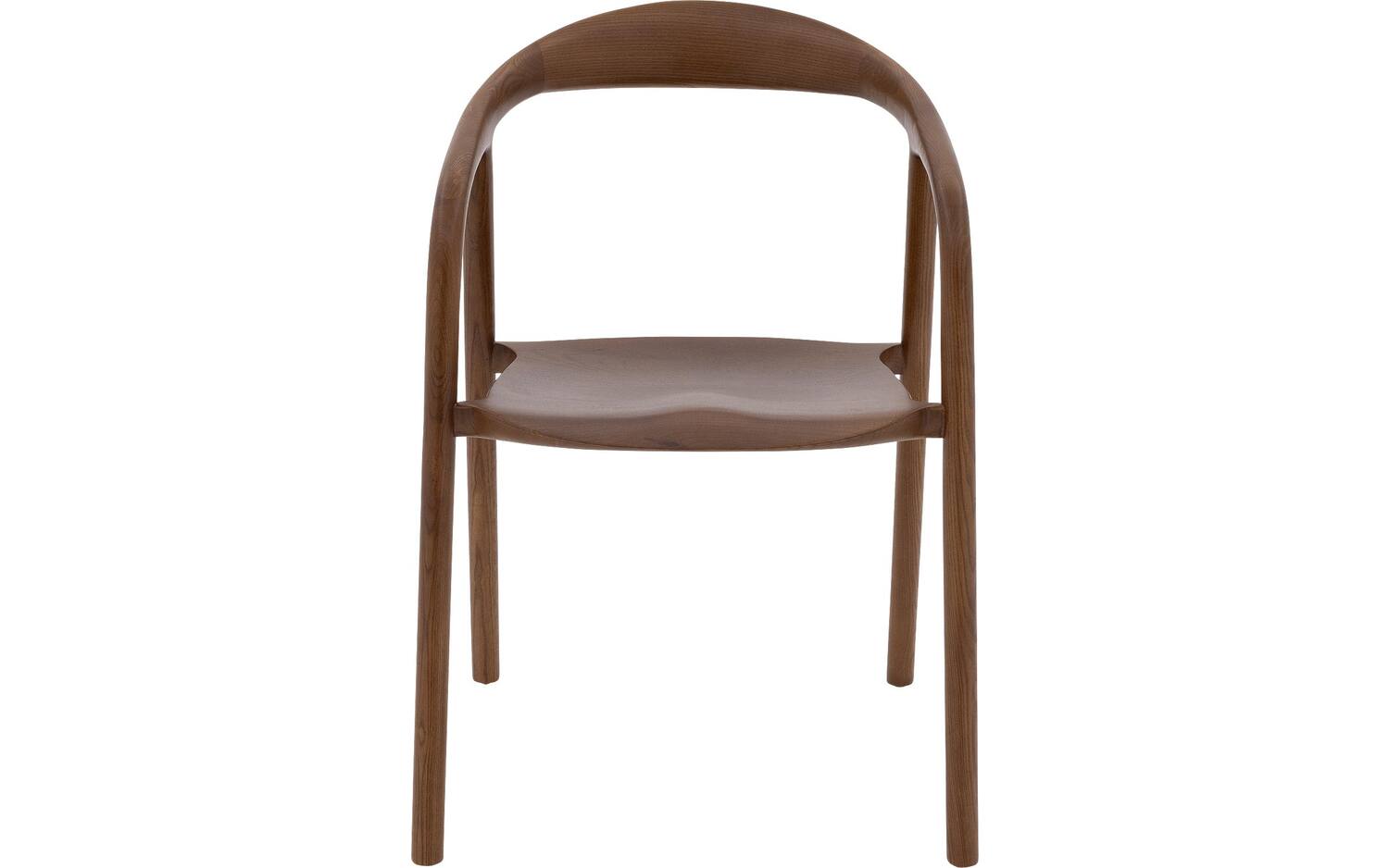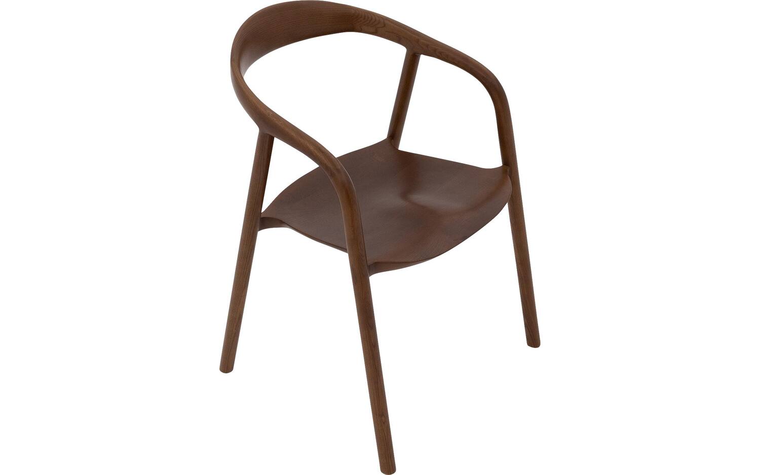 Deze houten eetkamerstoel biedt stevige ondersteuning dankzij de unieke zadelzit. De vormgeving zorgt voor een actieve en gezonde zithouding, terwijl de gebogen rugleuning en armleuningen extra comfort bieden tijdens lange tafelgesprekken.