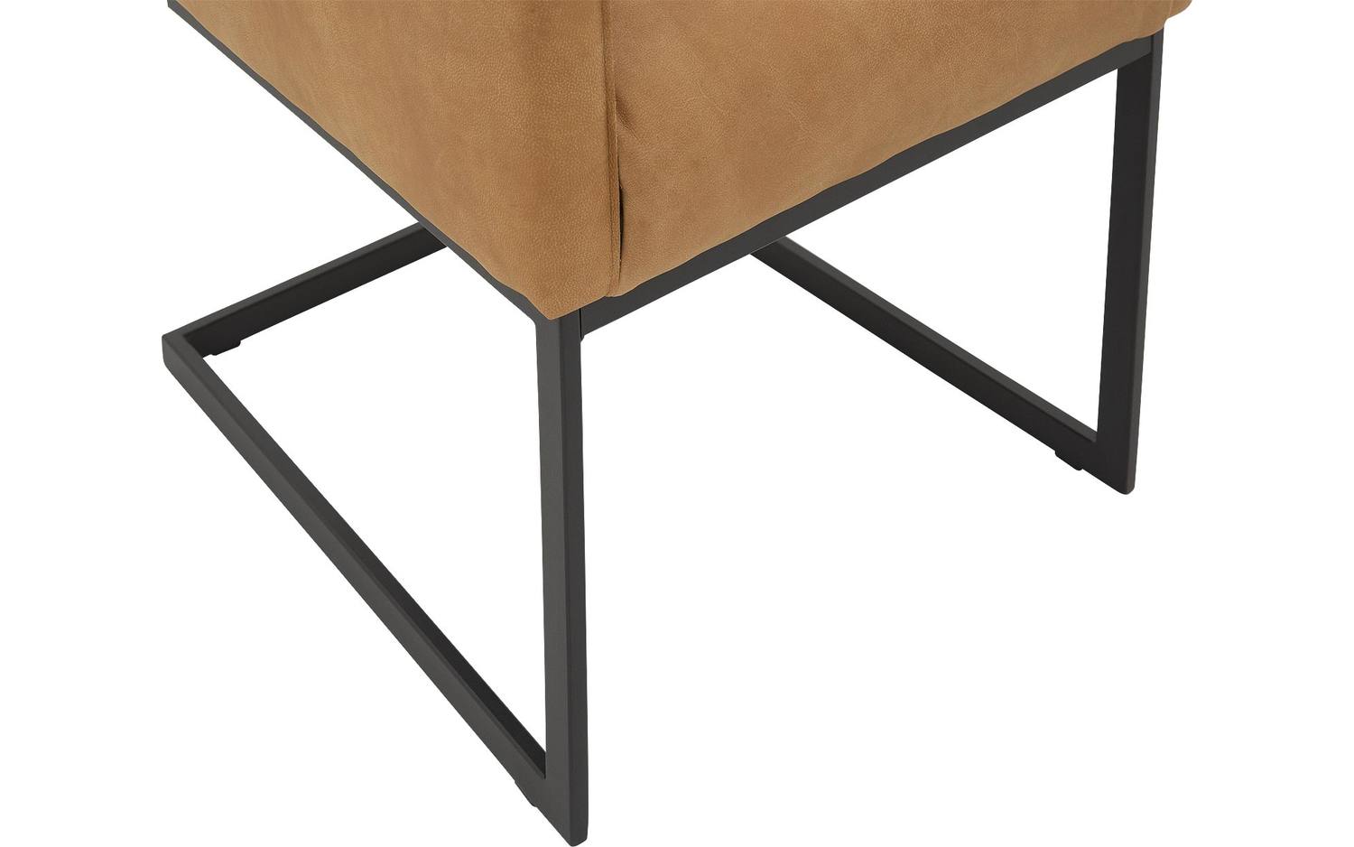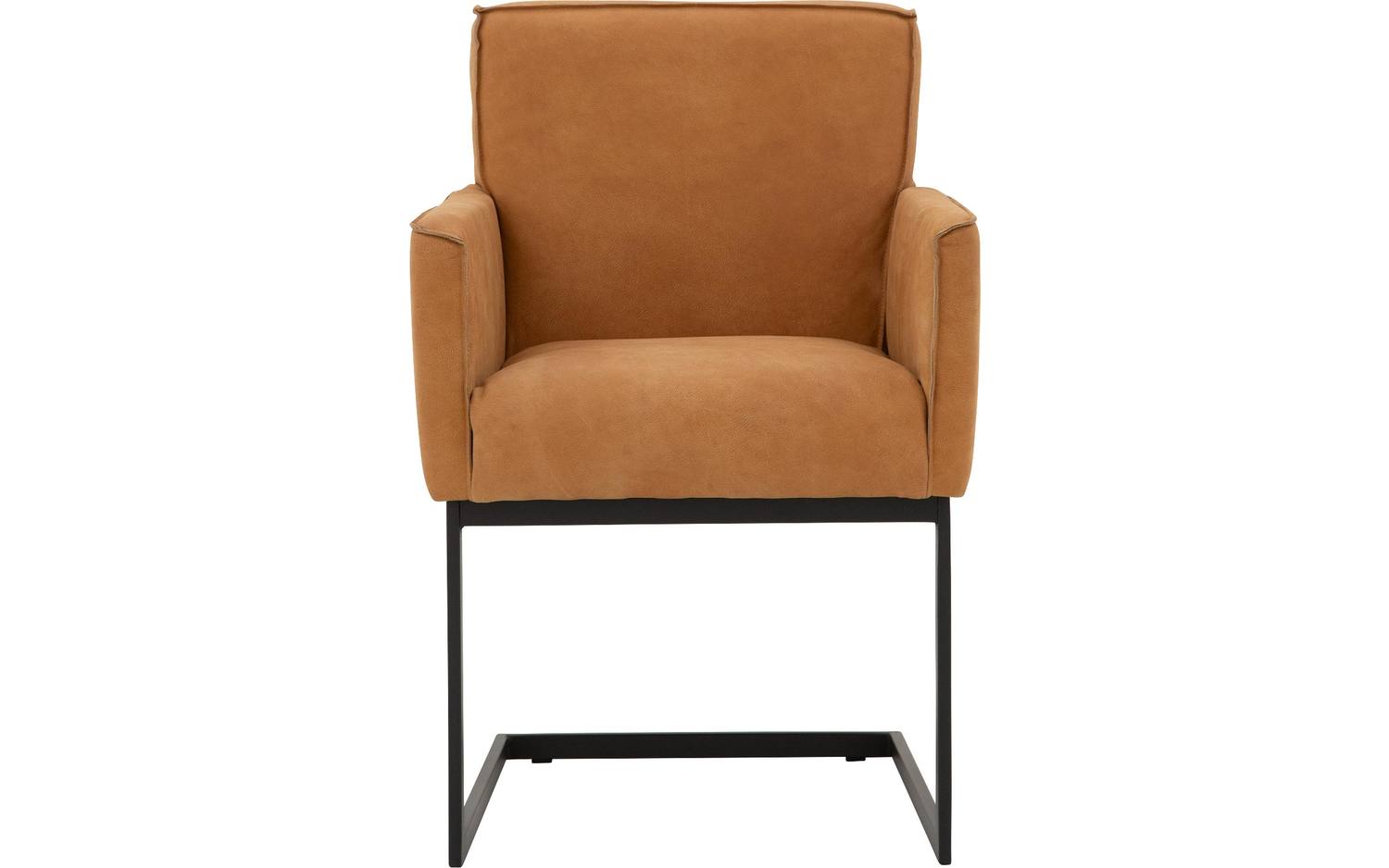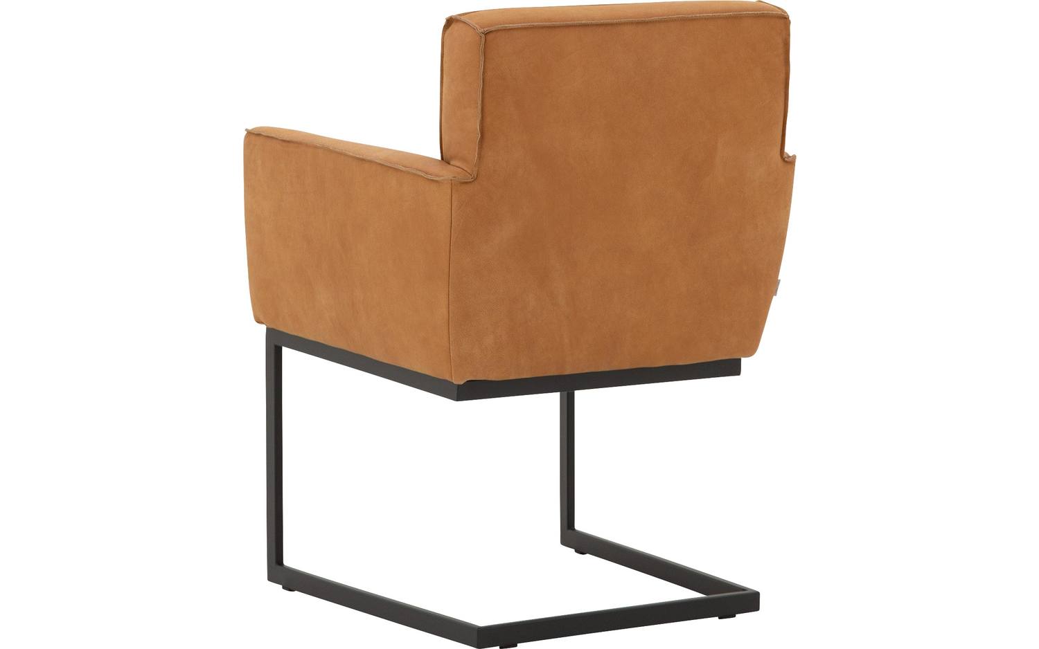Cognac leren eetkamerstoel Tom met armleuning biedt stoere industriële looks voor lange dineravonden. Het zachte buffalo leer in warme cognac kleur is afgewerkt met een sierlijke kapnaad en geeft deze eetkamerstoel een hoogwaardige uitstraling. De zwarte swingpoot maakt Tom tot een bijzondere verschijning aan jouw eettafel en zorgt tegelijk voor extra zitcomfort doordat de stoel licht meebeweegt met jouw bewegingen.
