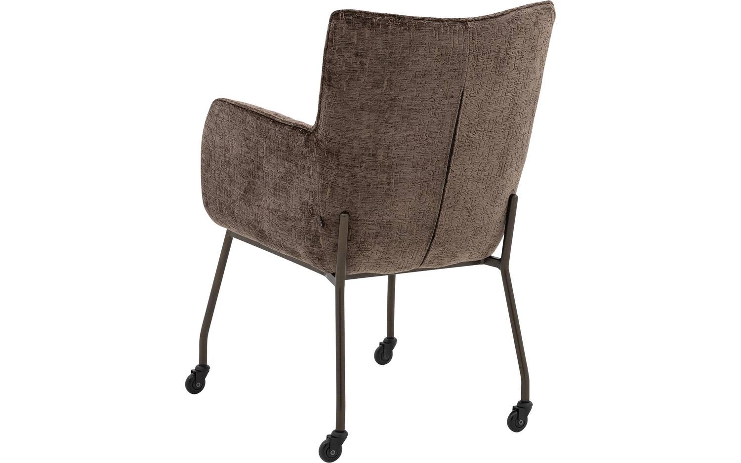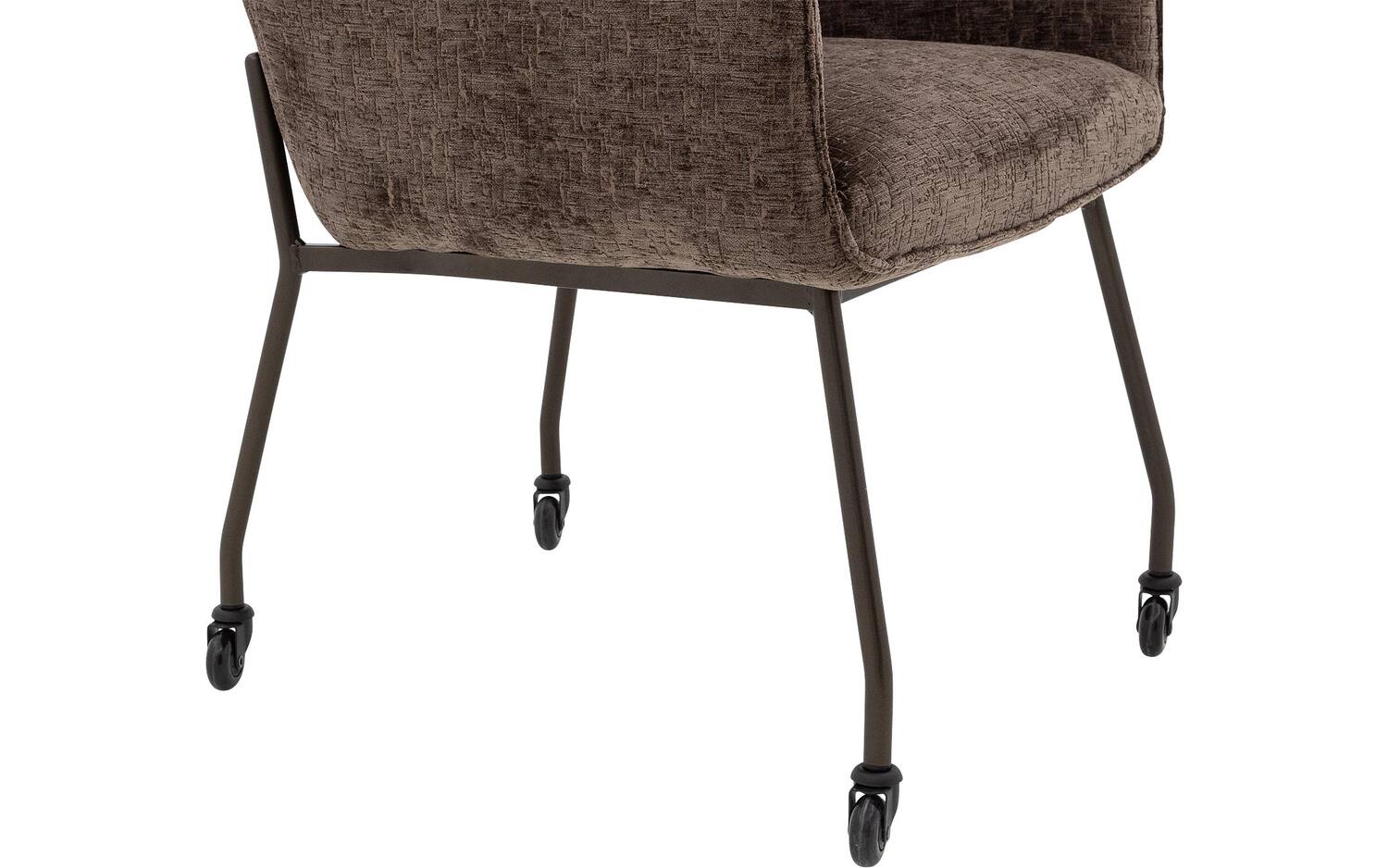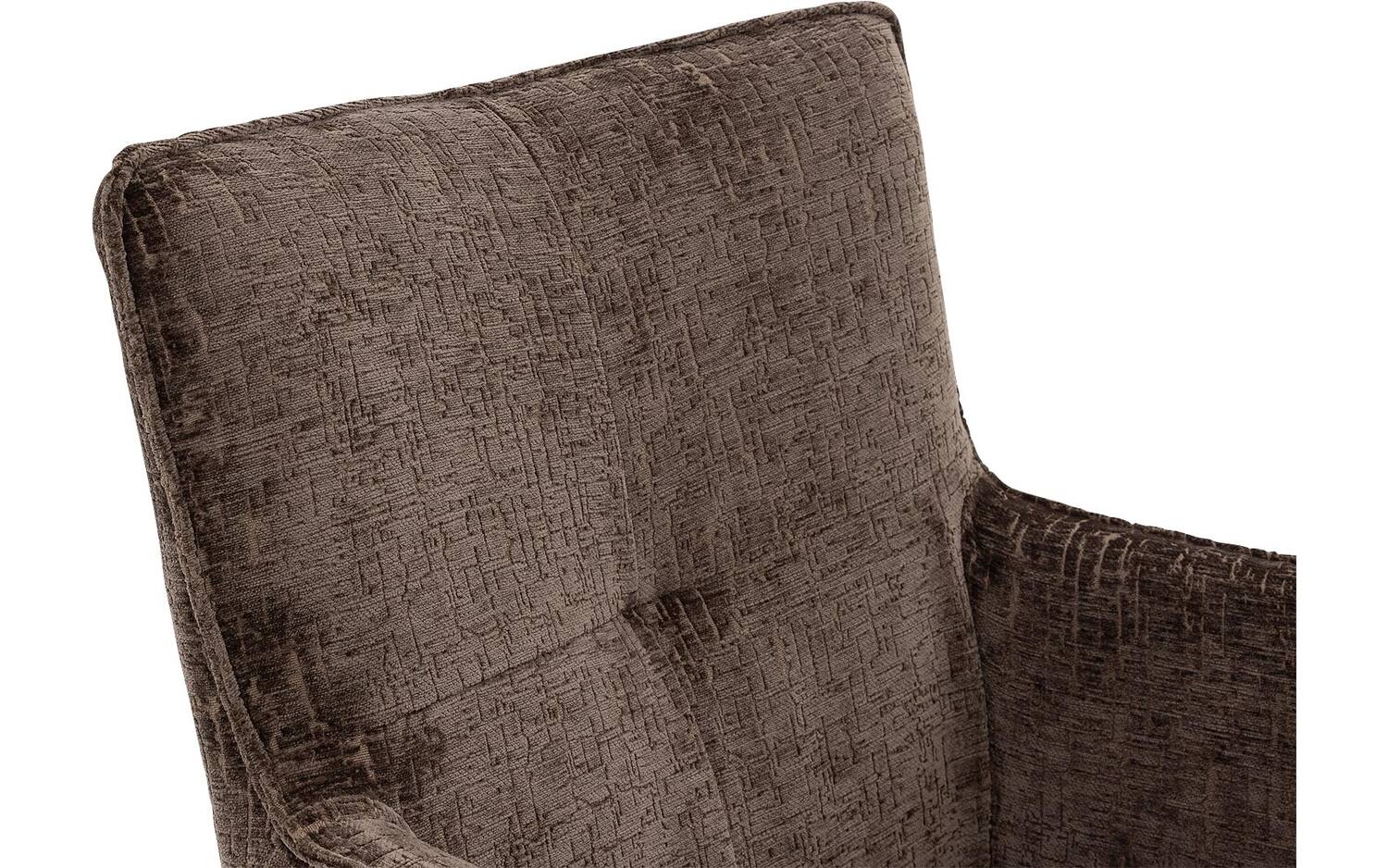 Stijlvolle details van deze bruine eetkamerstoel met armleuning