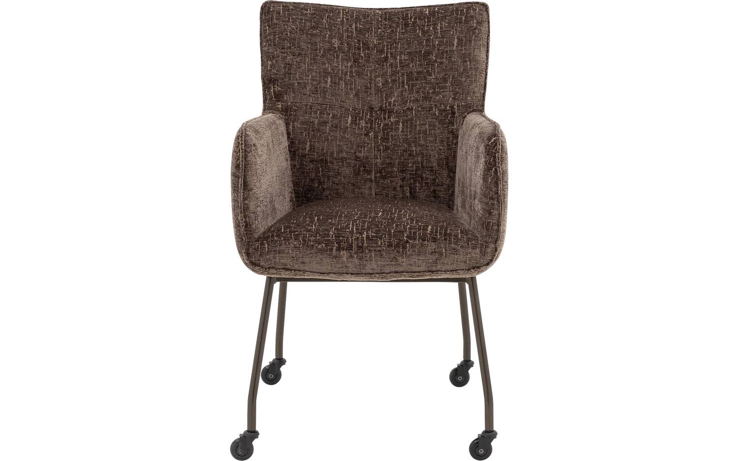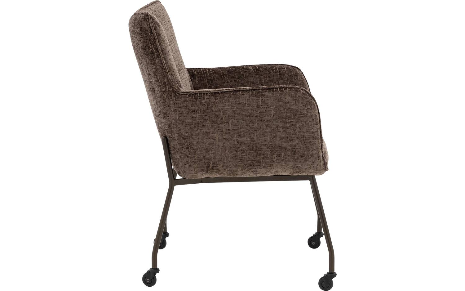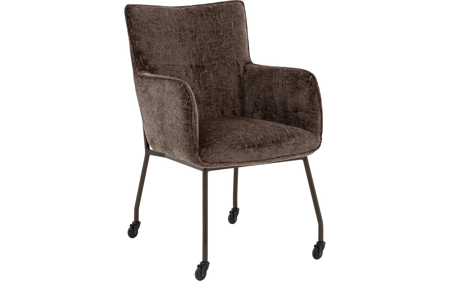 Stijlvolle details van deze bruine eetkamerstoel met armleuning