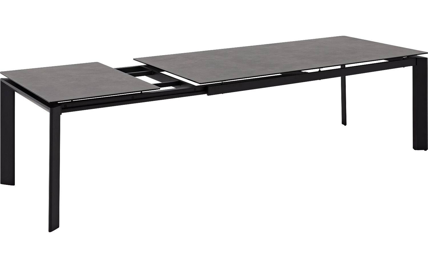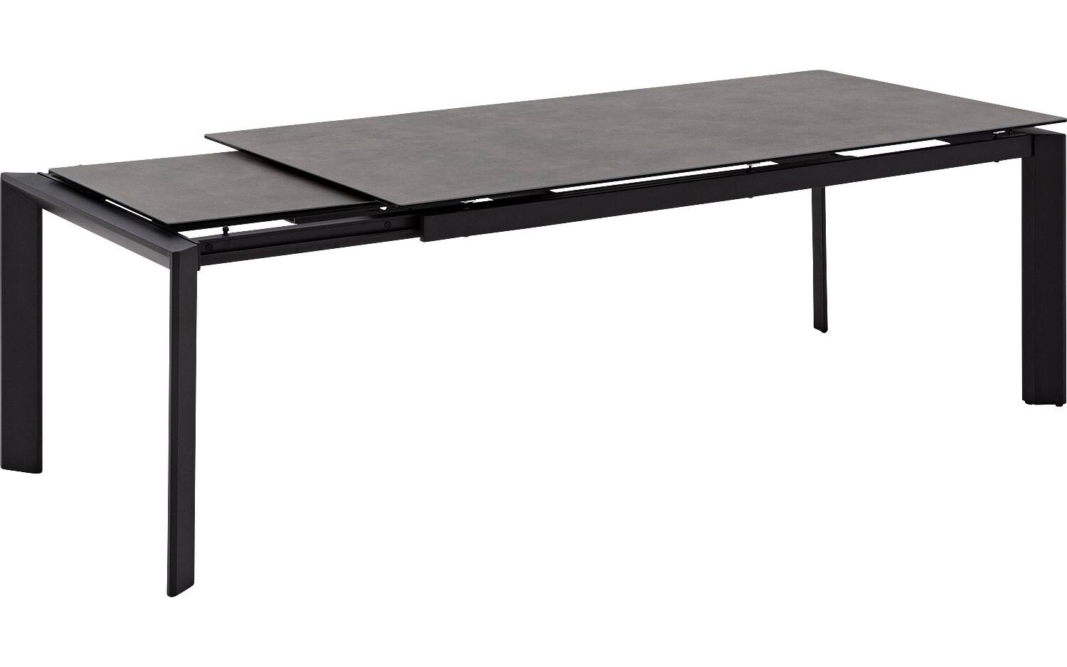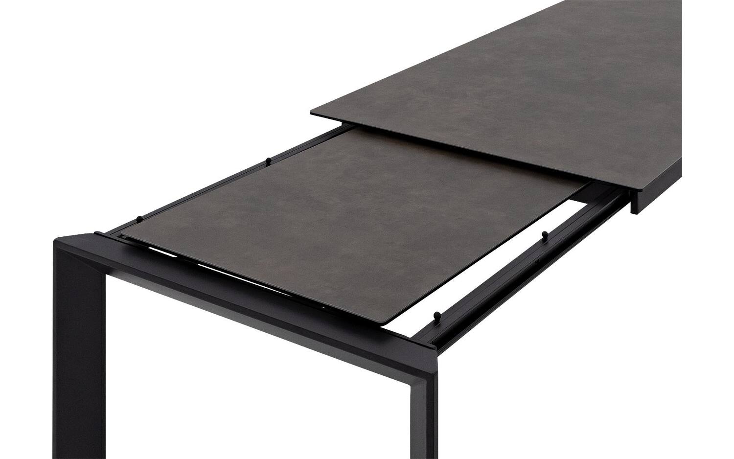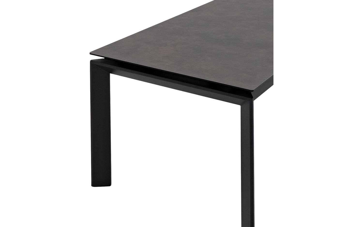 Het donkergrijze keramische tafelblad is krasbestendig en makkelijk schoon te maken. Het materiaal houdt zijn kleur mooi en is bestand tegen dagelijks gebruik. De strakke randafwerking geeft het blad een verfijnde uitstraling.