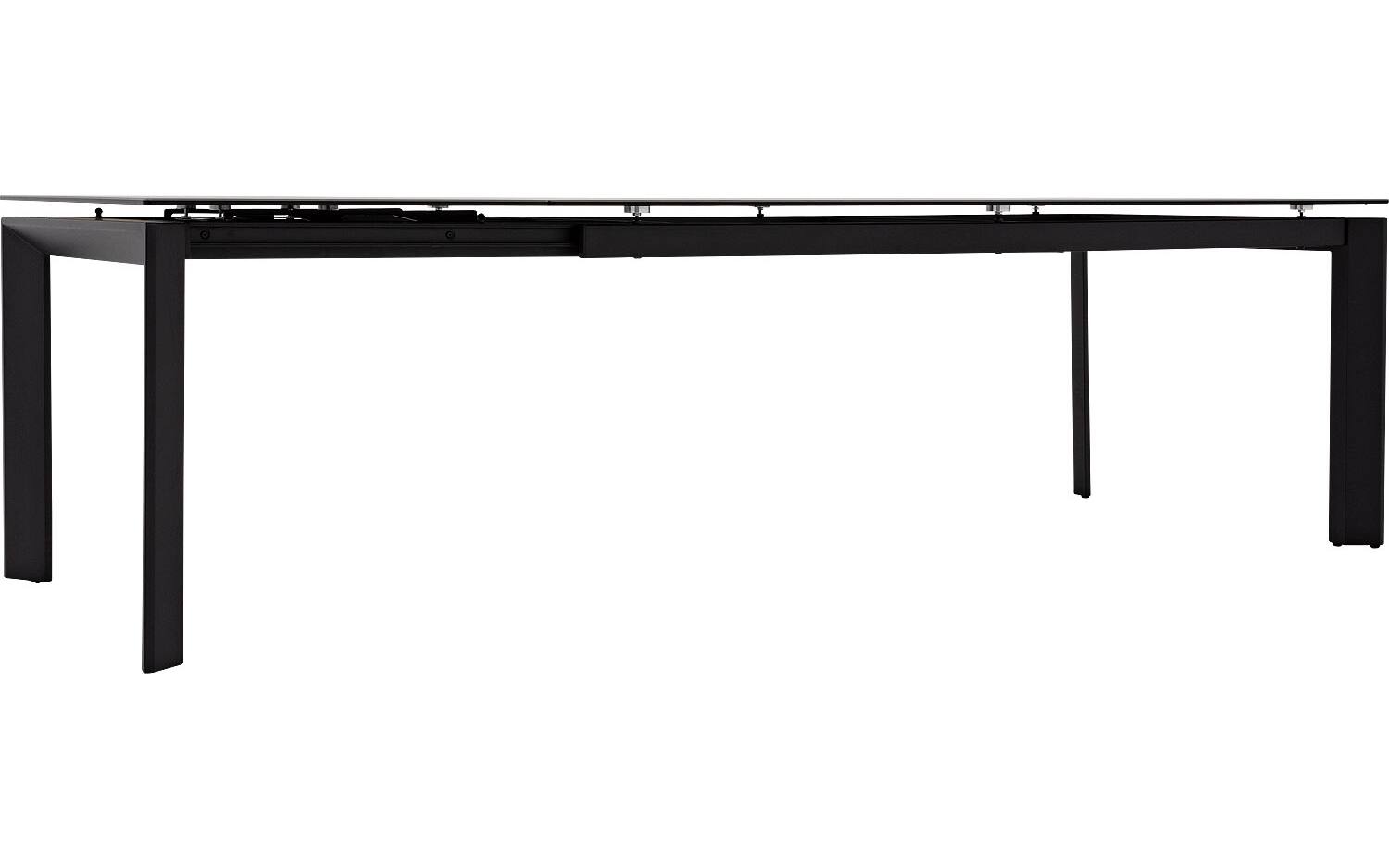Het onderstel bestaat uit een centrale rechthoekige poot van zwart metaal. Deze constructie zorgt voor maximale beenruimte rondom de tafel en geeft een moderne, opgeruimde look aan je eetkamer.